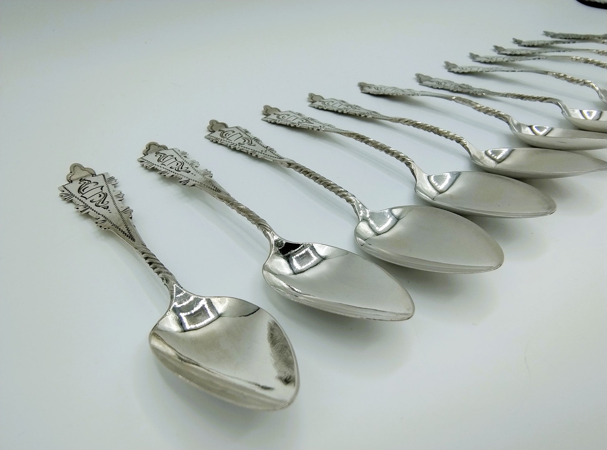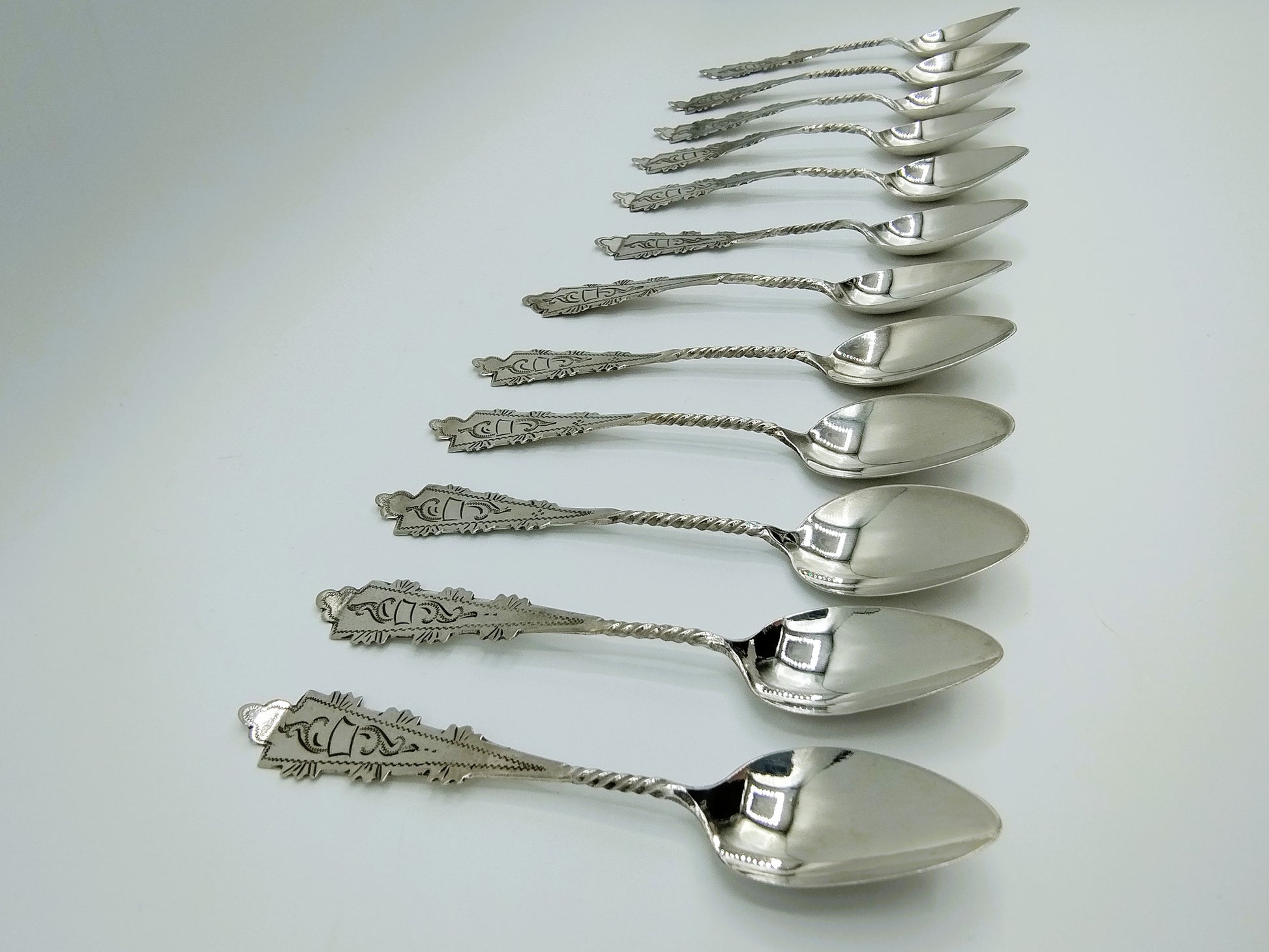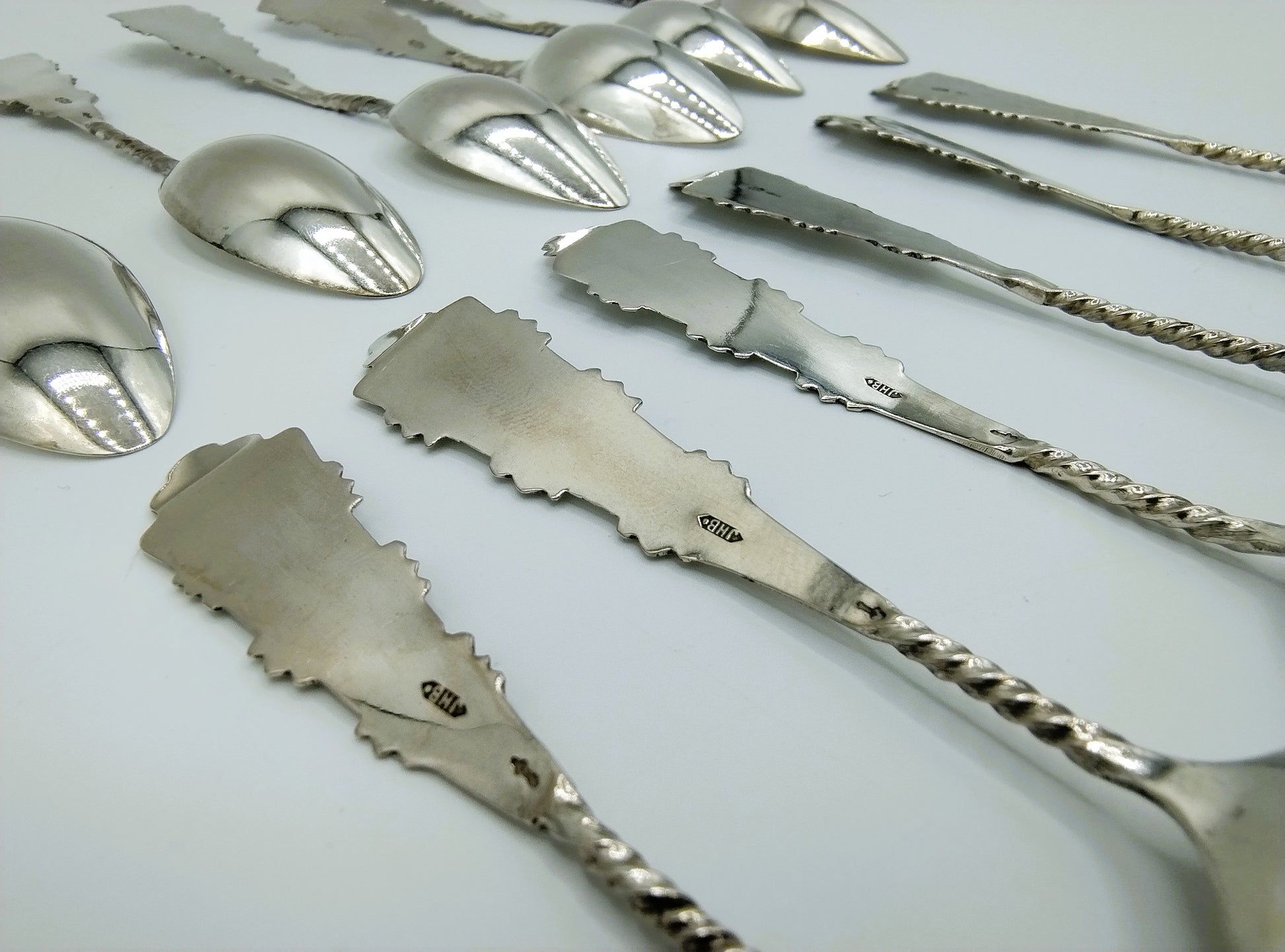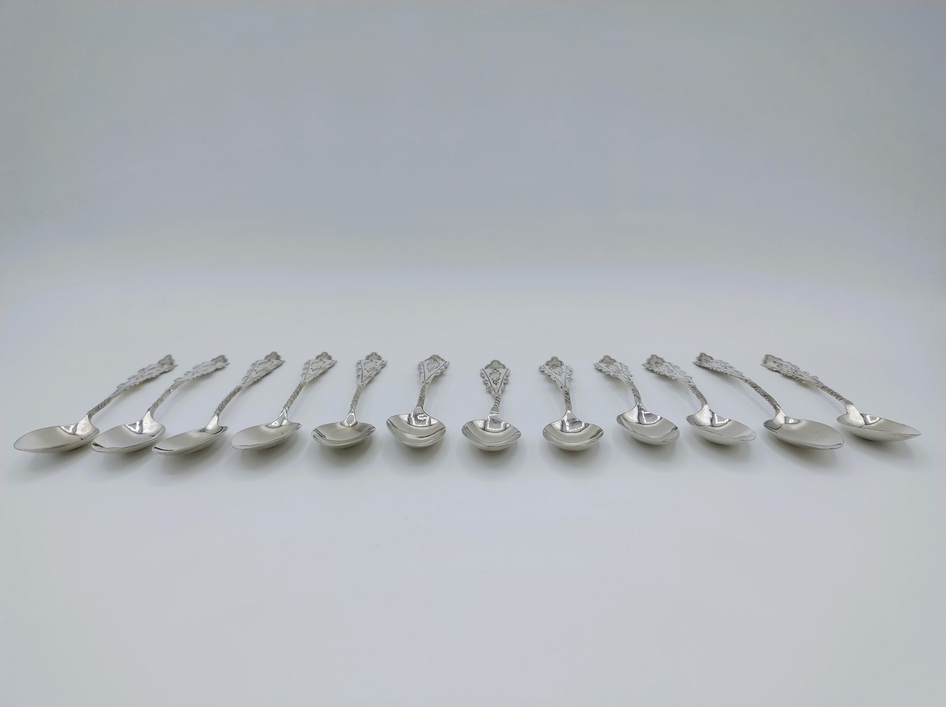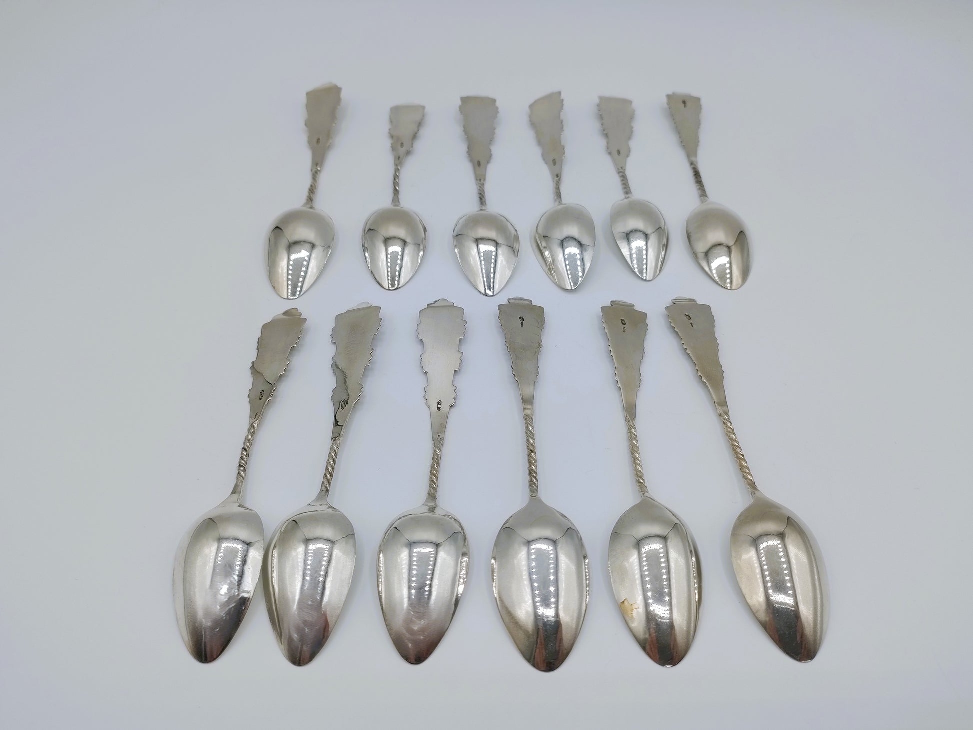 Set of 12 silver teaspoons made by the silversmith G. Huisman from Amsterdam, active from 1884 and fa. G. vd Berg & Zn from Schoonhoven, active from 1922 to 1945.