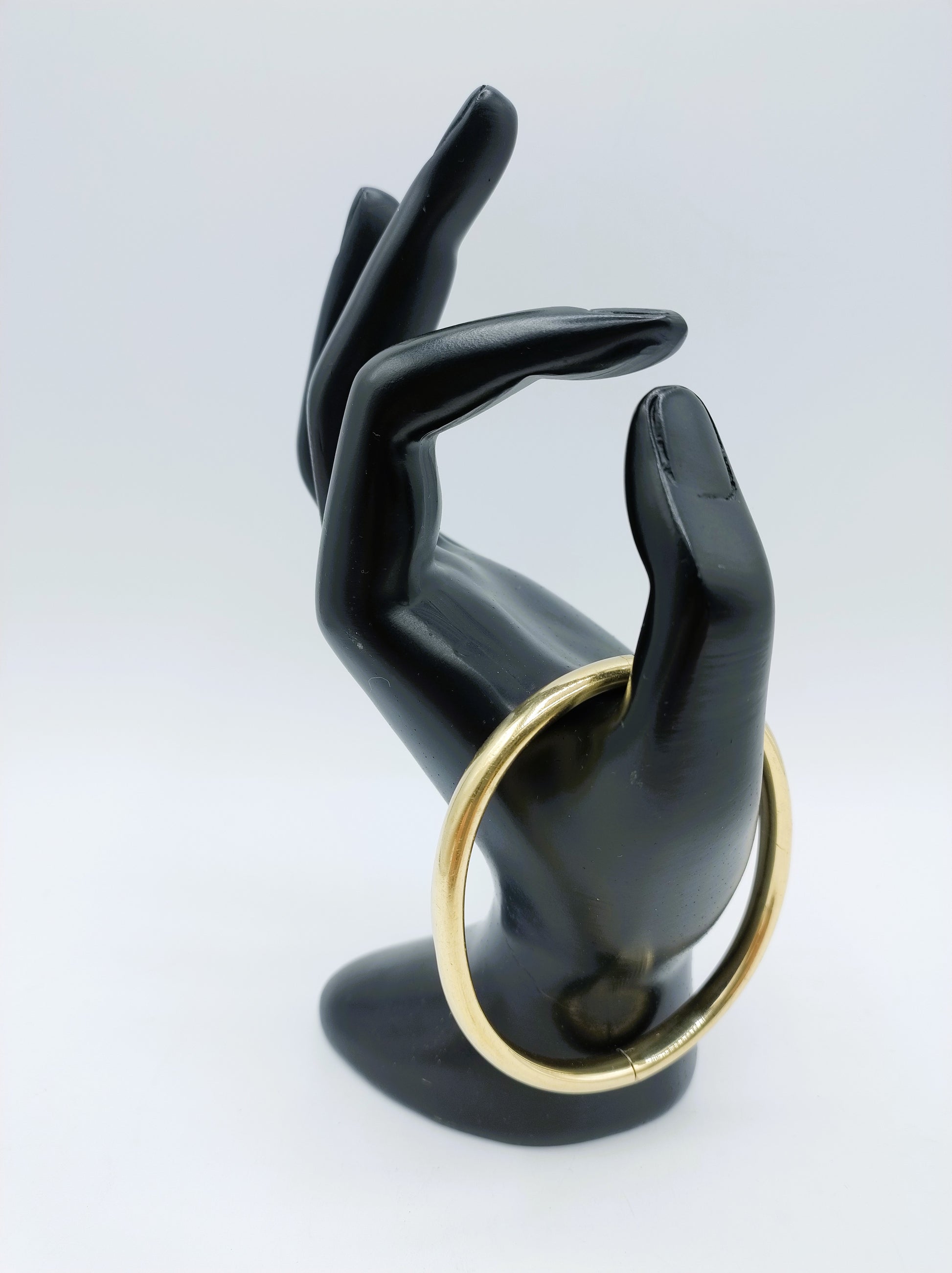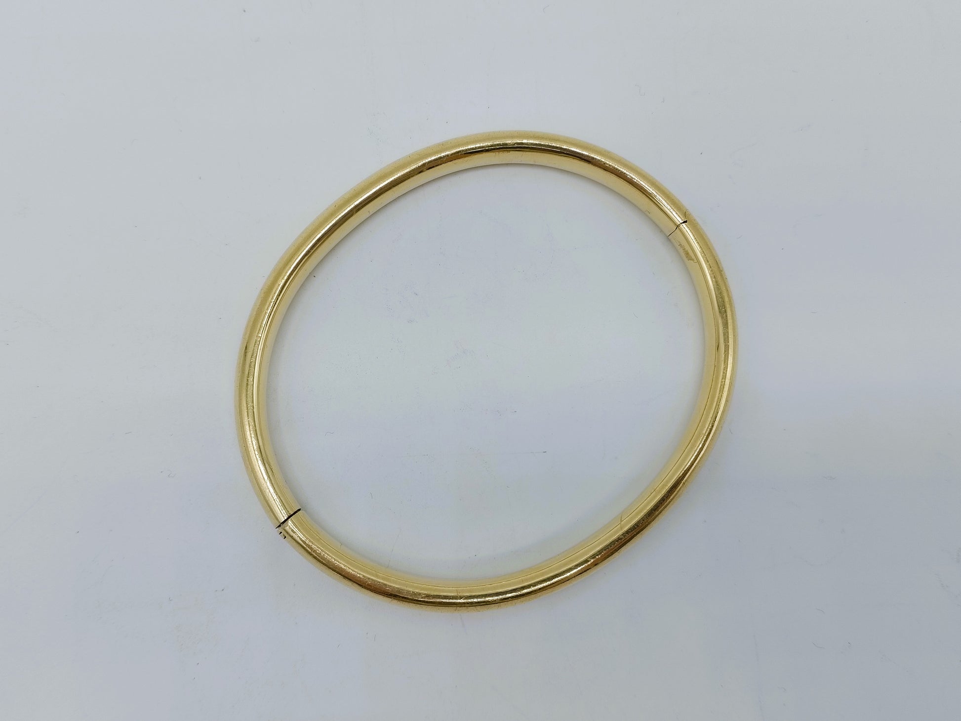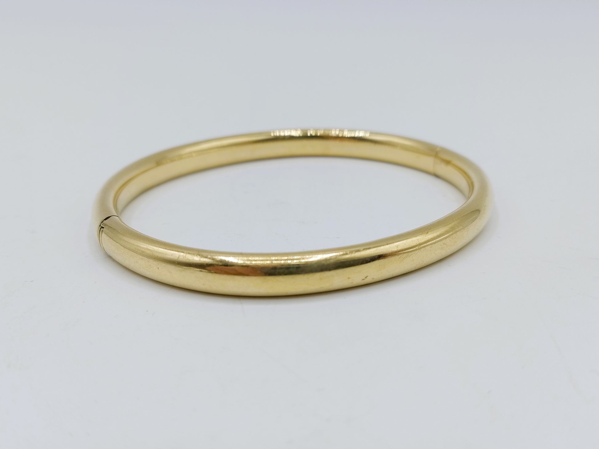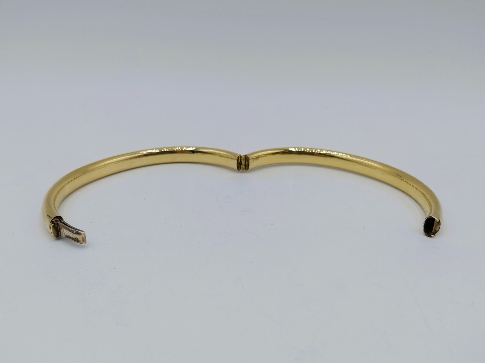 14 carat gold bangle or slave bracelet with a hinged closure. The slave bracelet is made of solid gold with a silver core underneath. This makes the bracelet extra sturdy, but at a sharper price.