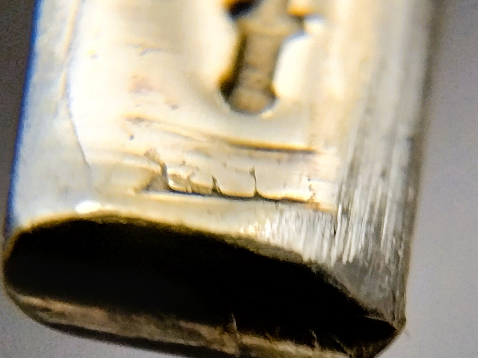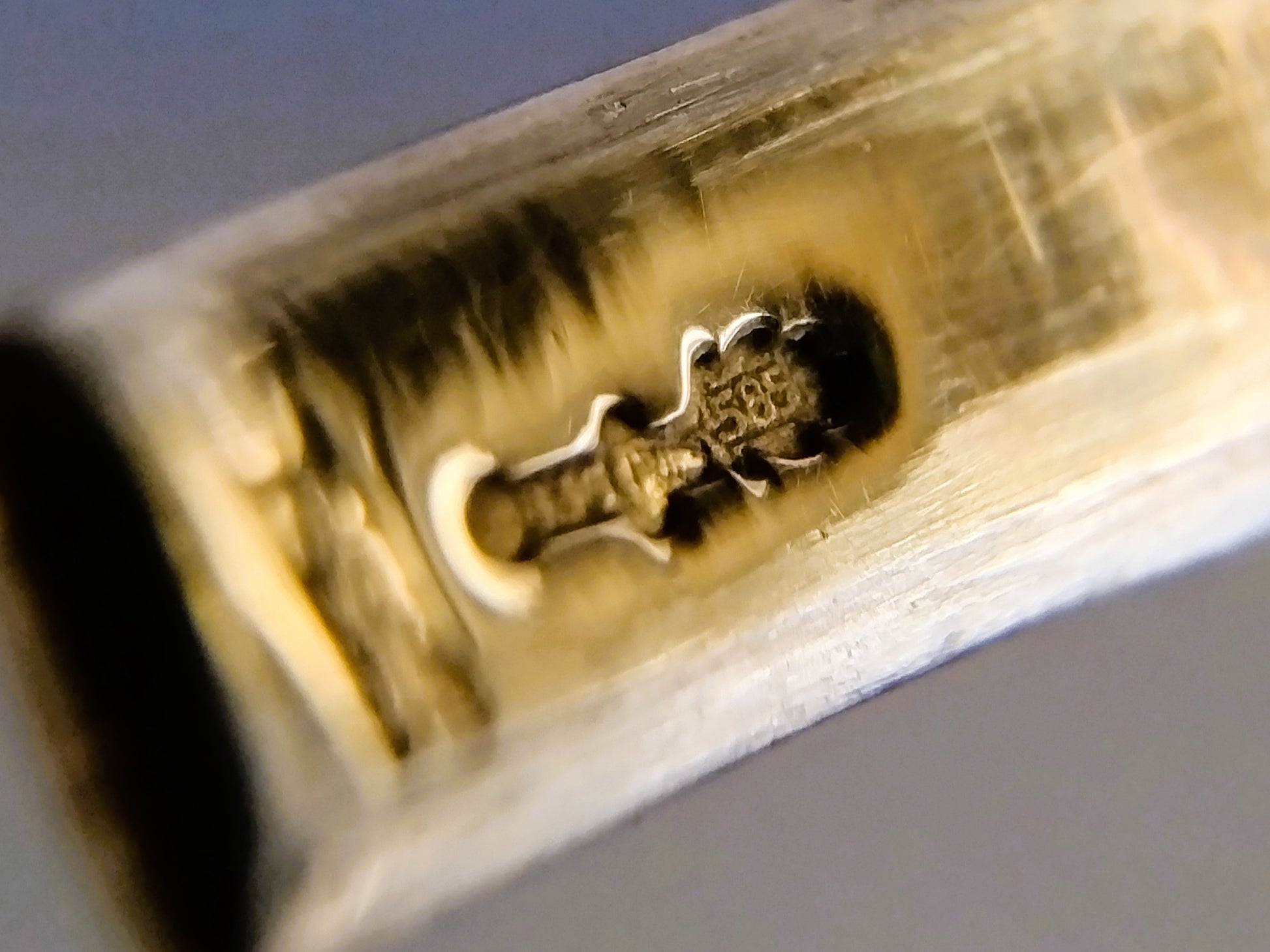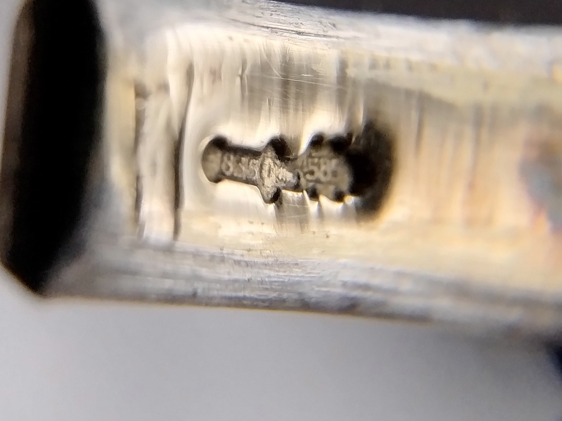 Hallmarked with 585 for 14 carat gold and 835 for 2nd grade silver. Finally hallmarked with a difficult to read master hallmark.