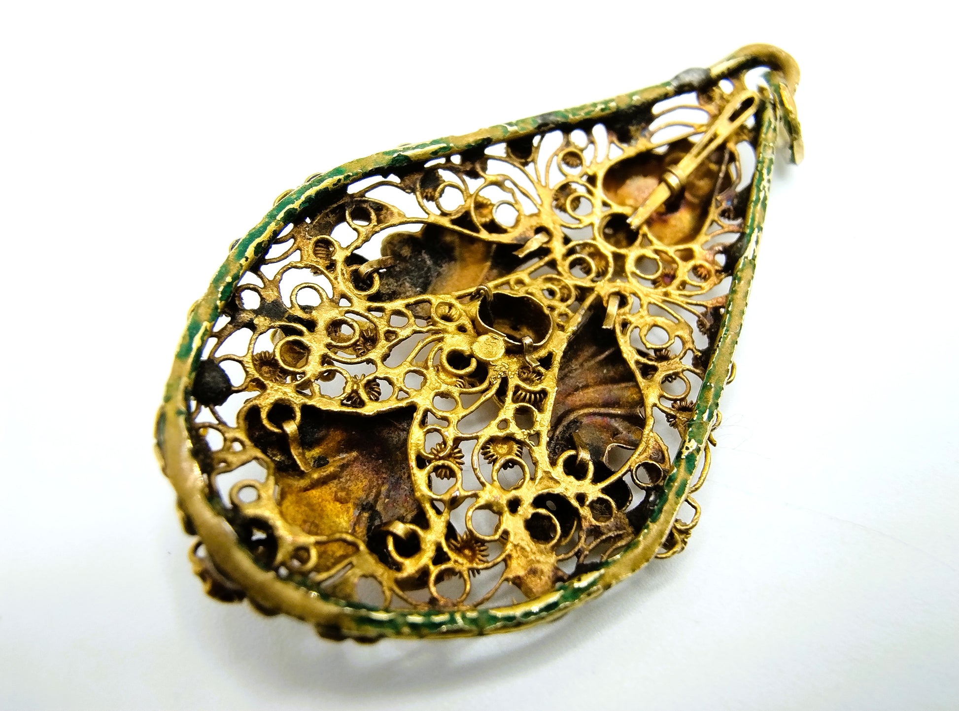 The front of the pendant is 14 carat gold (tested). The framework on the back is non-precious.