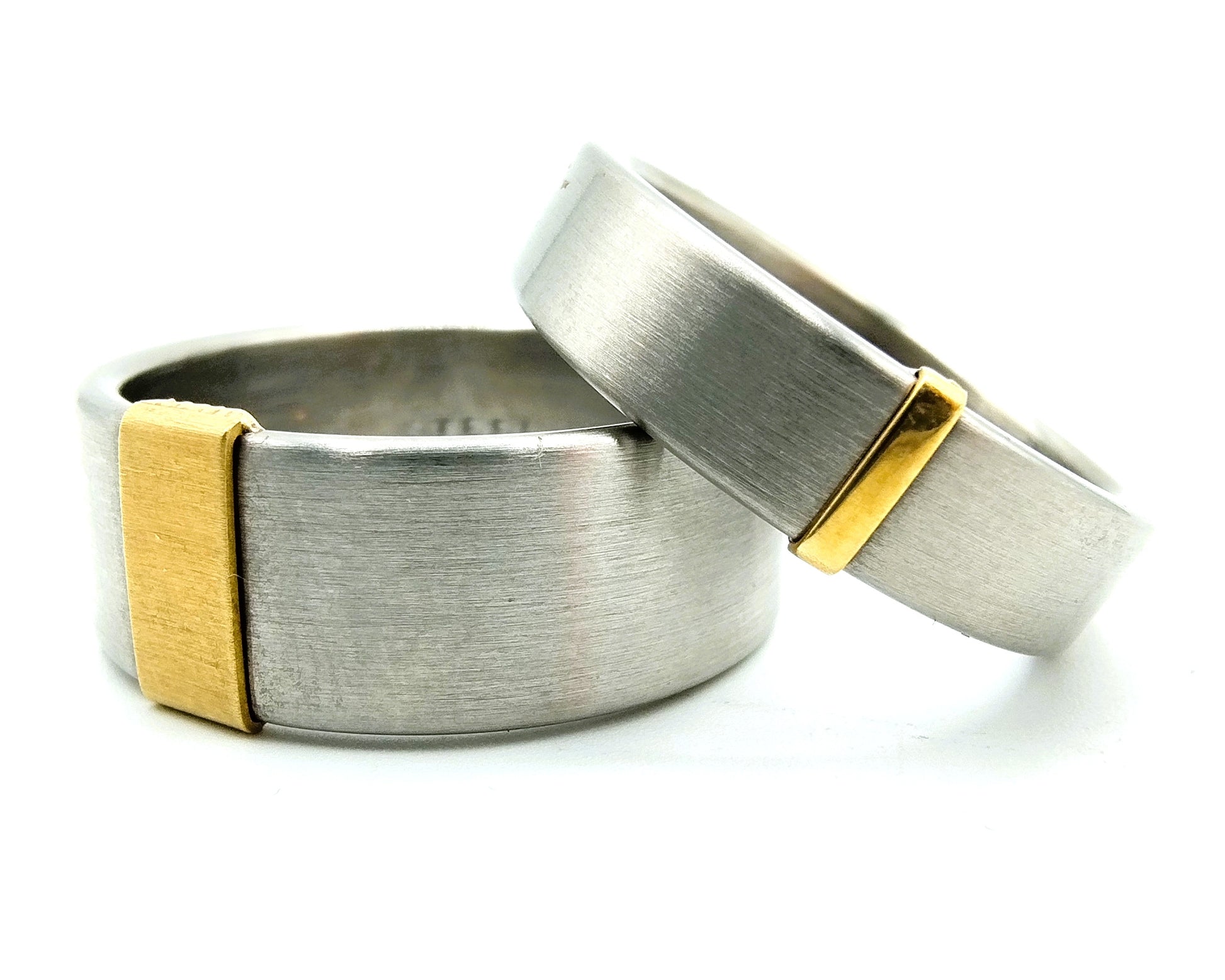 2 Steel rings with gold application, 585, 18.5 and 20 mm