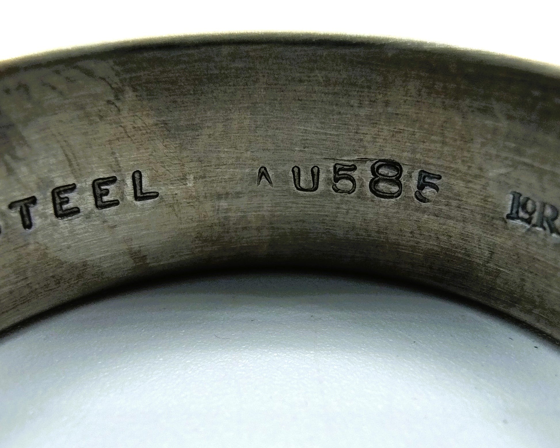 The largest ring is hallmarked: Steel, au 585, and Lor. The smallest ring is not hallmarked.