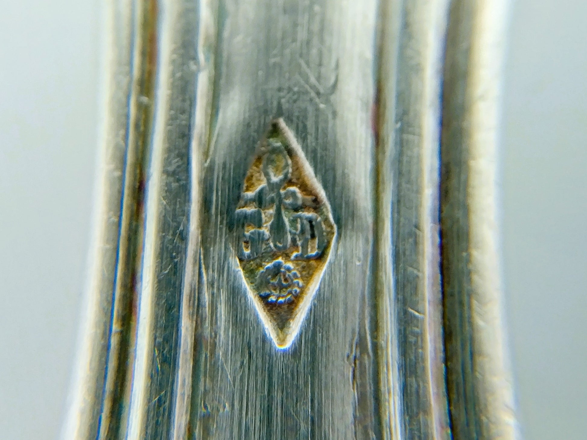 A silver fork is hallmarked with the master mark of Pierre Queille from Paris. This silversmith was active from 1834-1846.