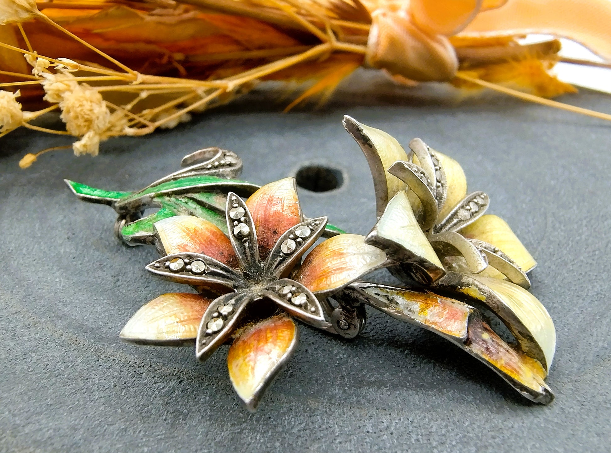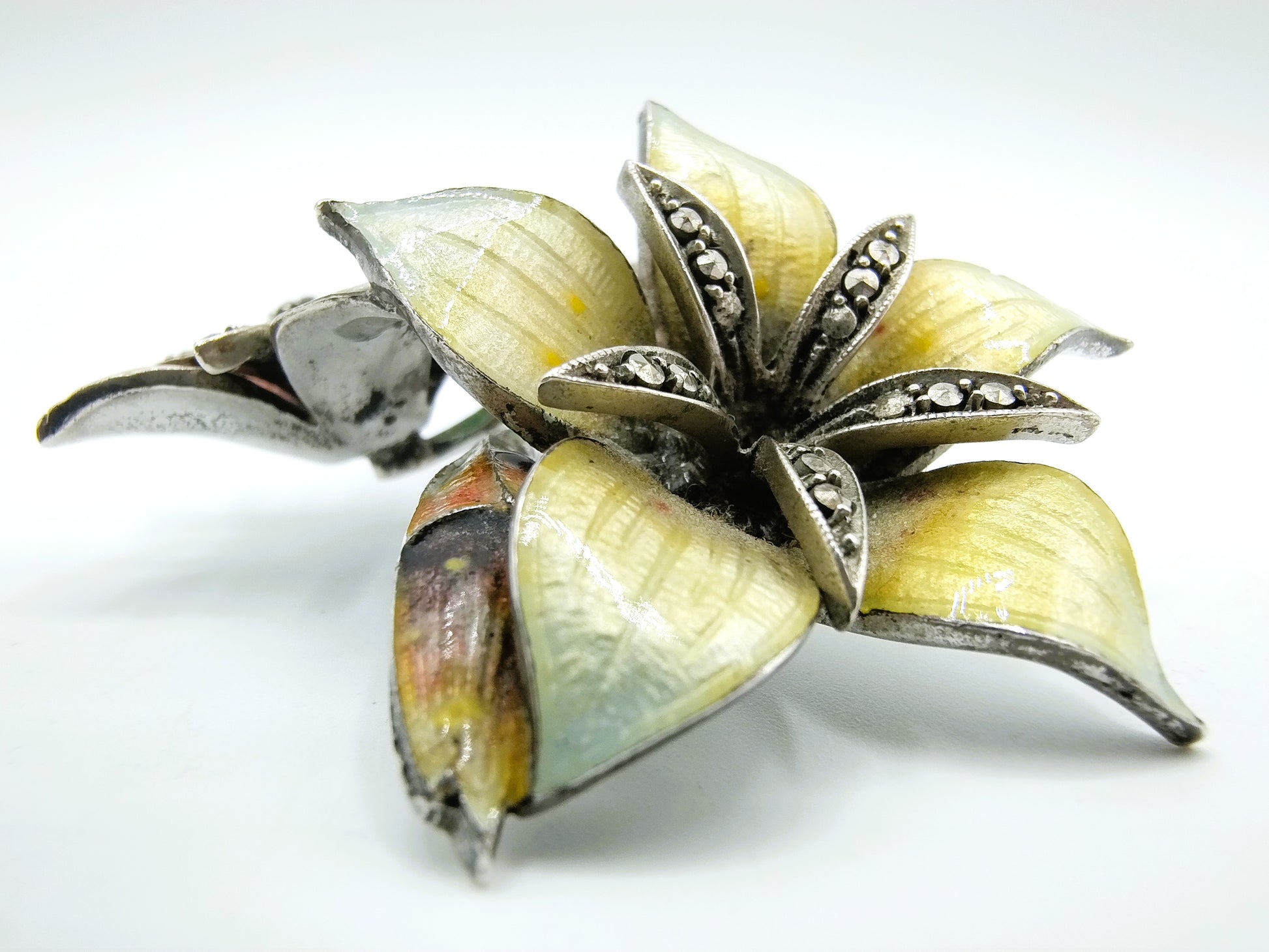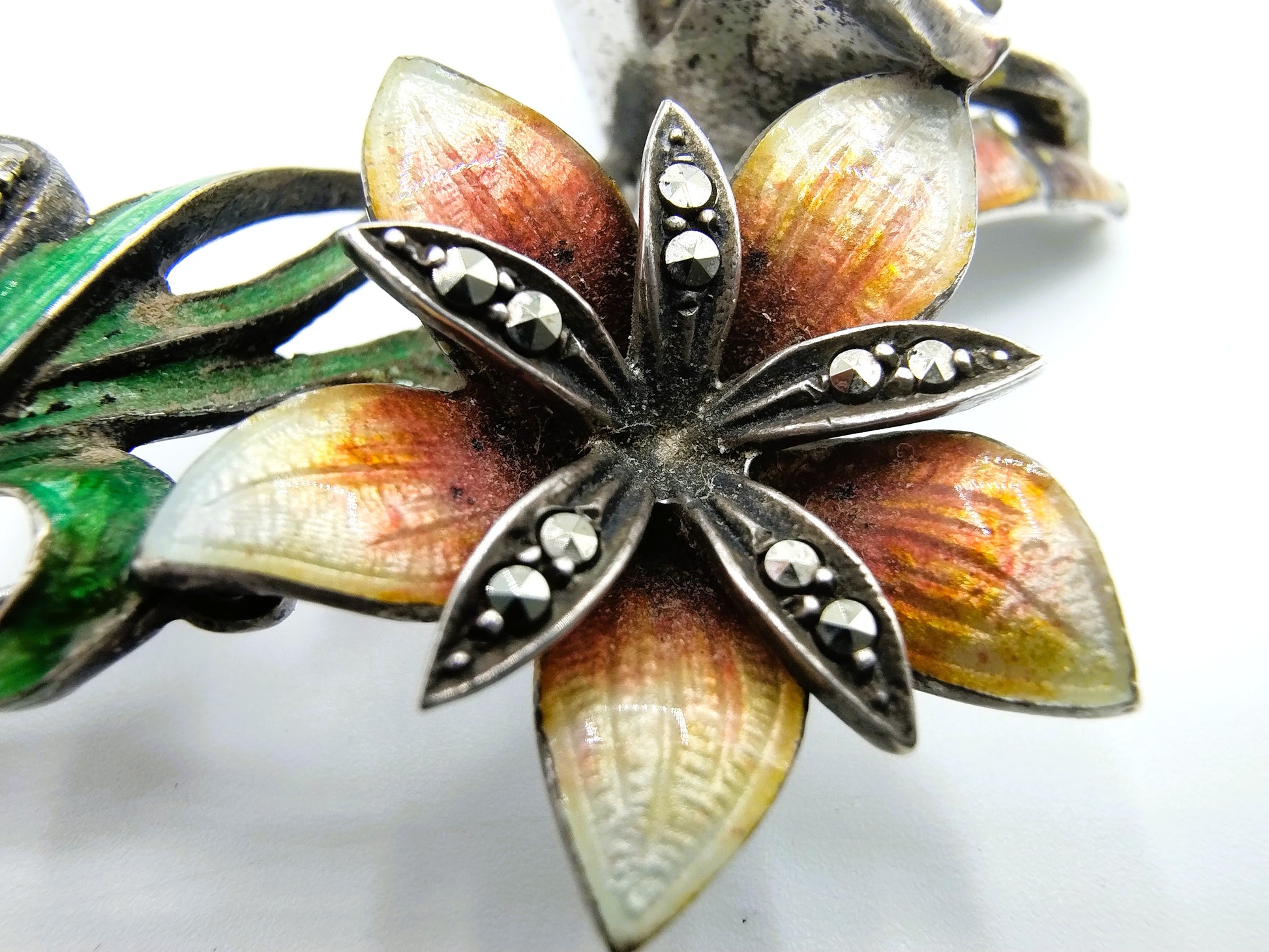 Beautiful Art Nouveau flower brooch made of silver, enamelled and with marcasites.
