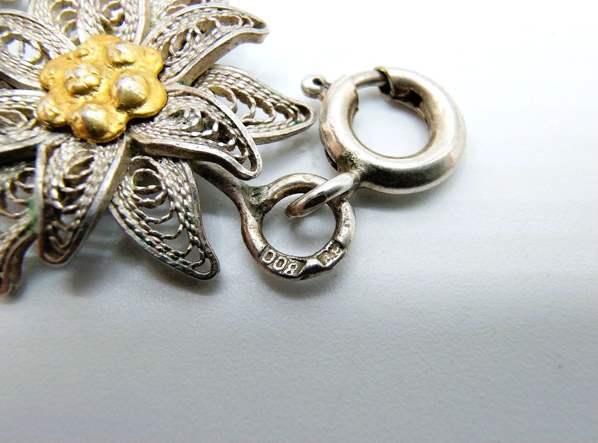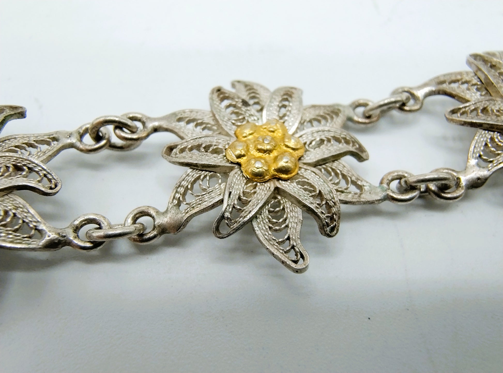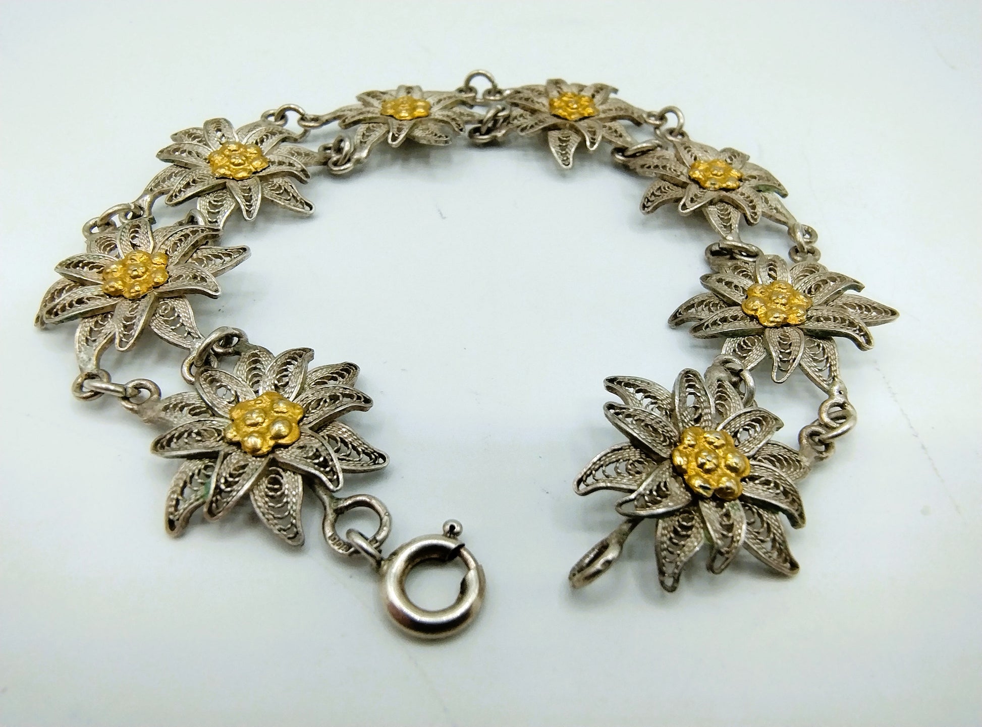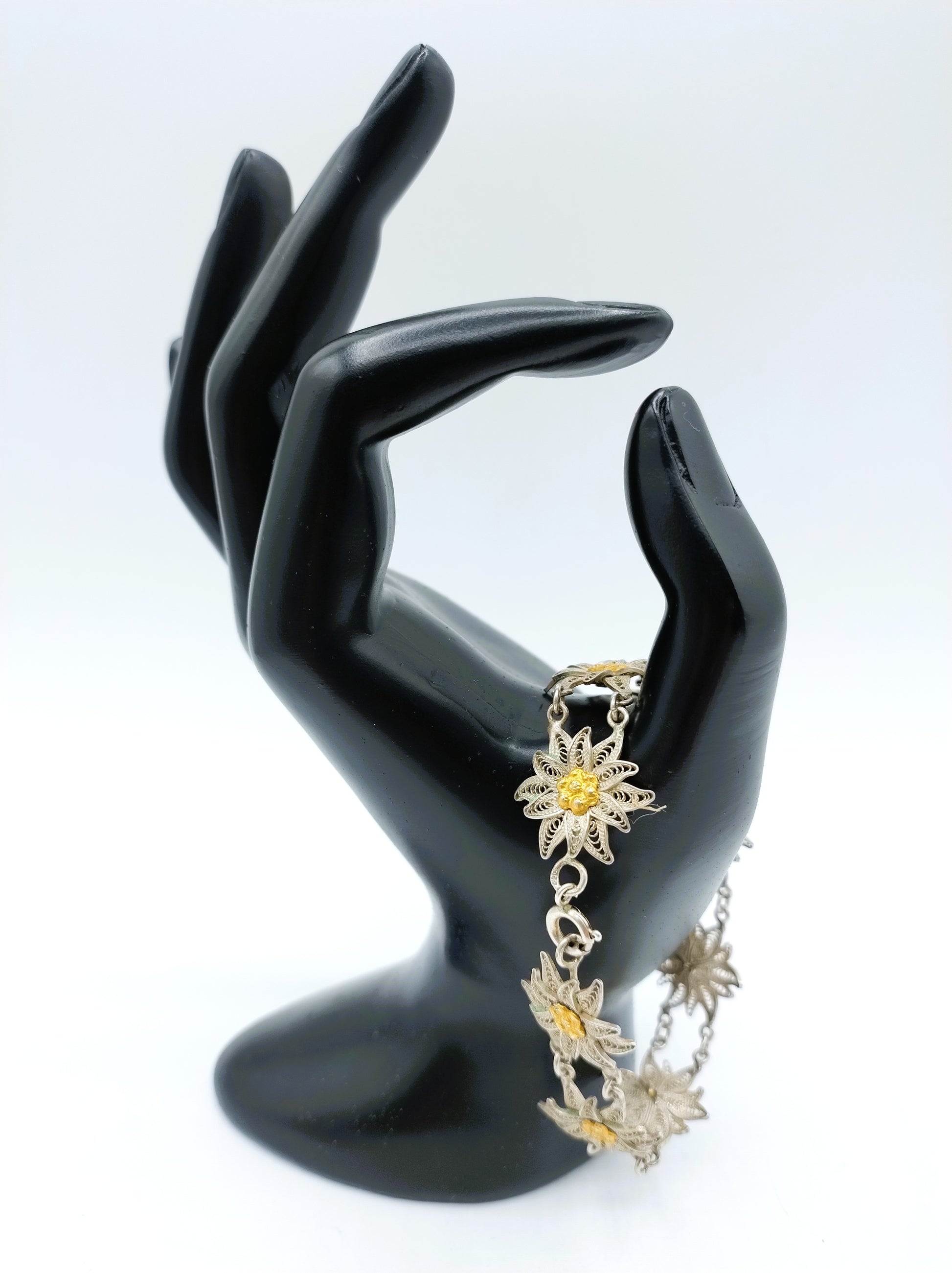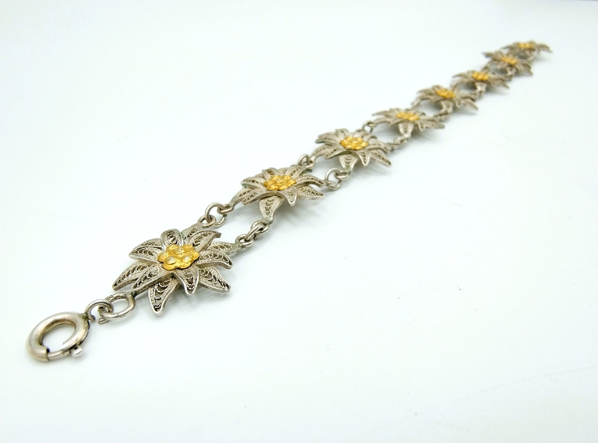 Filigree silver bracelet with gold-plated flowers, 20 cm.