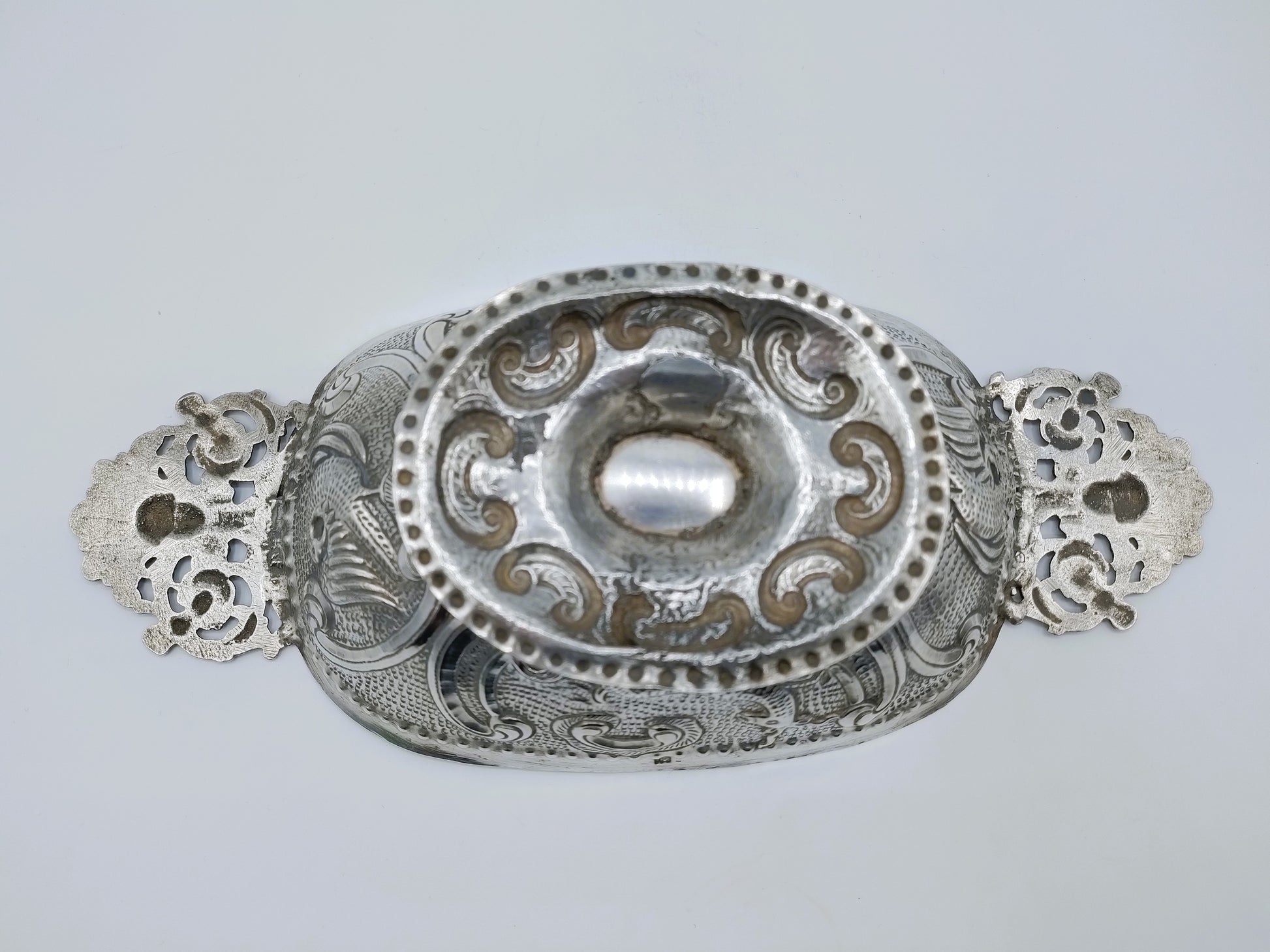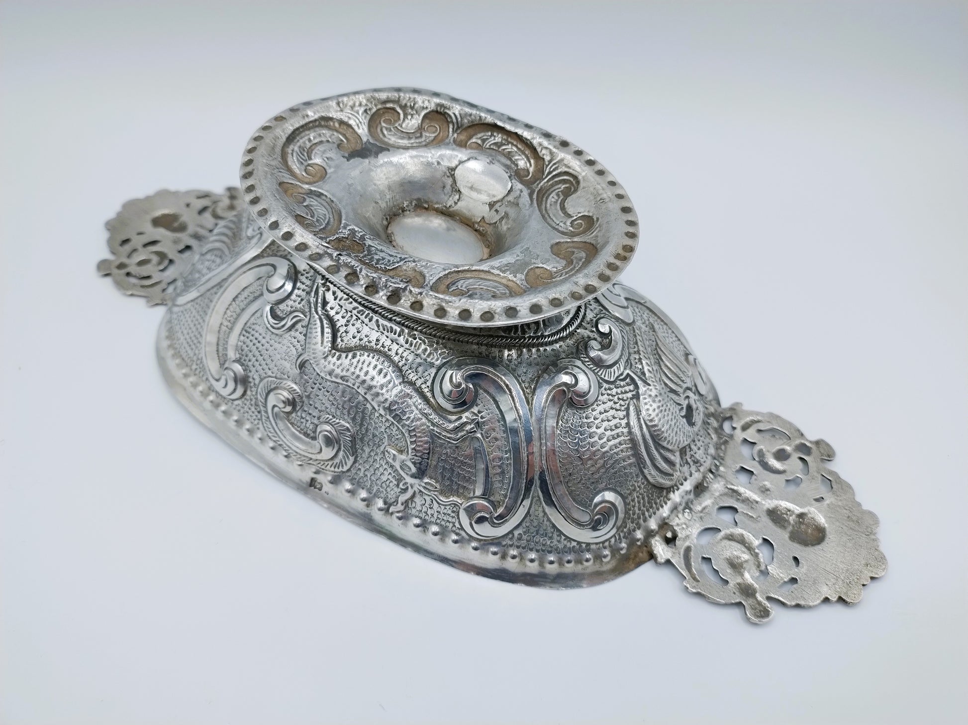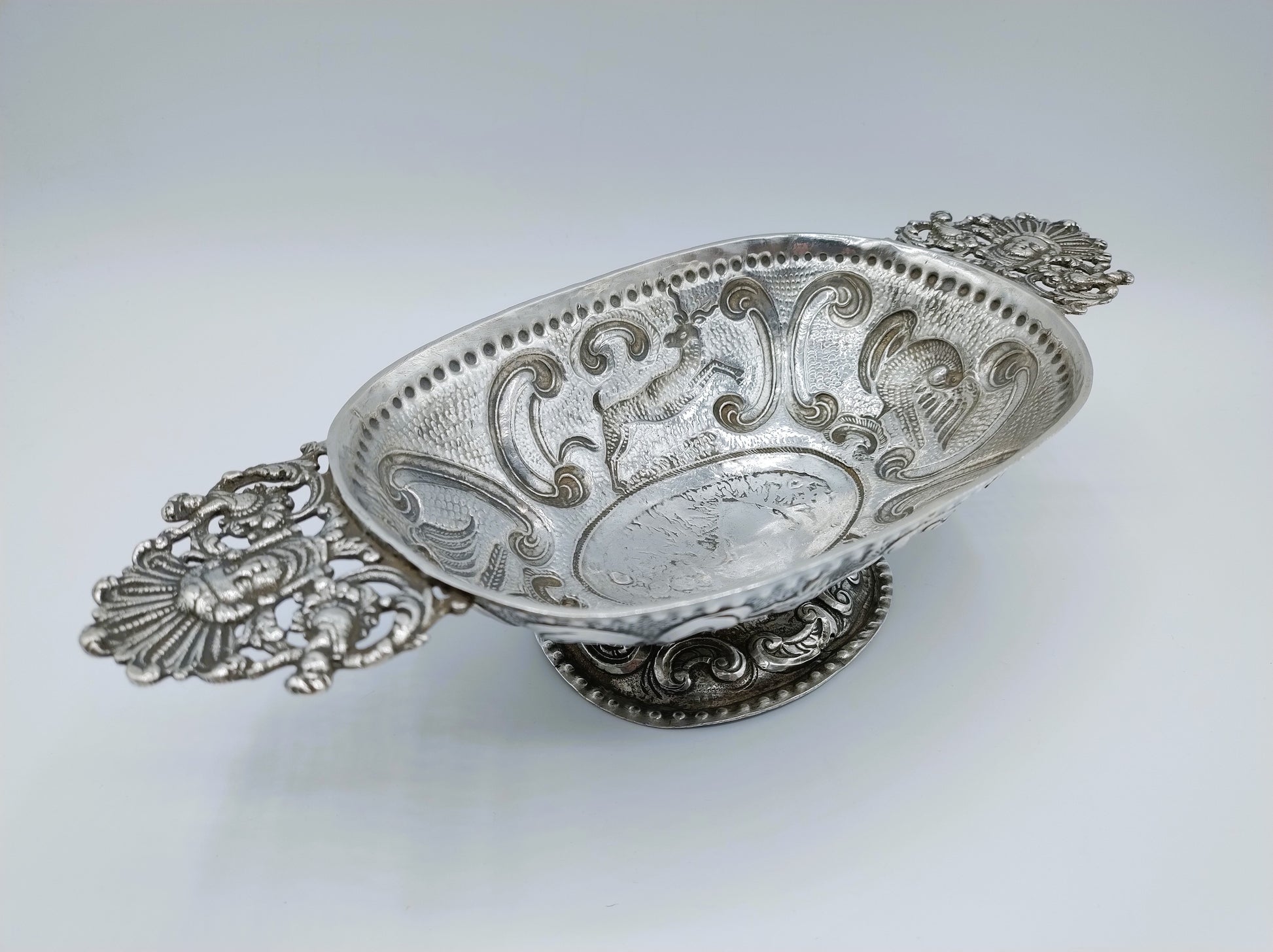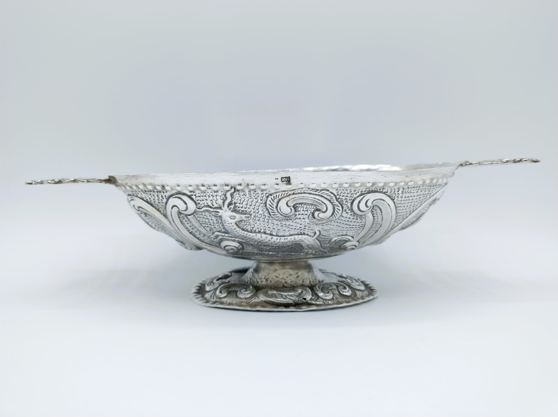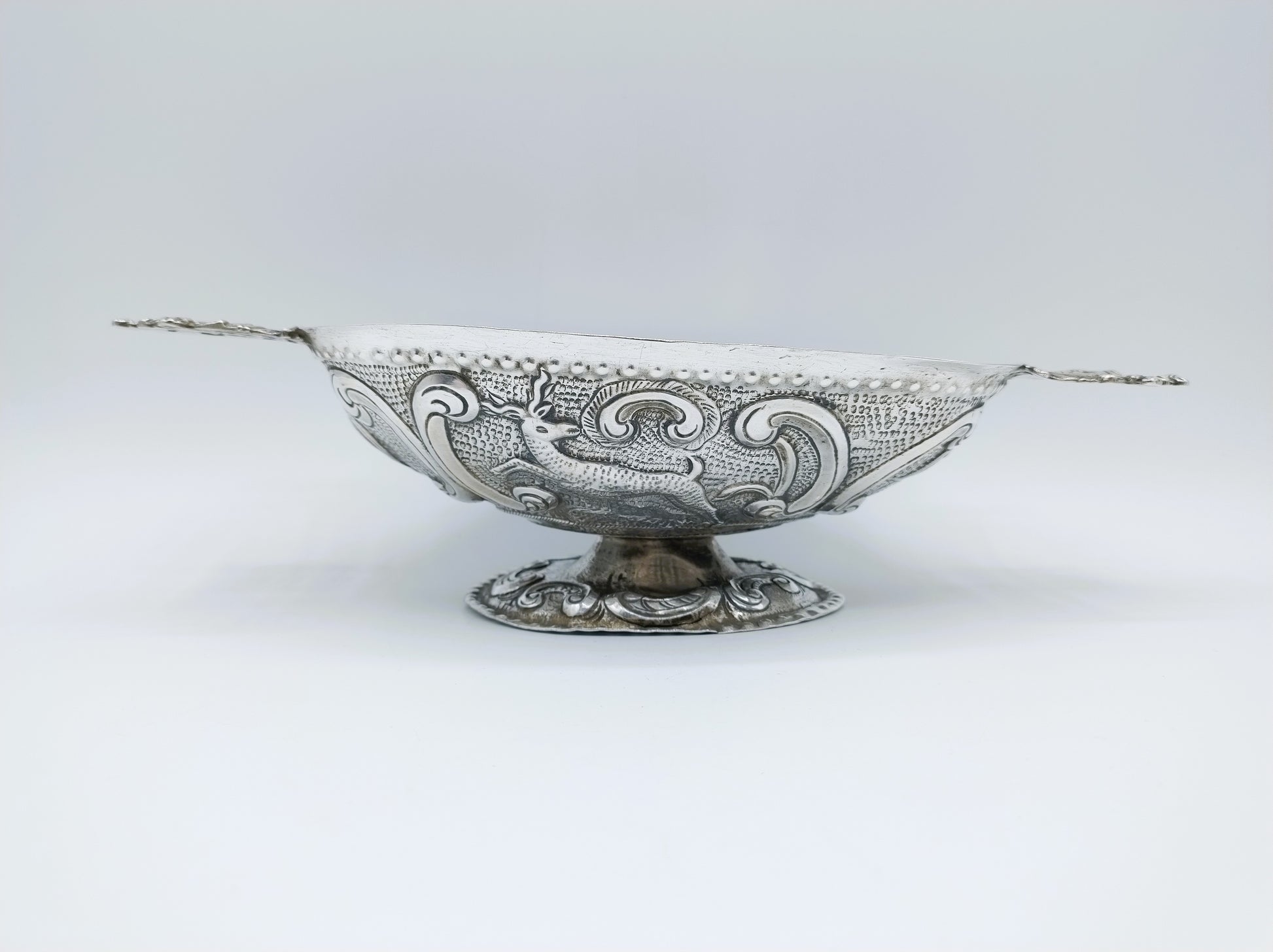 Zeer fraaie en authentieke 18e-eeuwse Friese zilveren brandewijnkom, rijk en vakkundig gedreven met een elegante afbeelding van een hert. Dit decoratieve motief, symbool van kracht en natuur, is met veel gevoel voor detail uitgevoerd en getuigt van hoogstaand zilverambacht uit de Friese traditie.