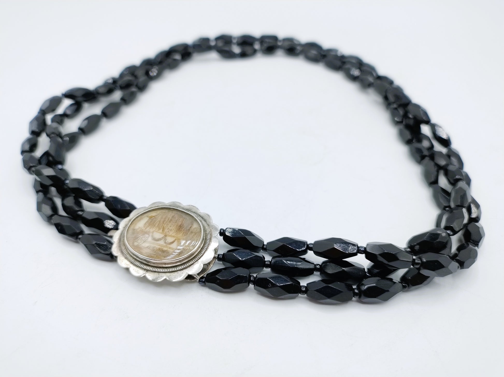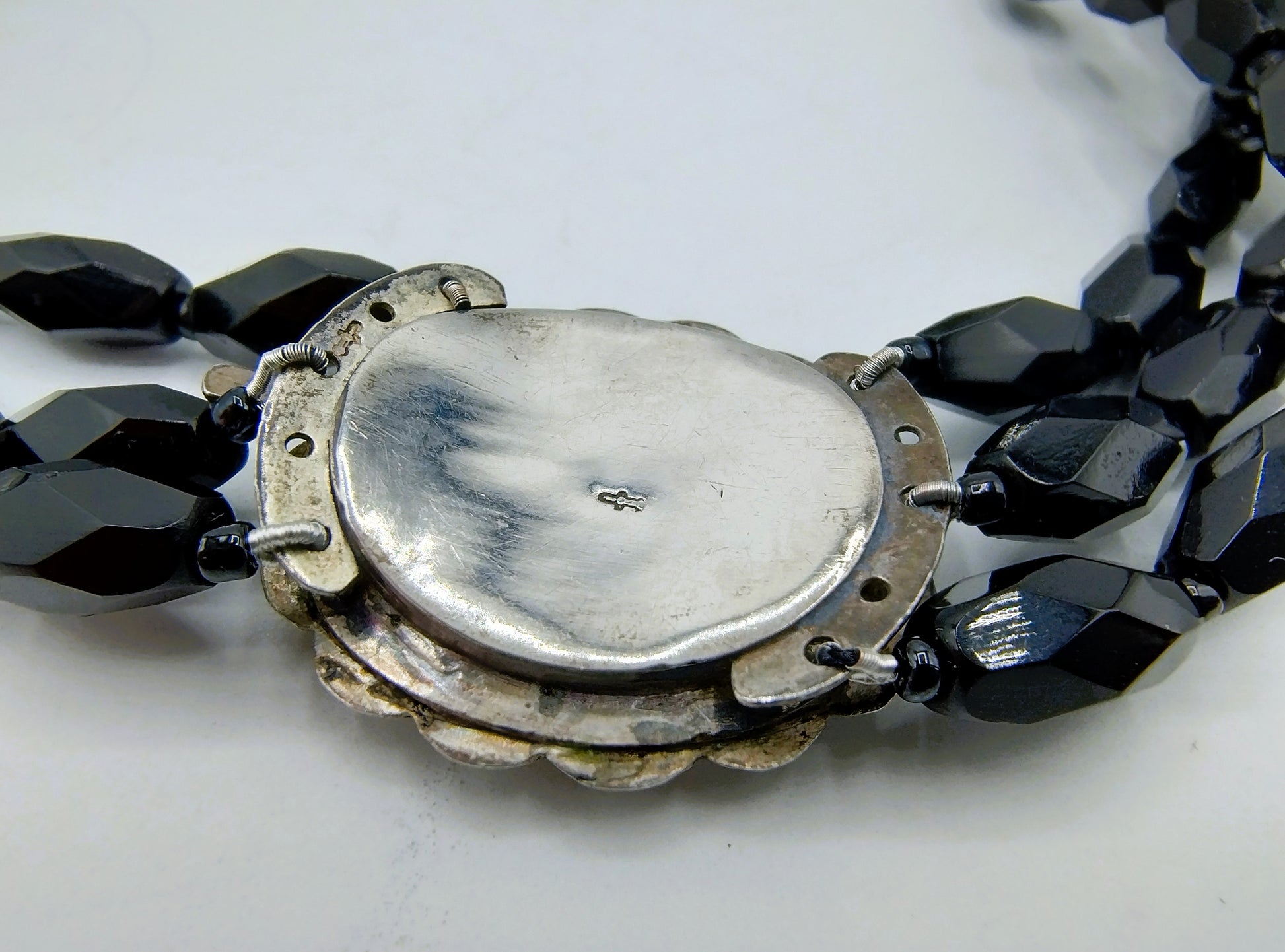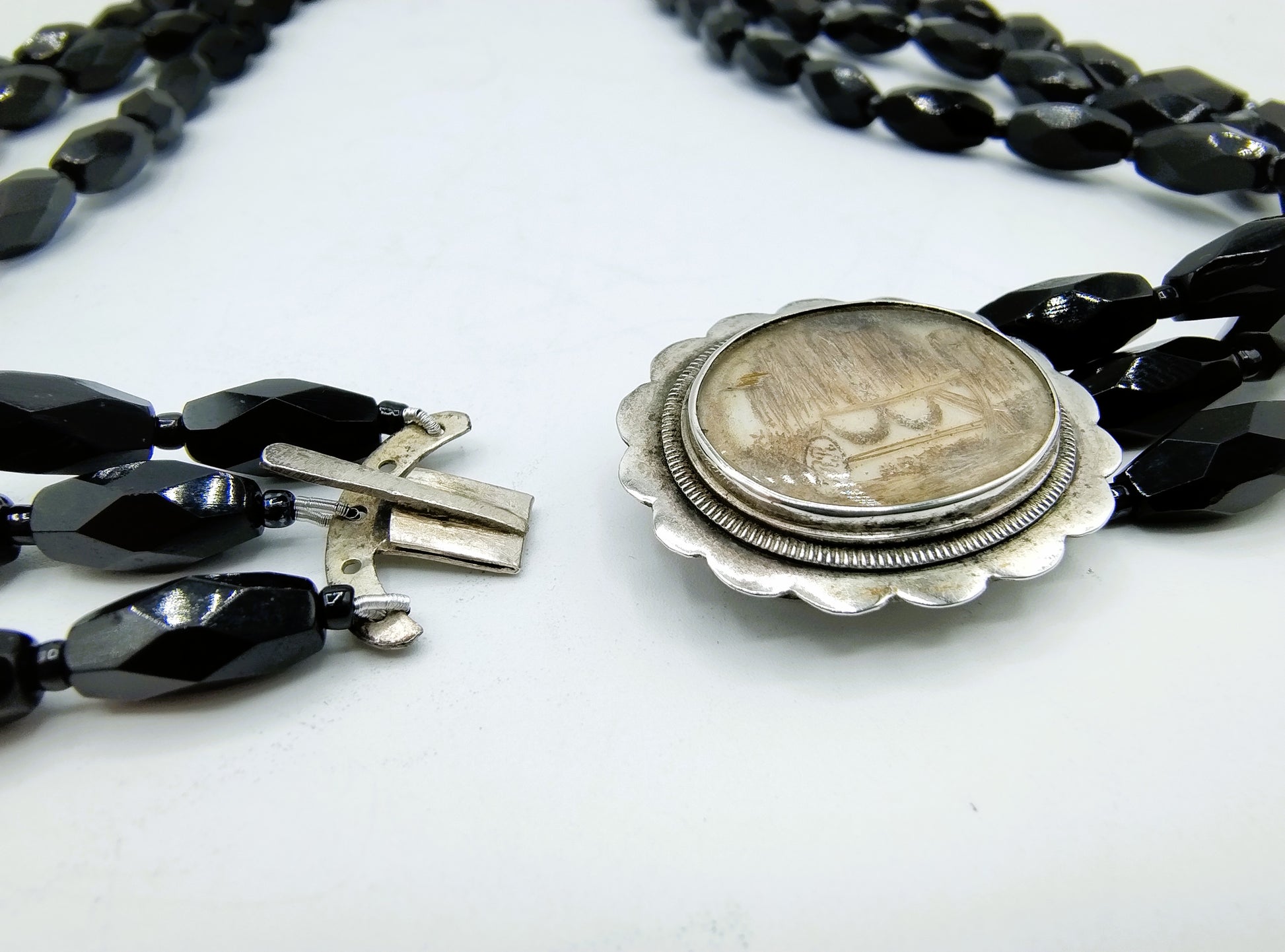 The silver clasp has 3 rows of jets connected to it, measuring 5 x 10 mm.