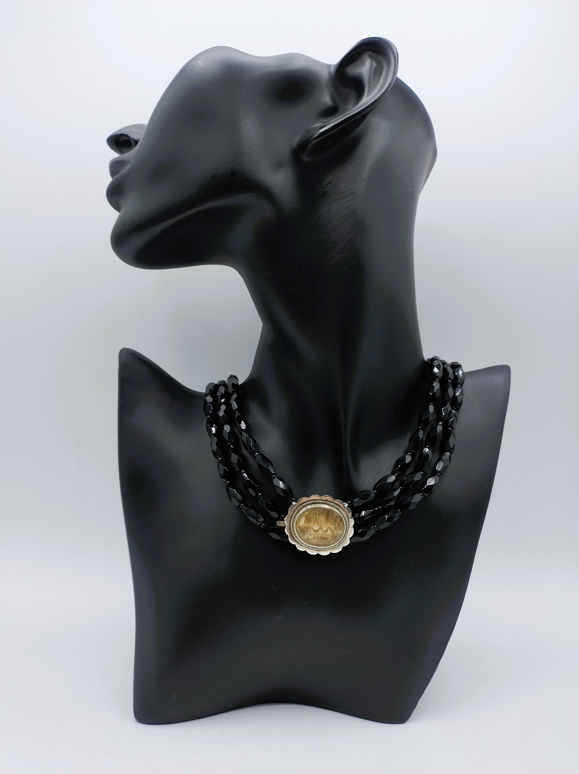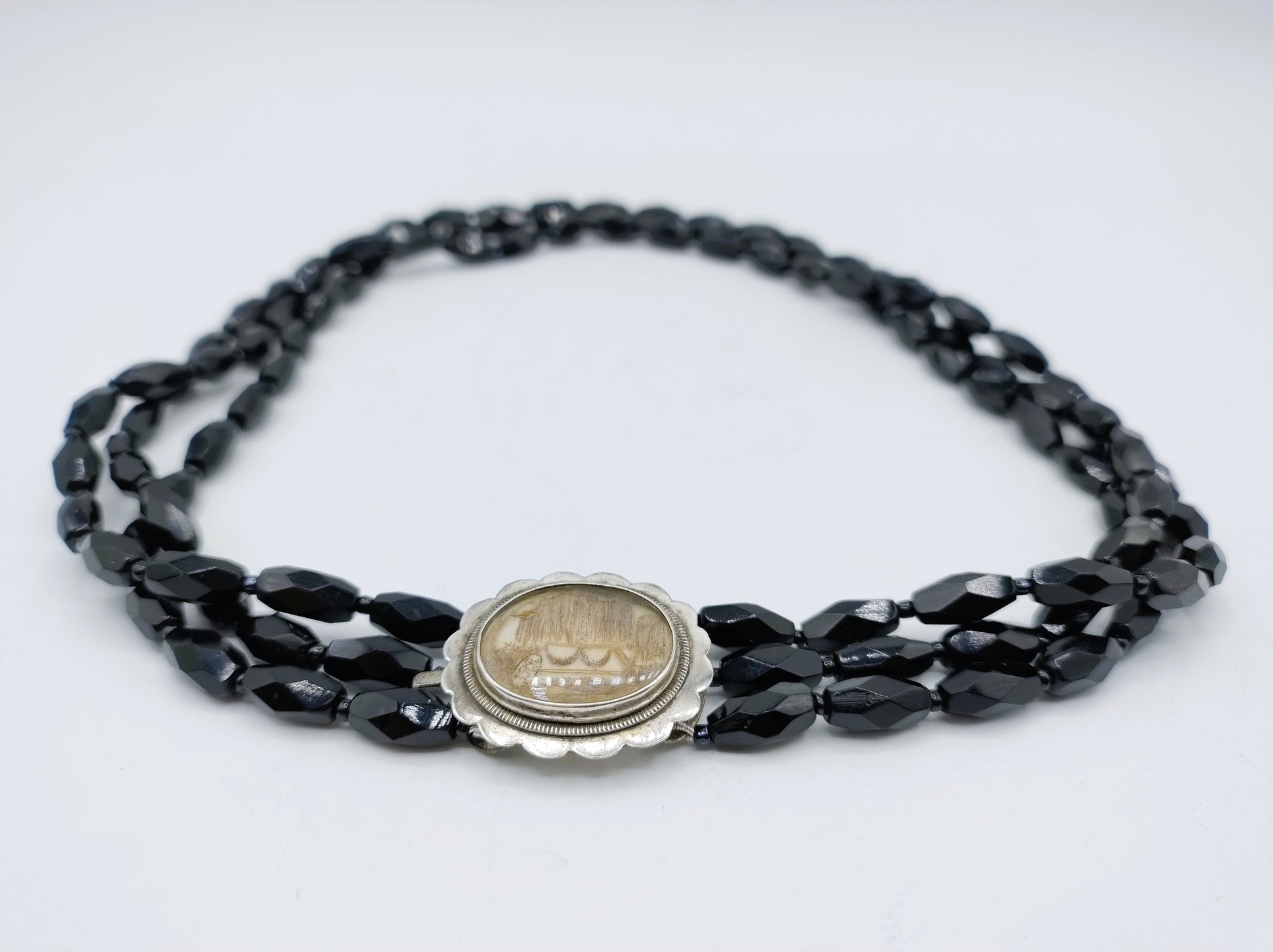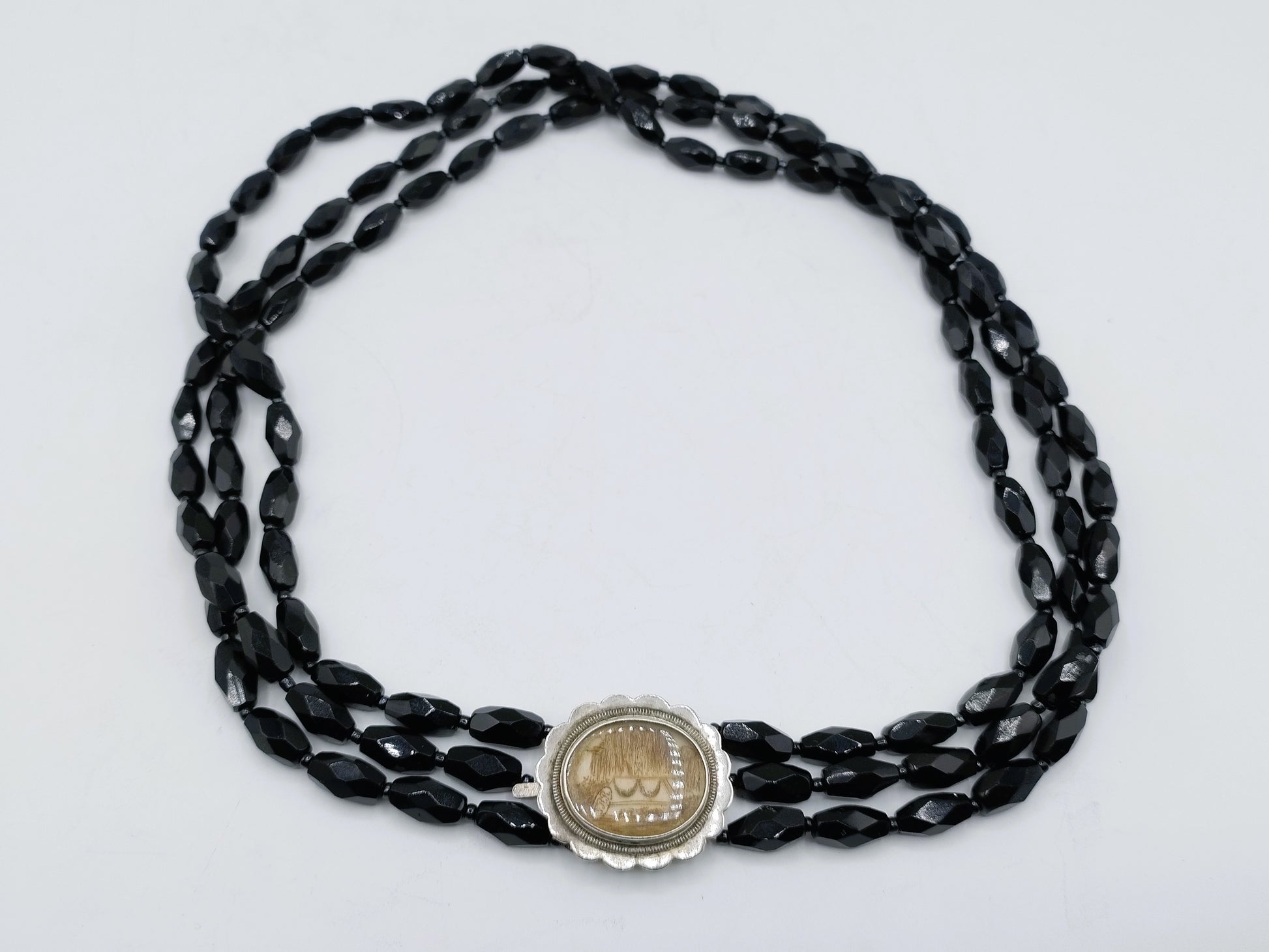 The silver clasp has 3 rows of jets connected to it, measuring 5 x 10 mm.