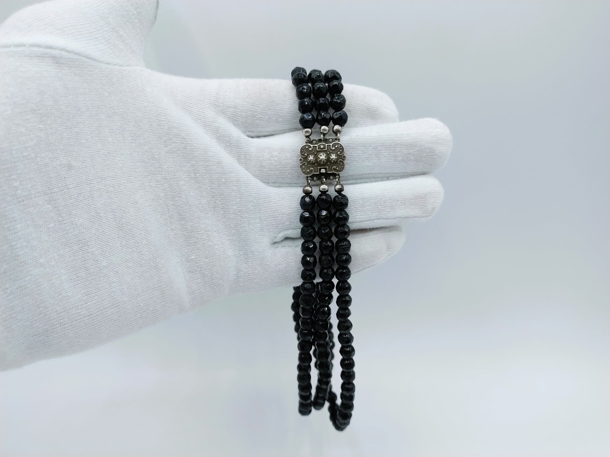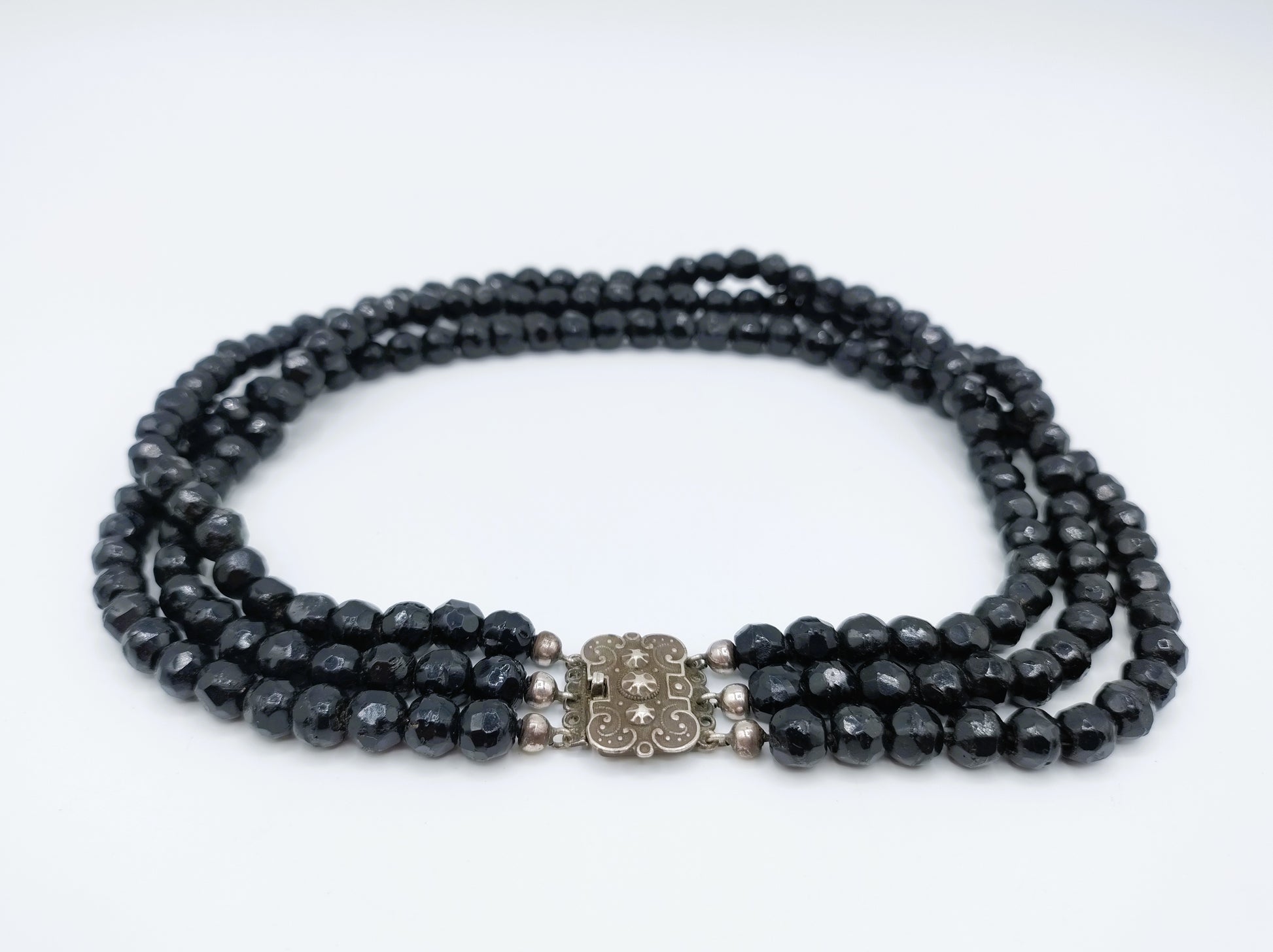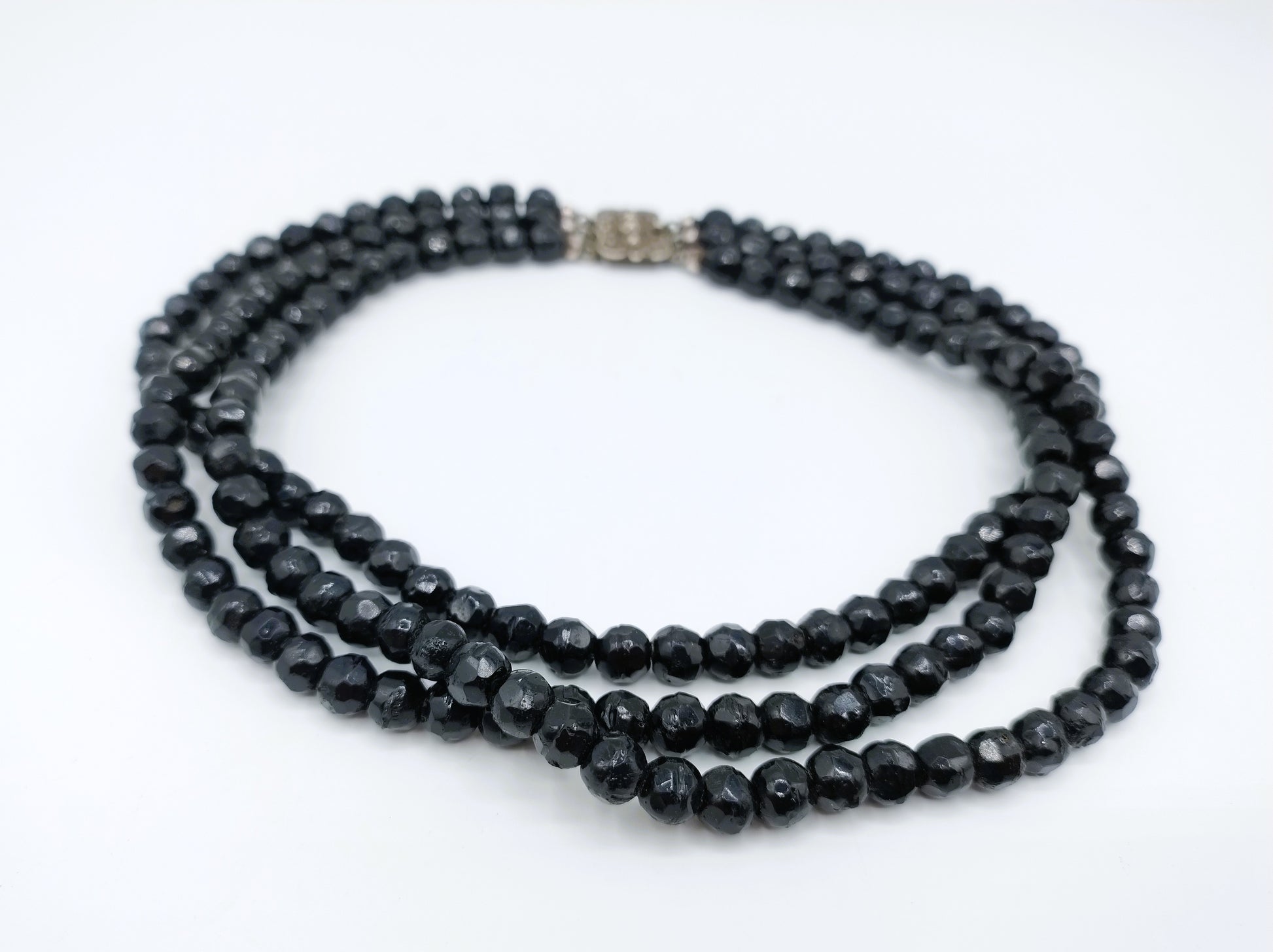 Necklace with 3 strands of jet with a diameter of approx. 6 mm on a silver clasp.