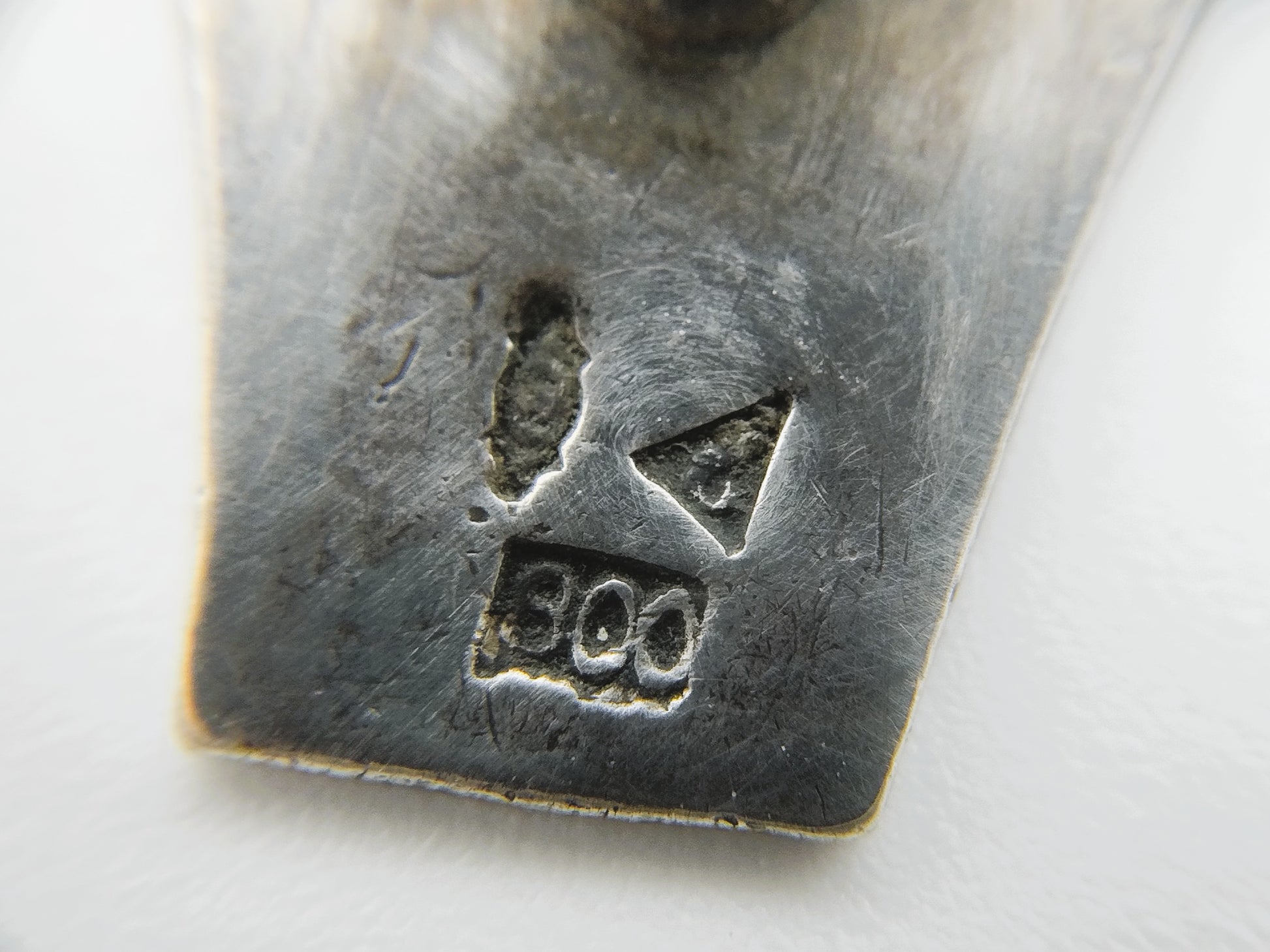 The lock is hallmarked 800 for second-grade silver. It is also hallmarked with a tax hallmark and an appendix hallmark.