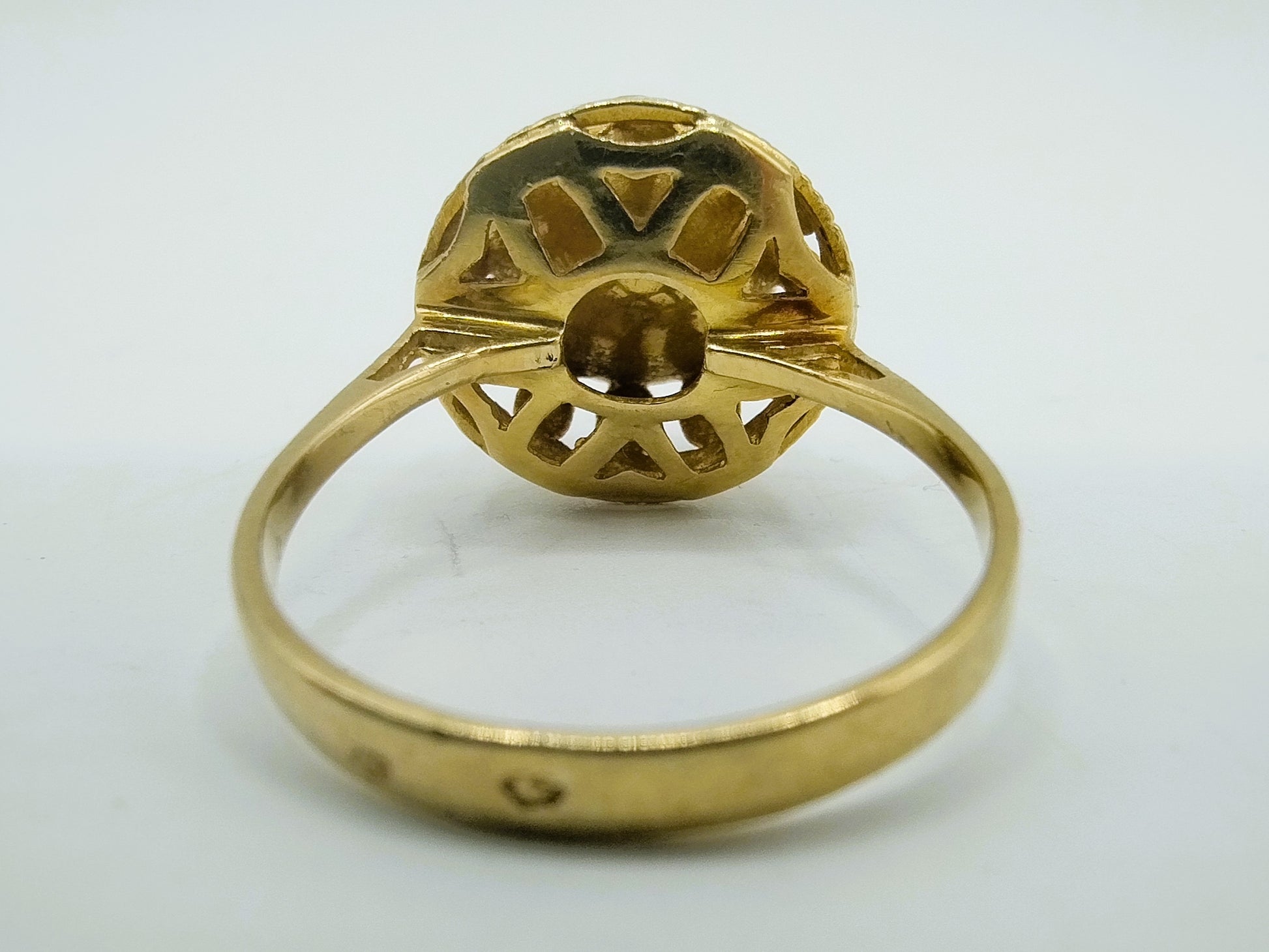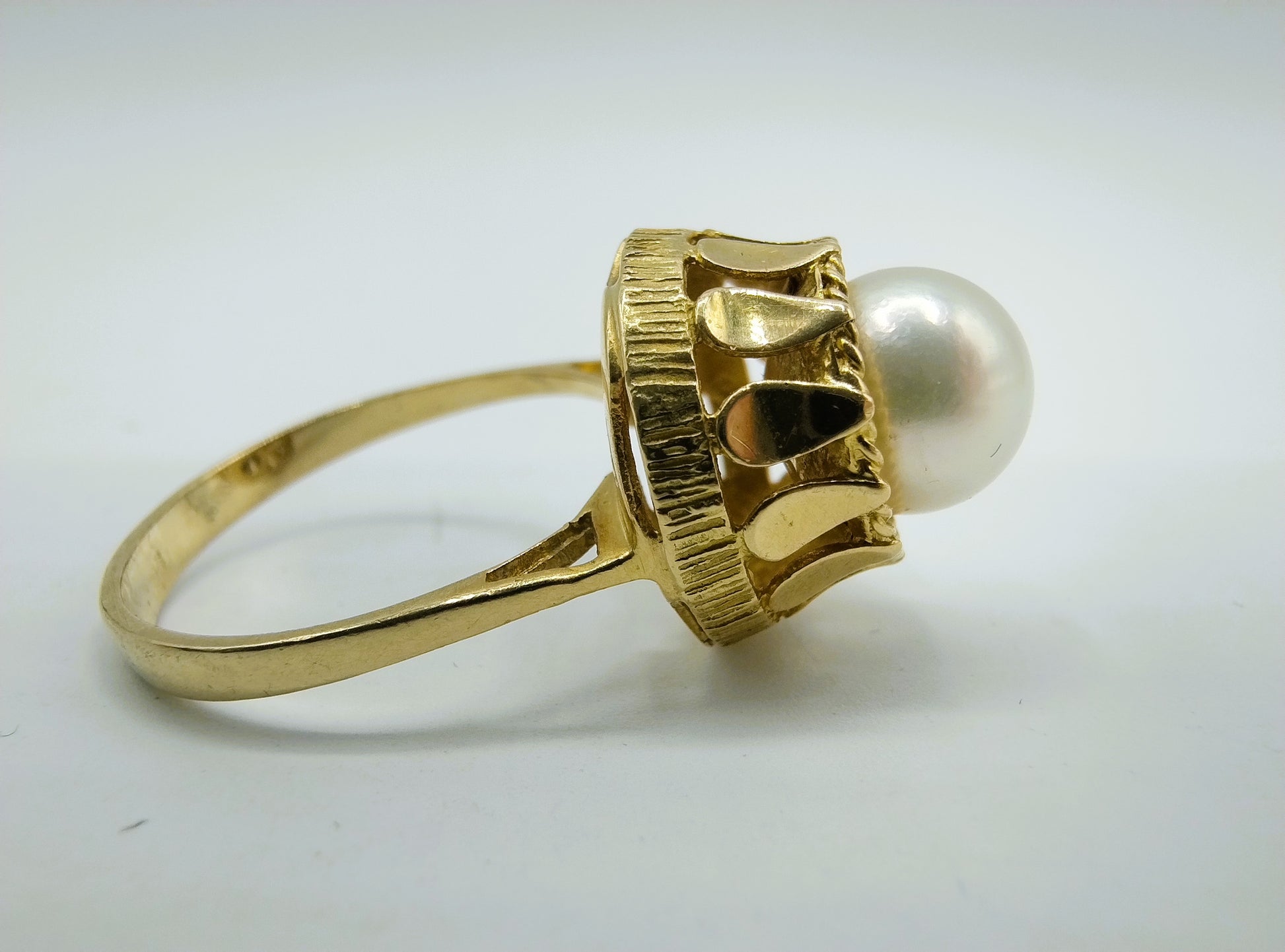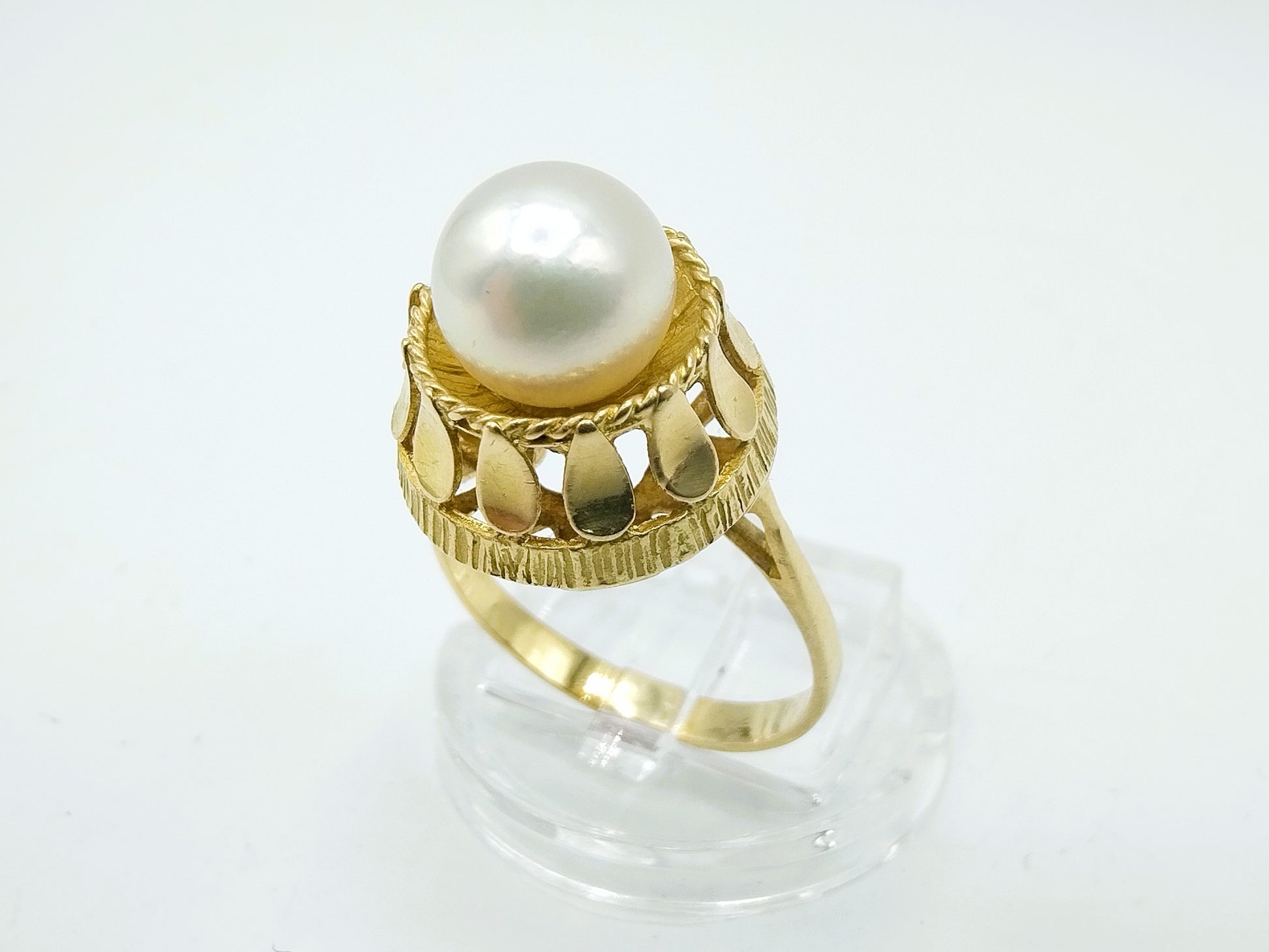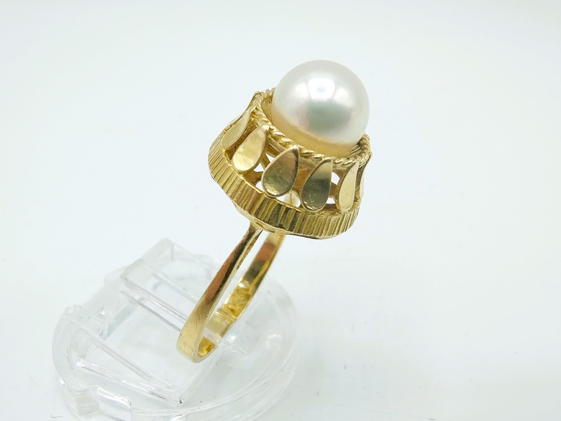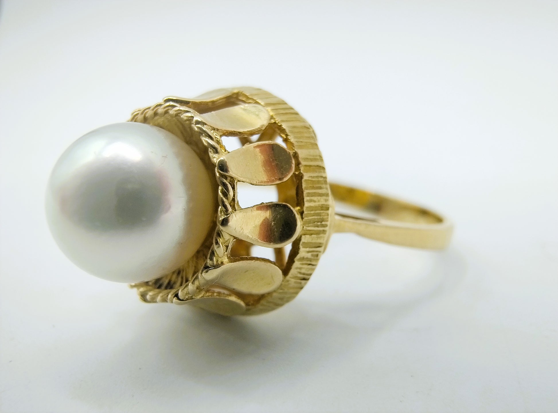 14 carat gold ring with a large authentic pearl. The pearl has a diameter of 7 to 8 mm.