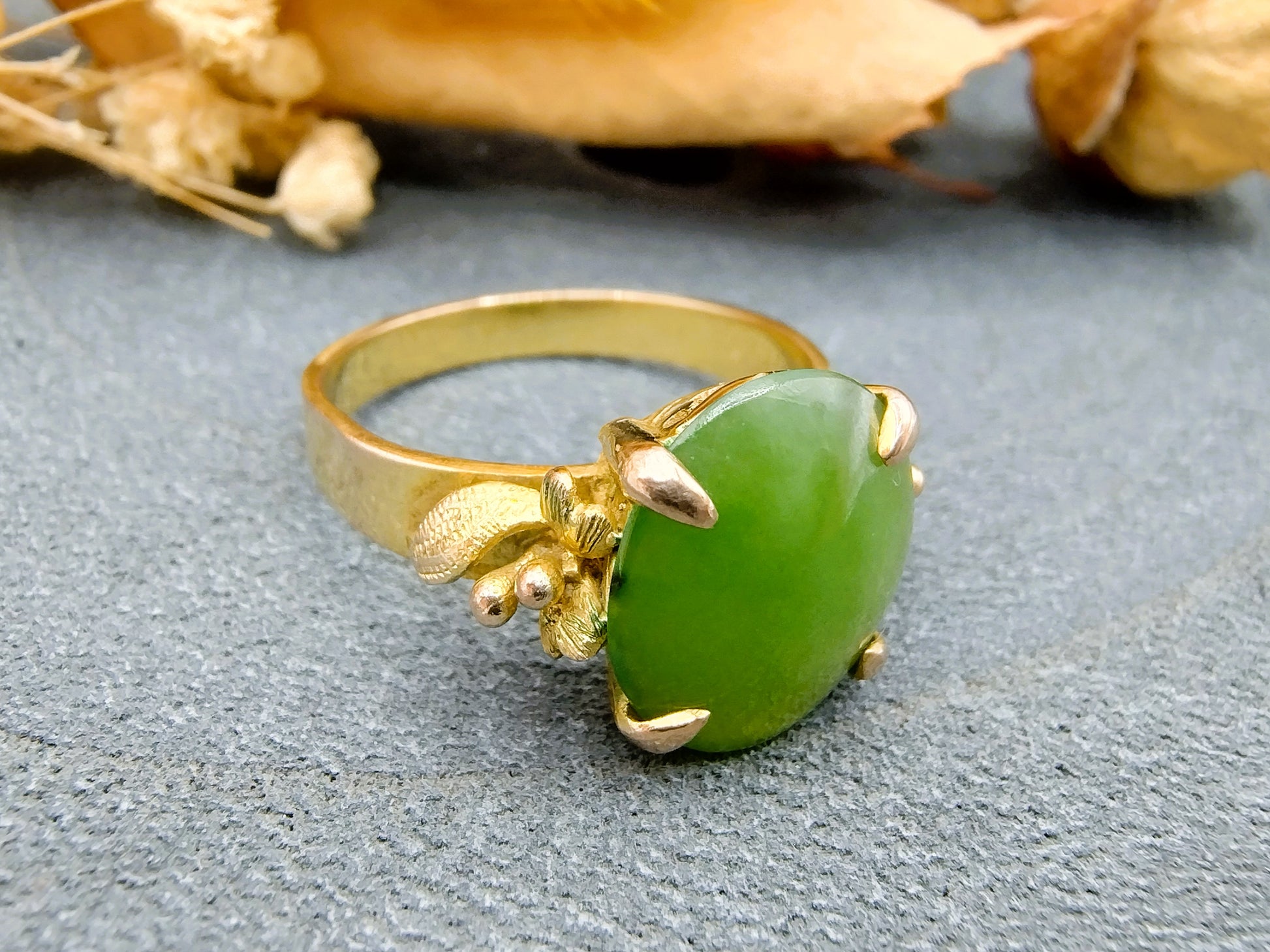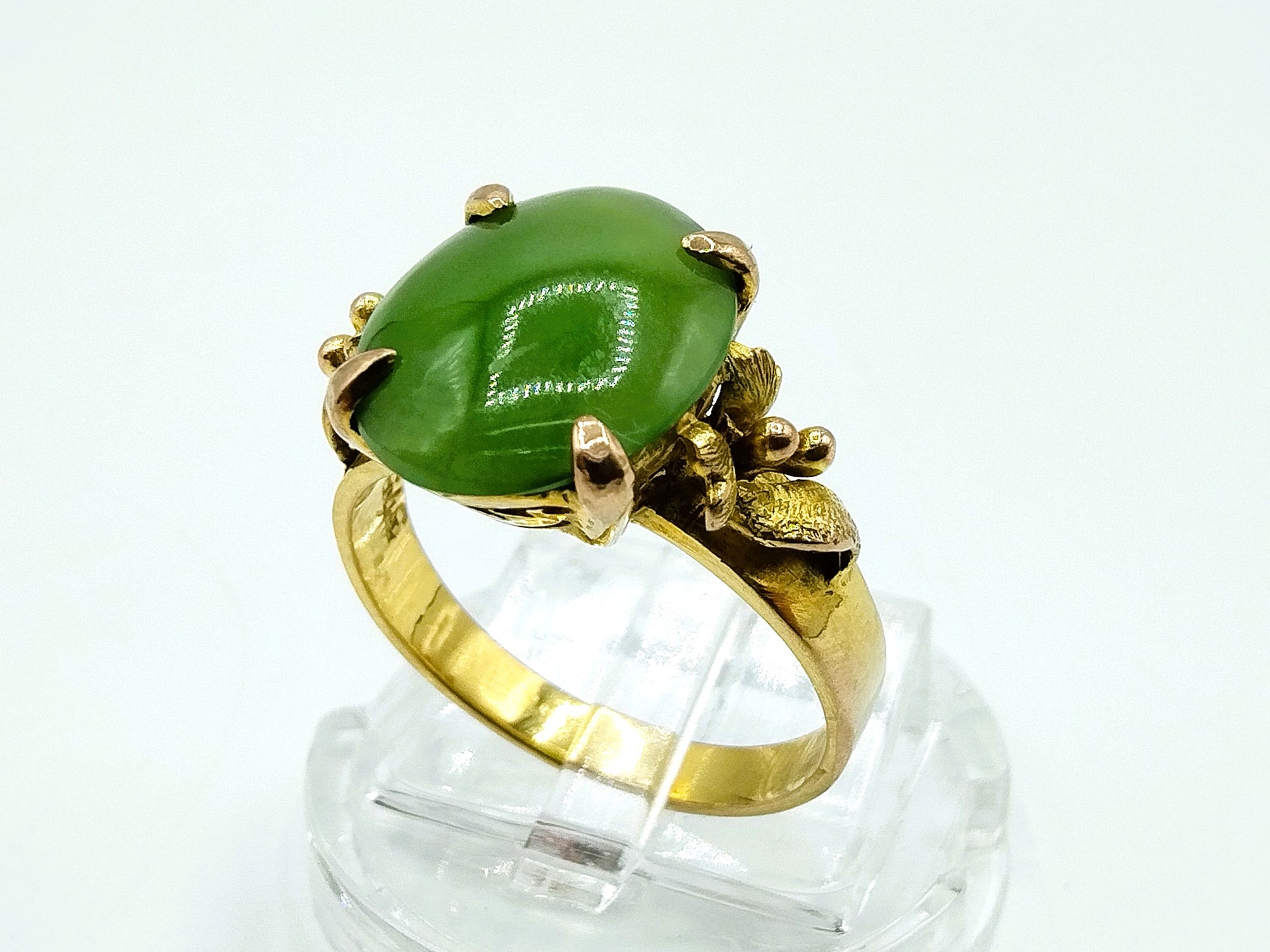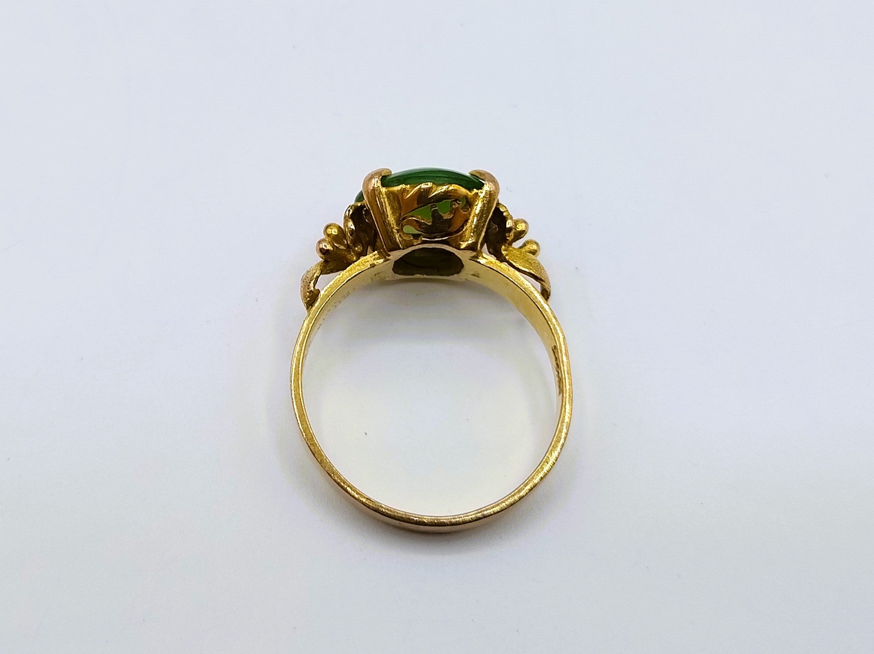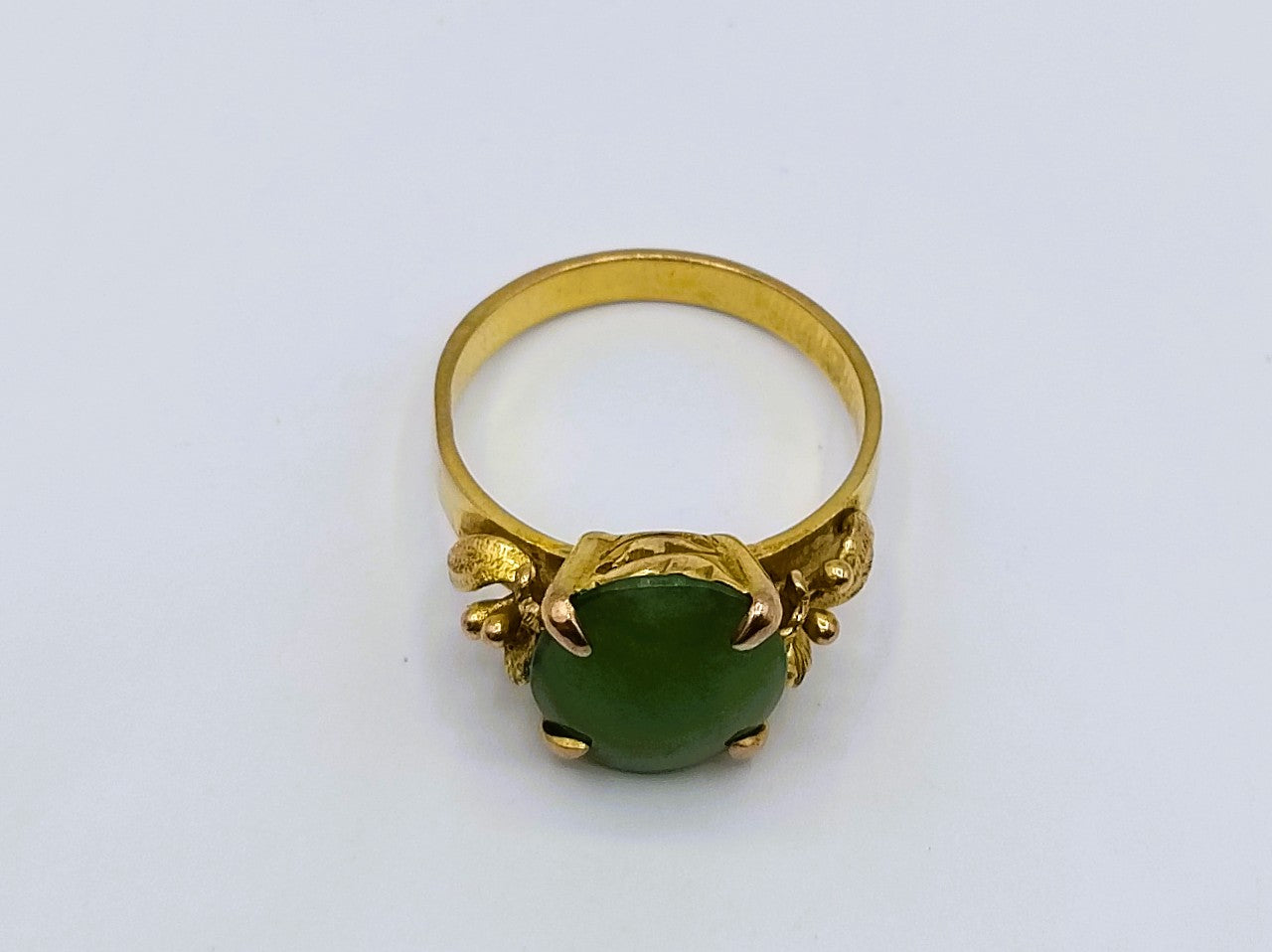 Vintage gold ring set with a jade stone. The stone has the following dimensions: 1 x 1.2 cm and is in a 4-legged chaton setting.
