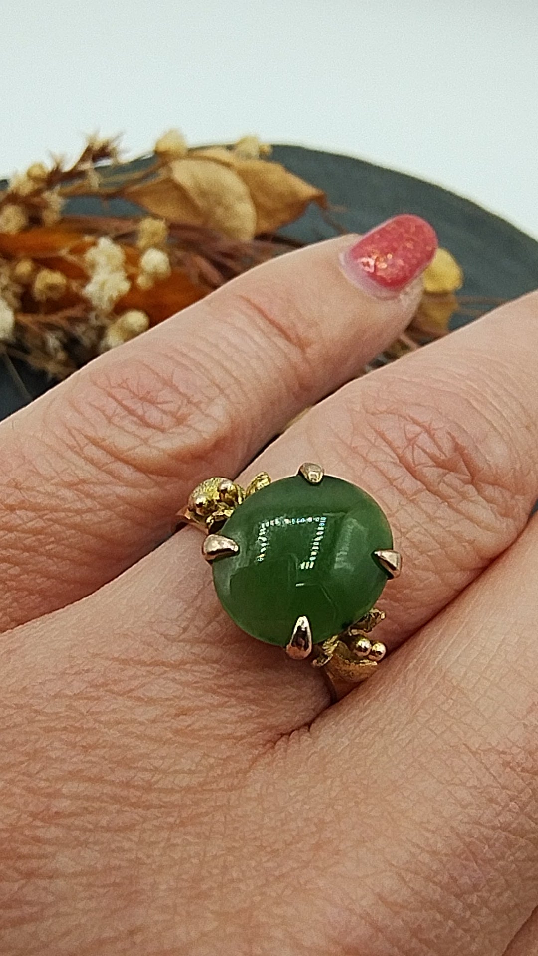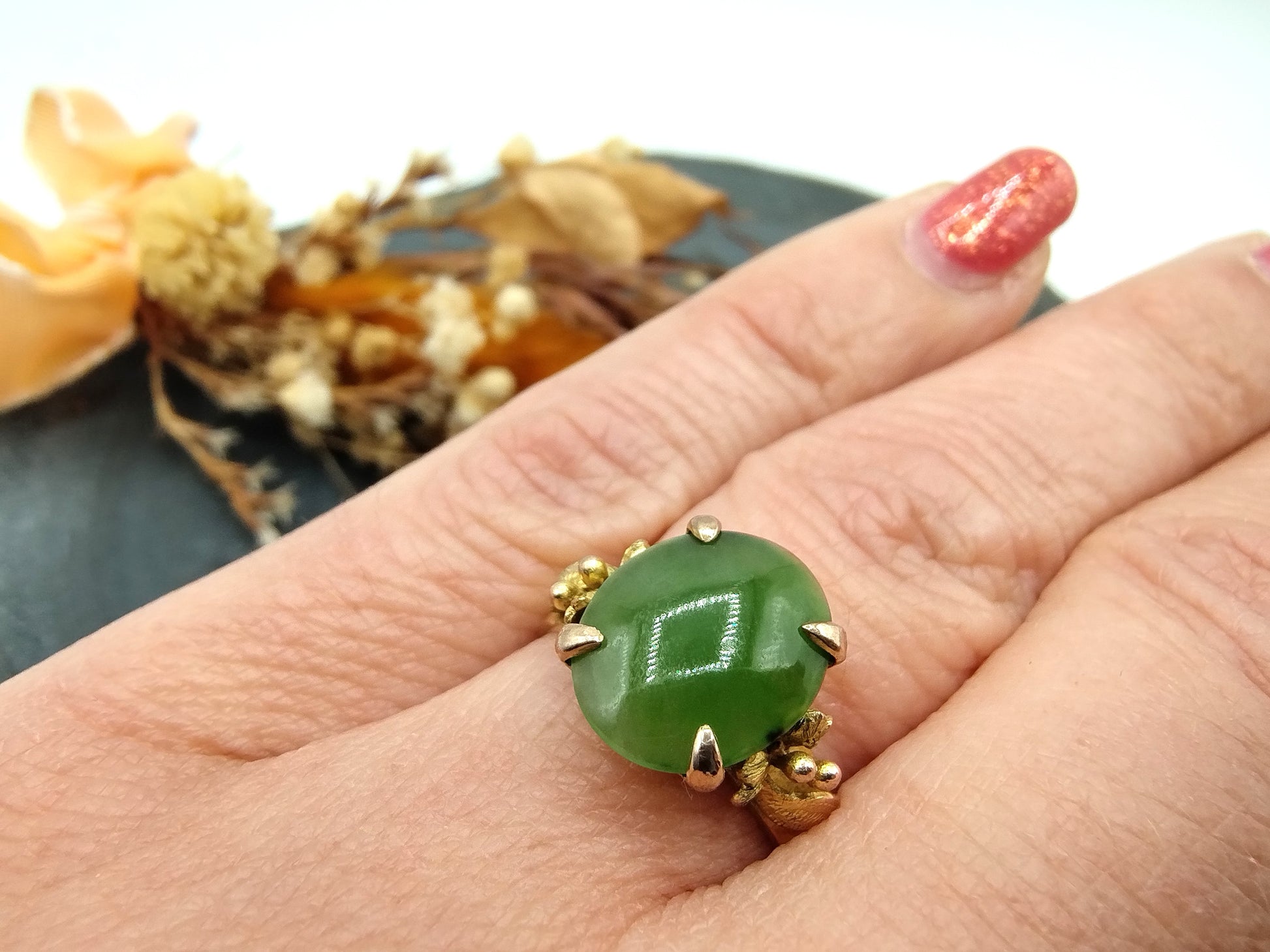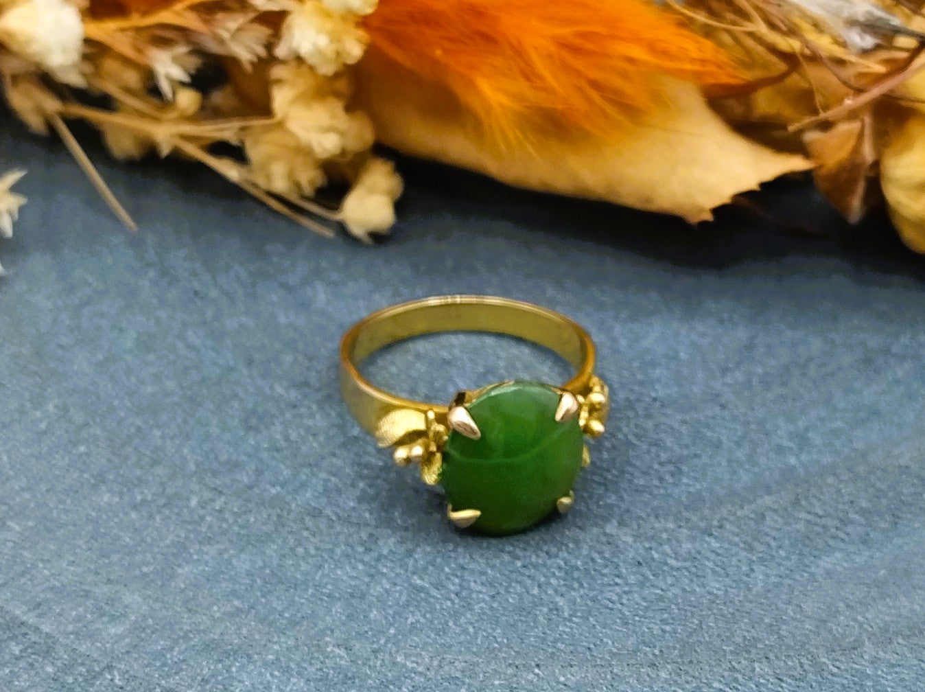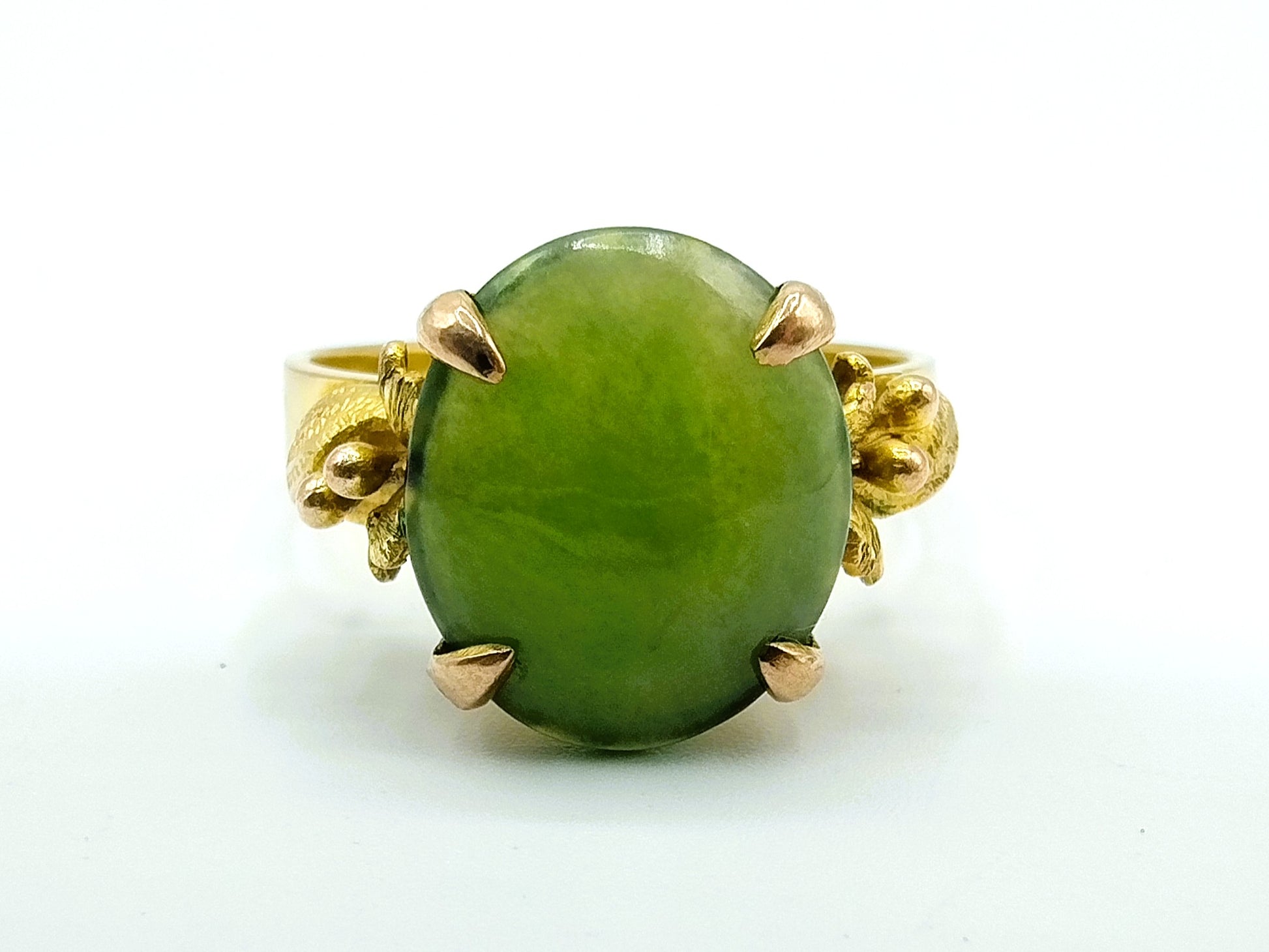 Vintage gold ring set with a jade stone. The stone has the following dimensions: 1 x 1.2 cm and is in a 4-legged chaton setting.