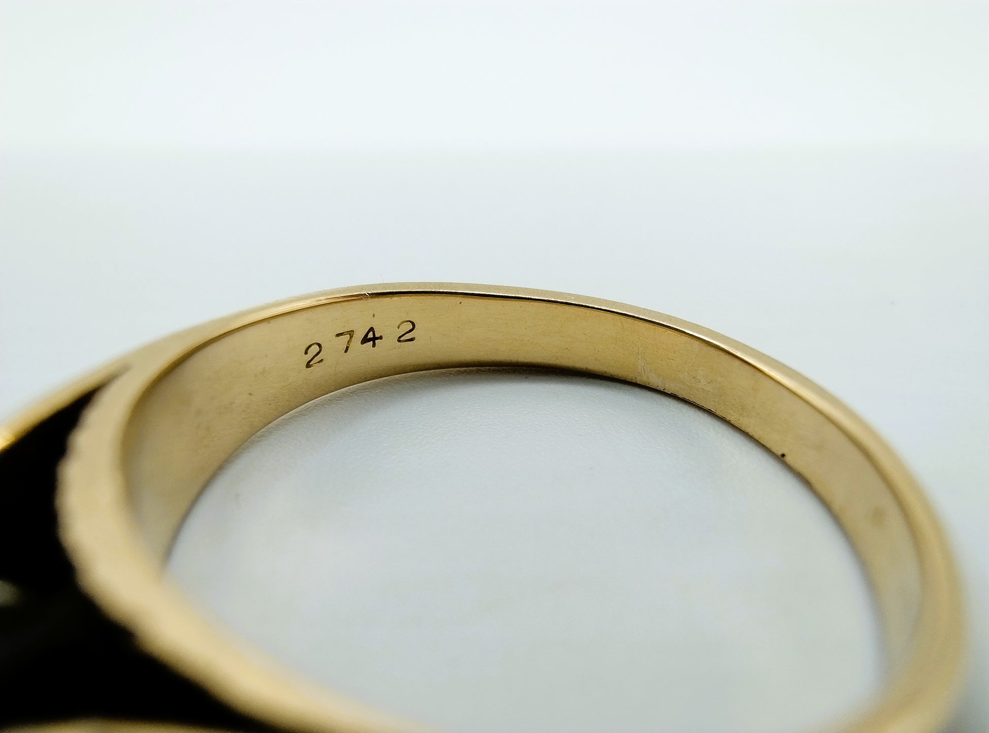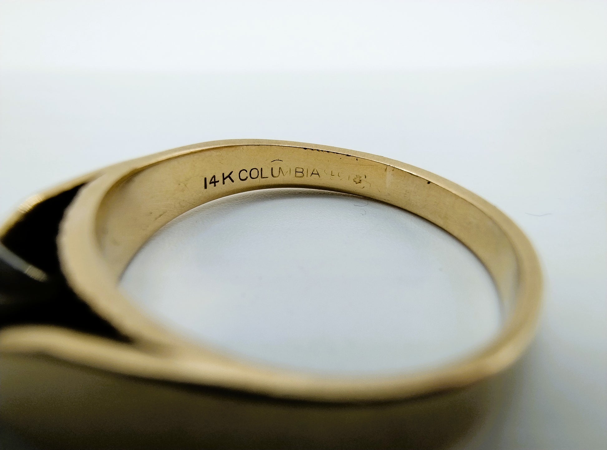 The ring is hallmarked 14K (14 carat gold), Columbia, master mark LC and the numbers 2742.
