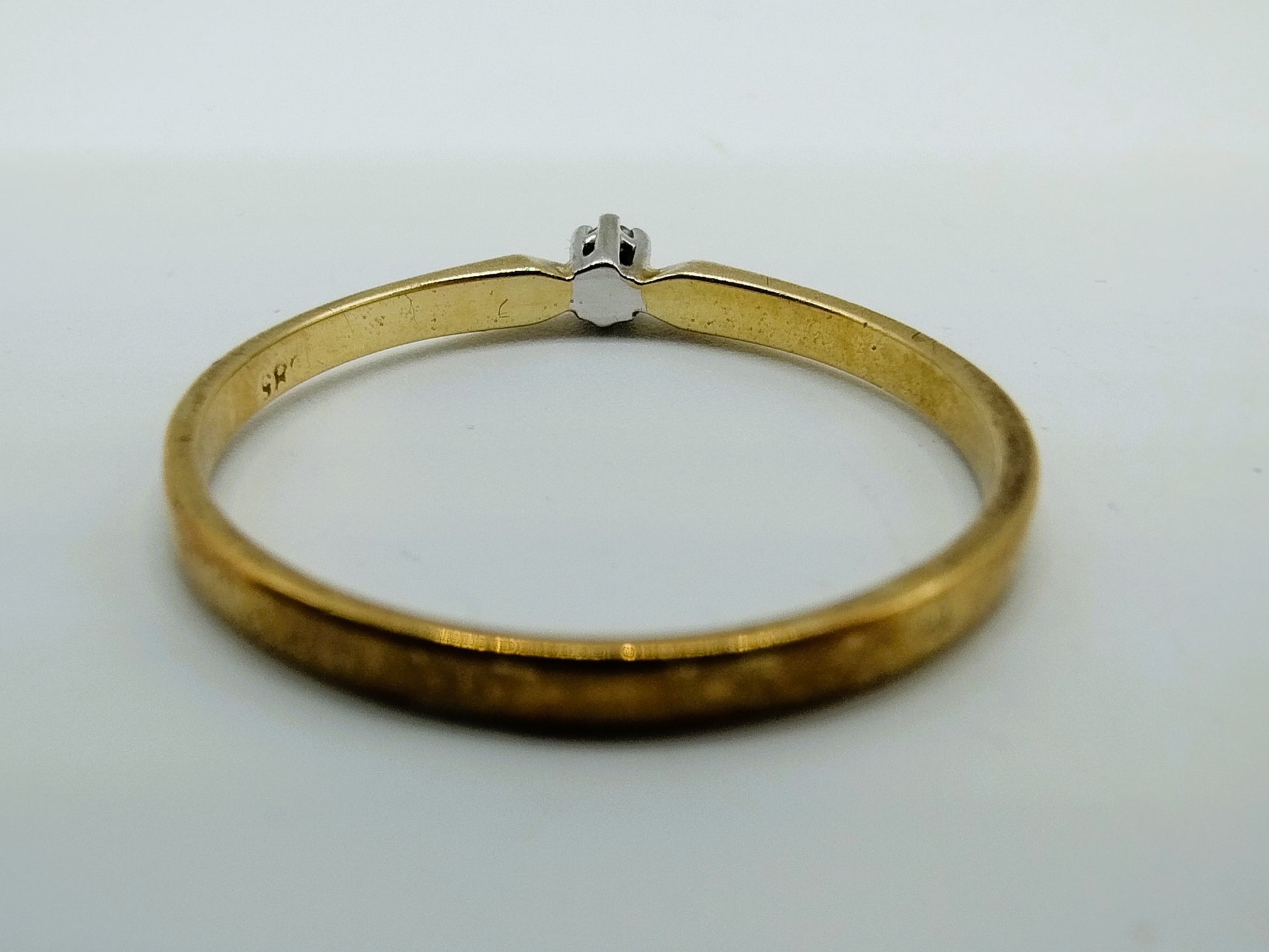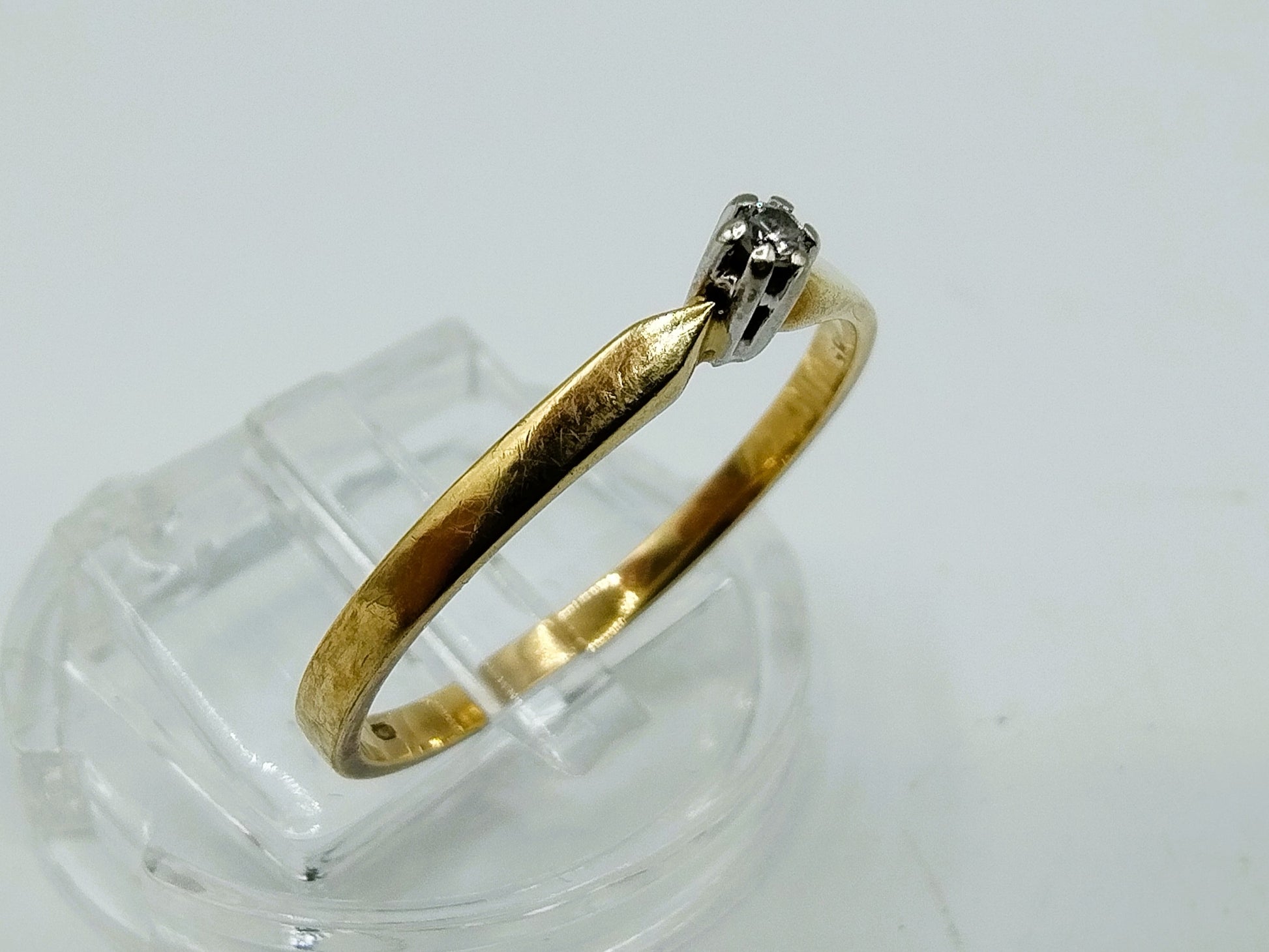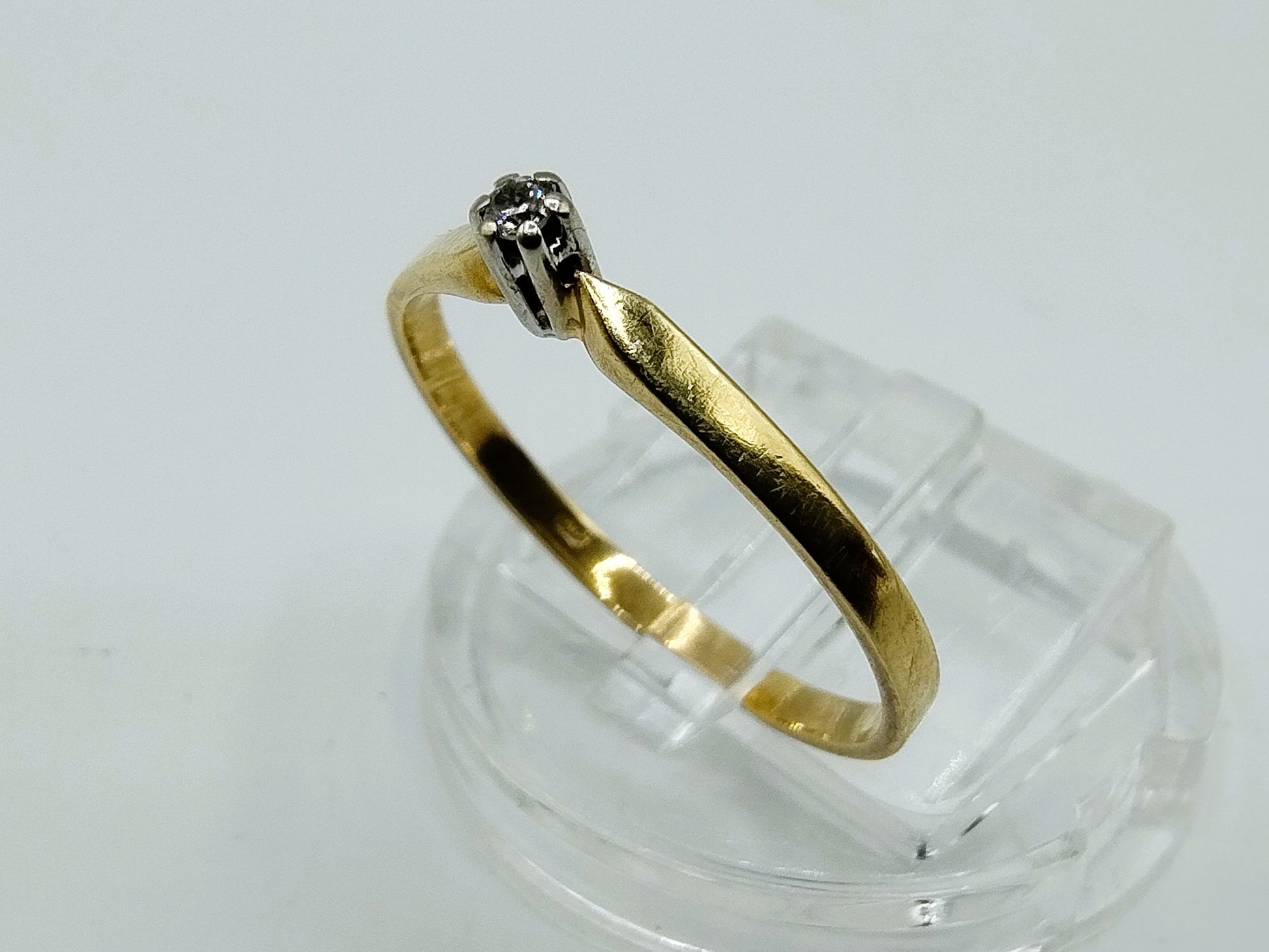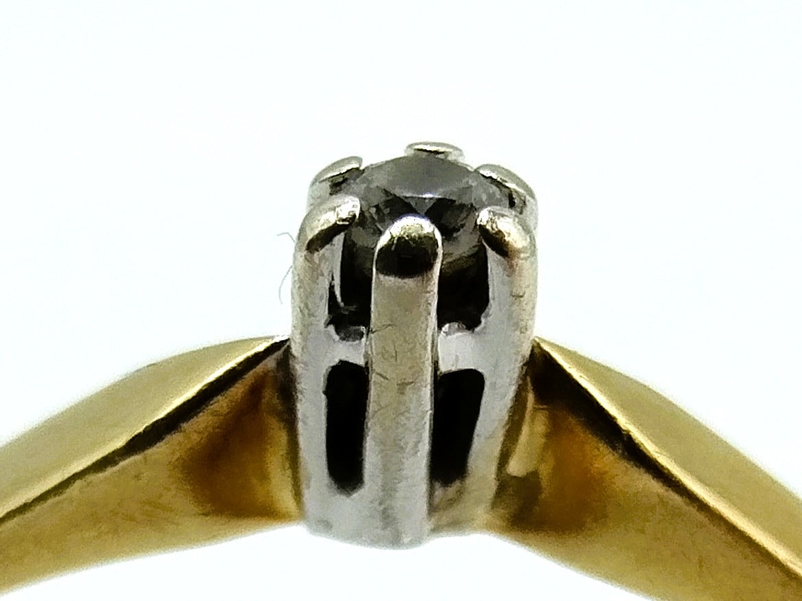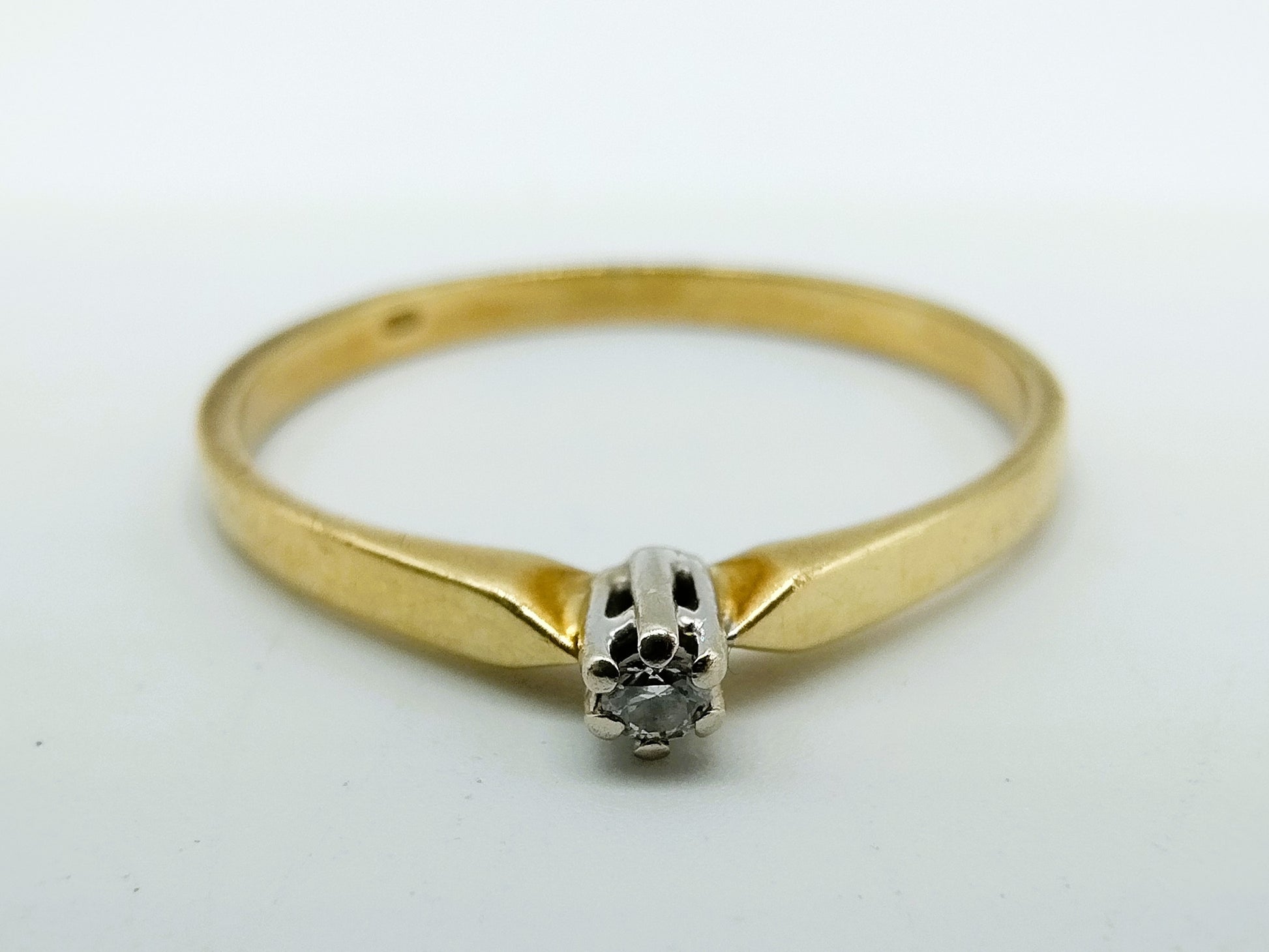 Gold solitaire ring set with a brilliant cut diamond with a diameter of 1 mm.