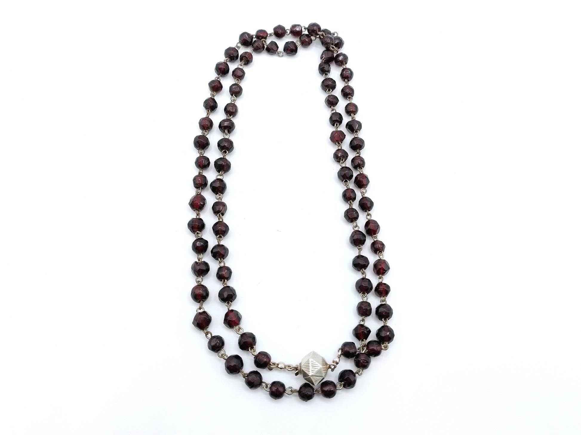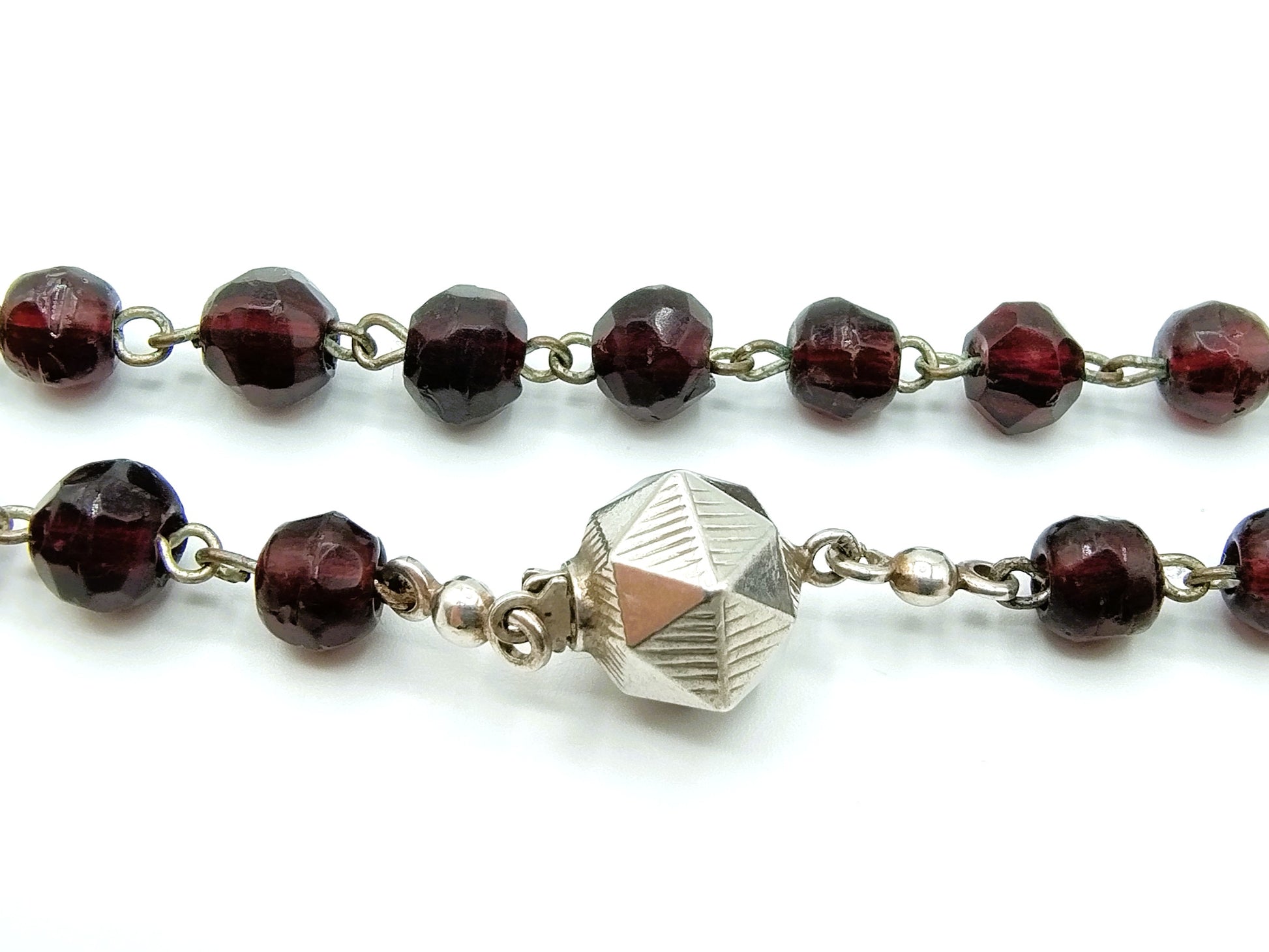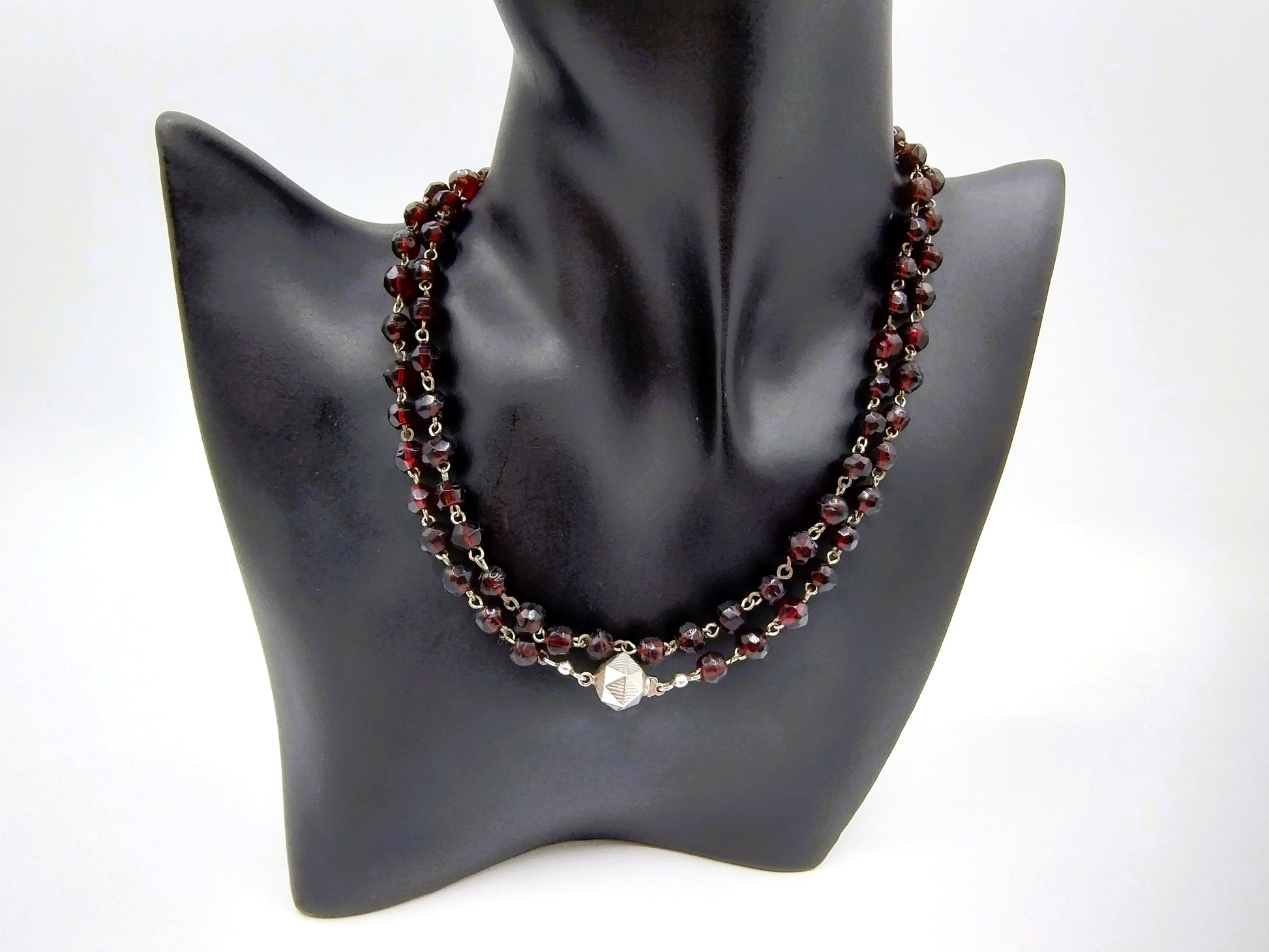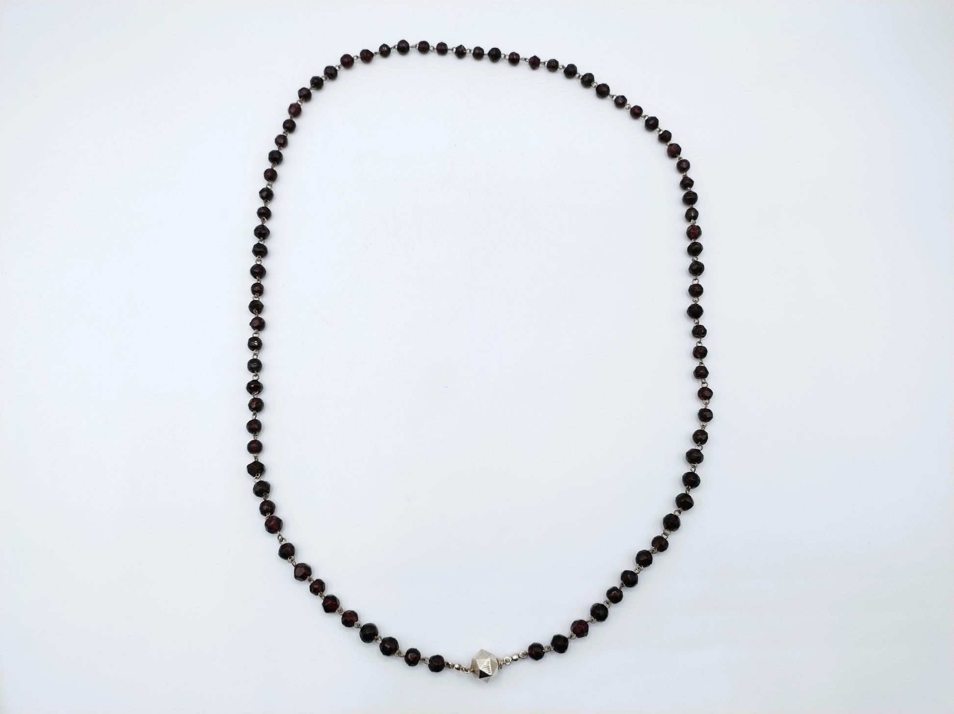 Garnet necklace strung on silver wire with a silver ball clasp.