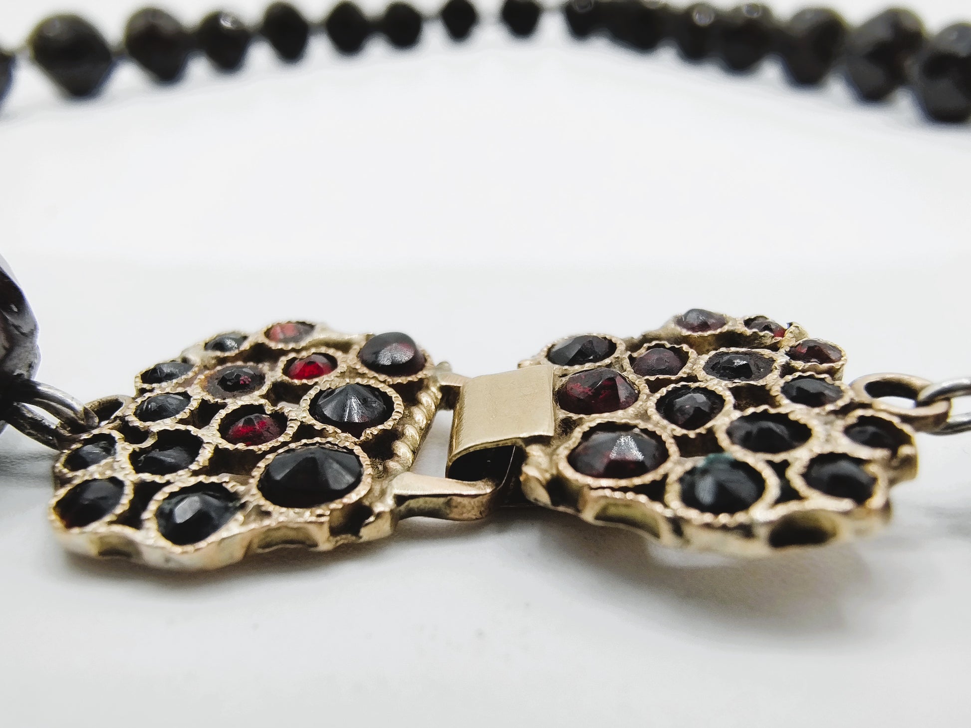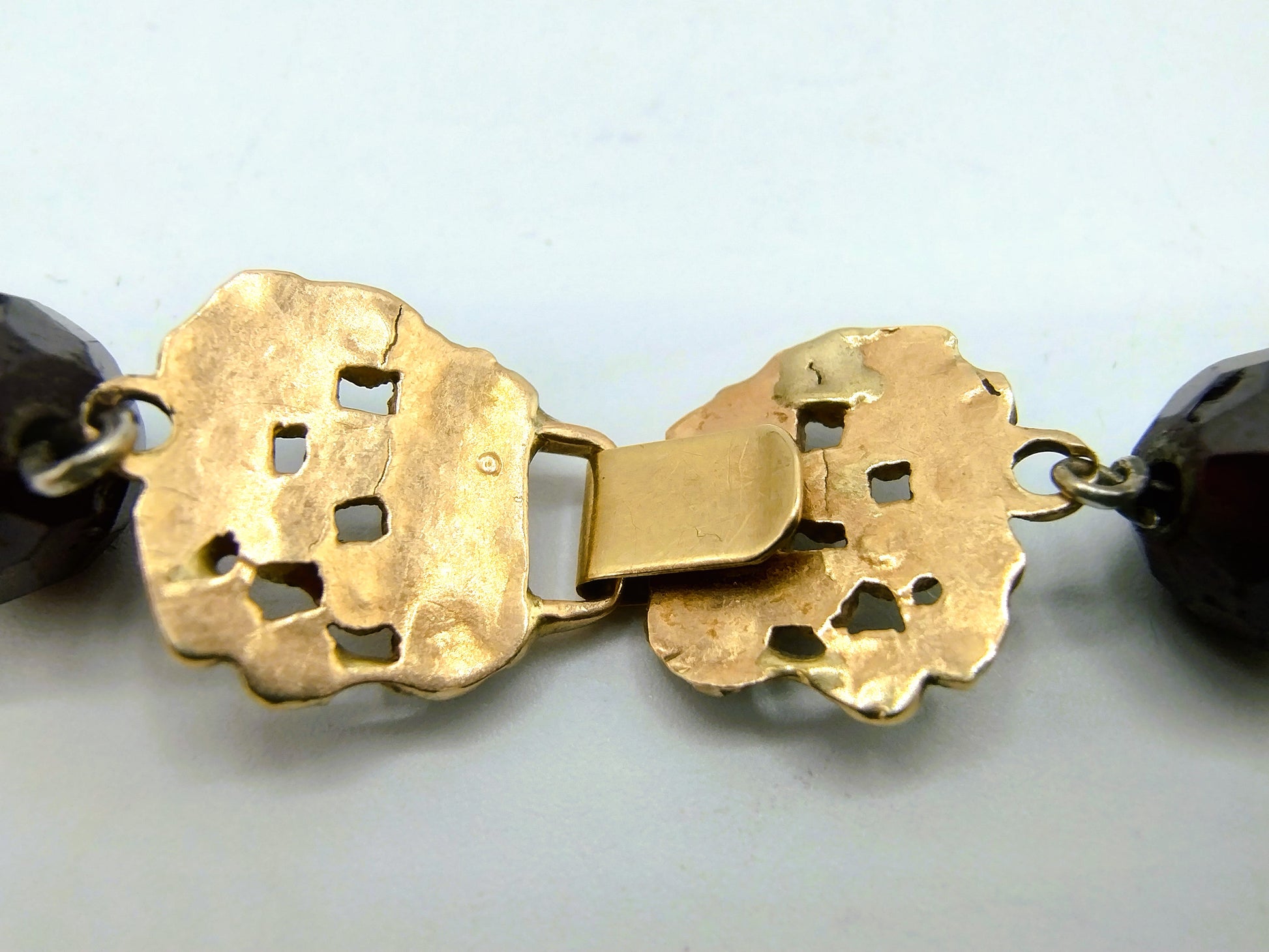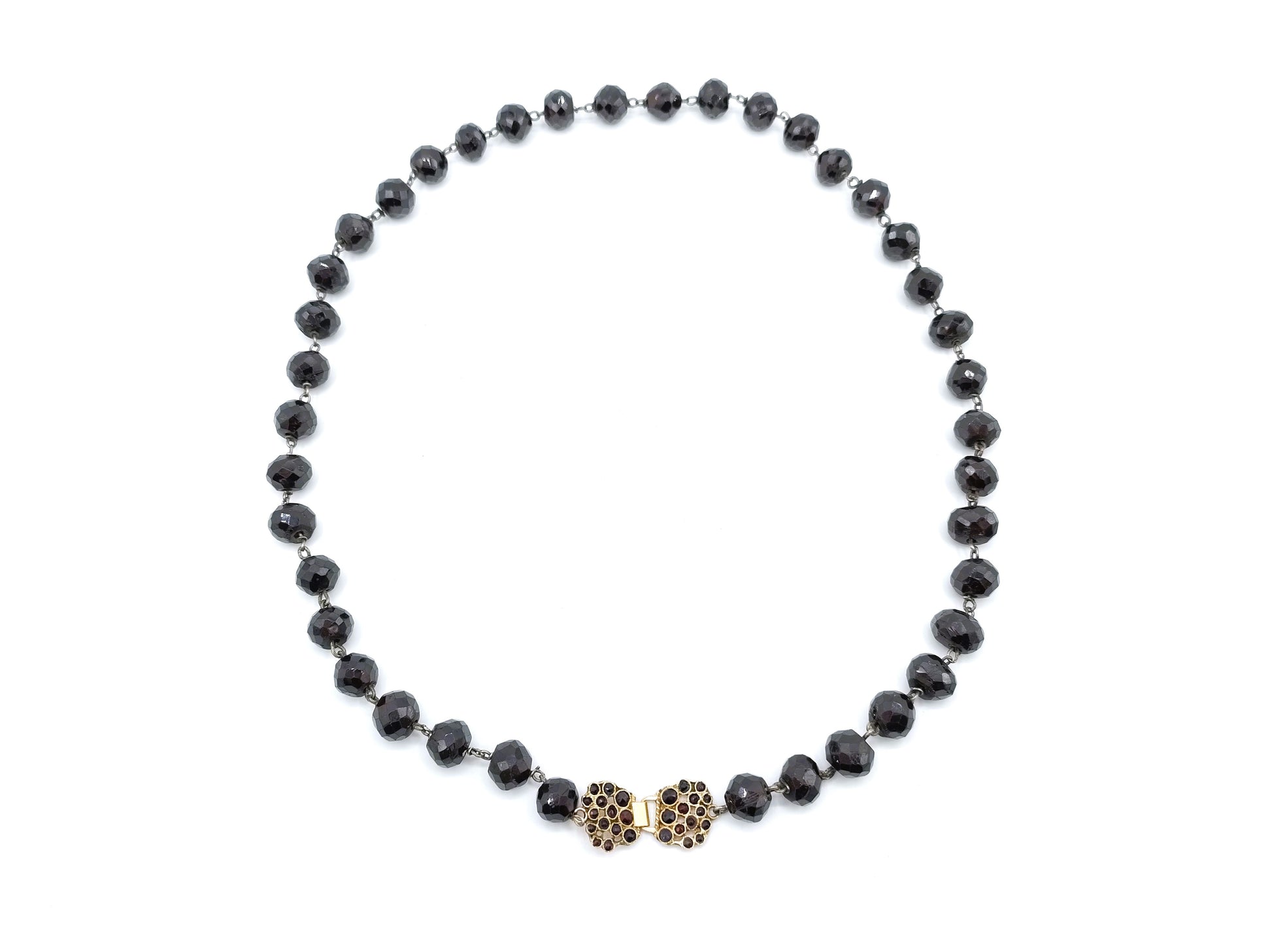 Necklace of faceted garnets strung on silver wire with a gold clasp.