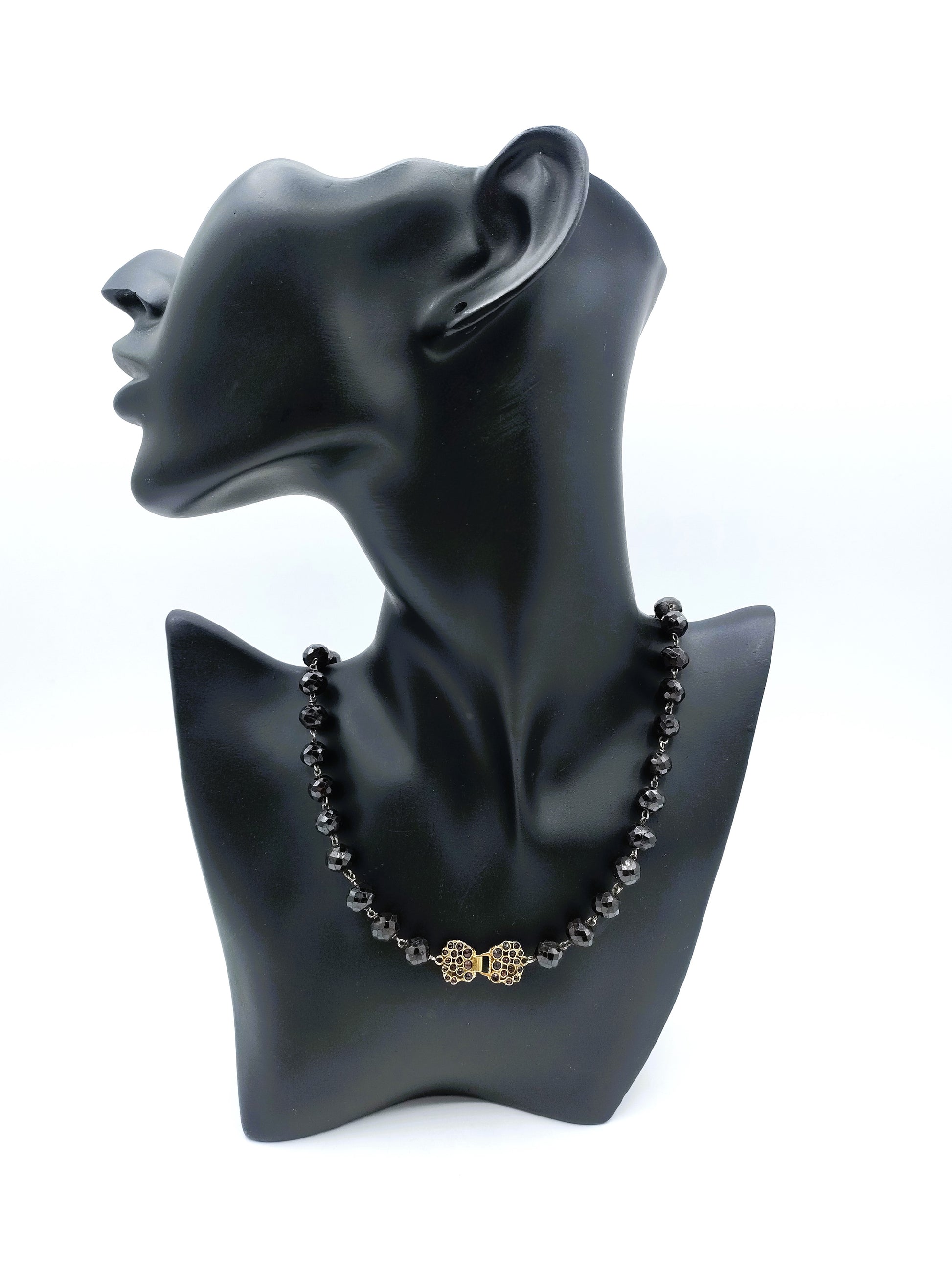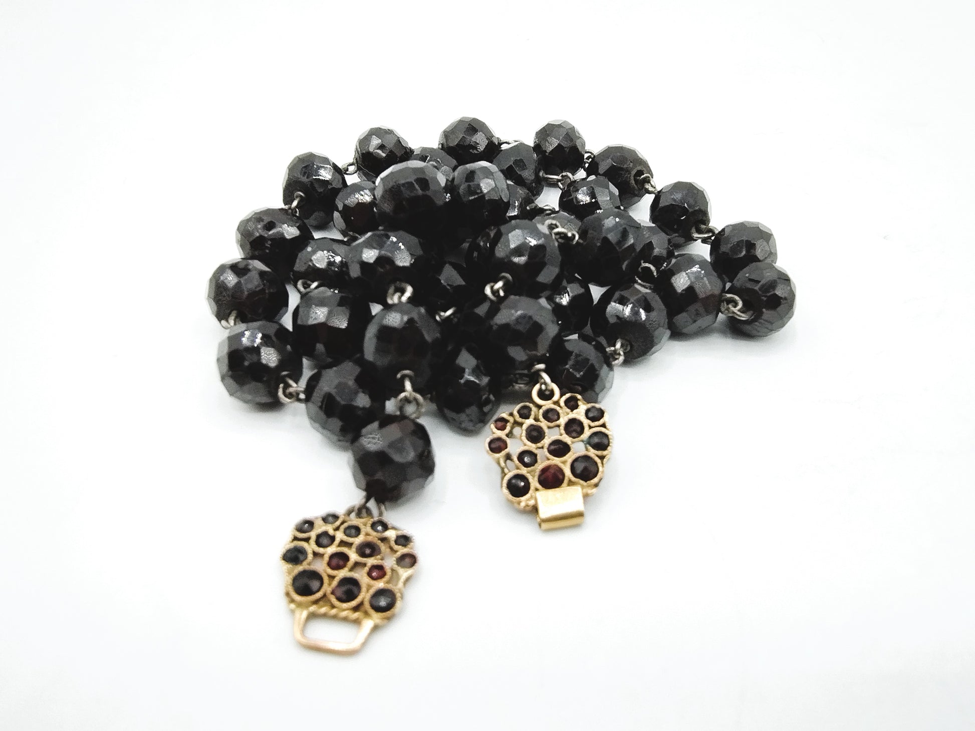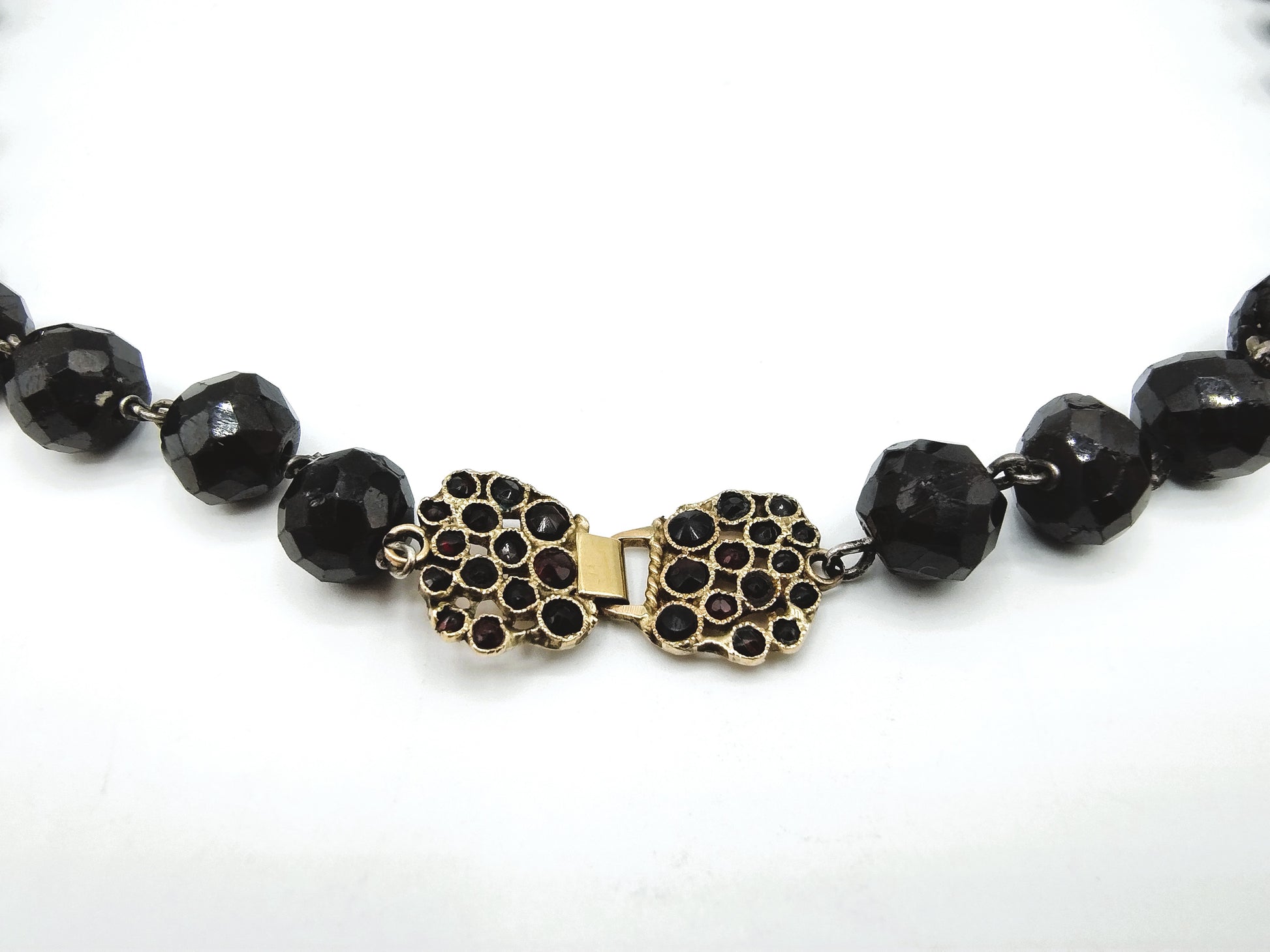 Necklace of faceted garnets strung on silver wire with a gold clasp.