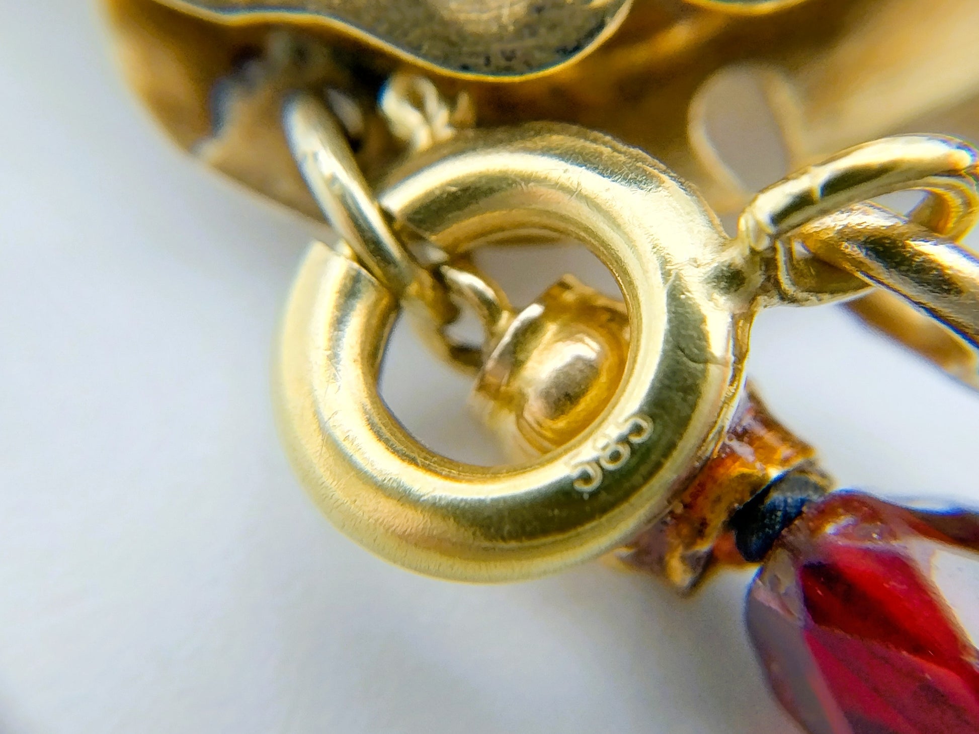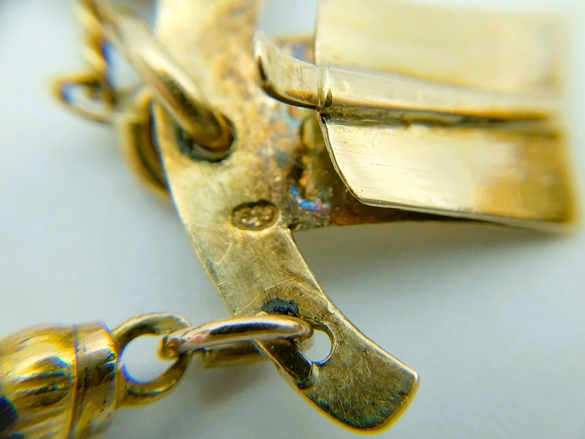 The gold lock is hallmarked with the oak leaf 585 for 14 carat gold. A gold safety chain is attached to the lock.