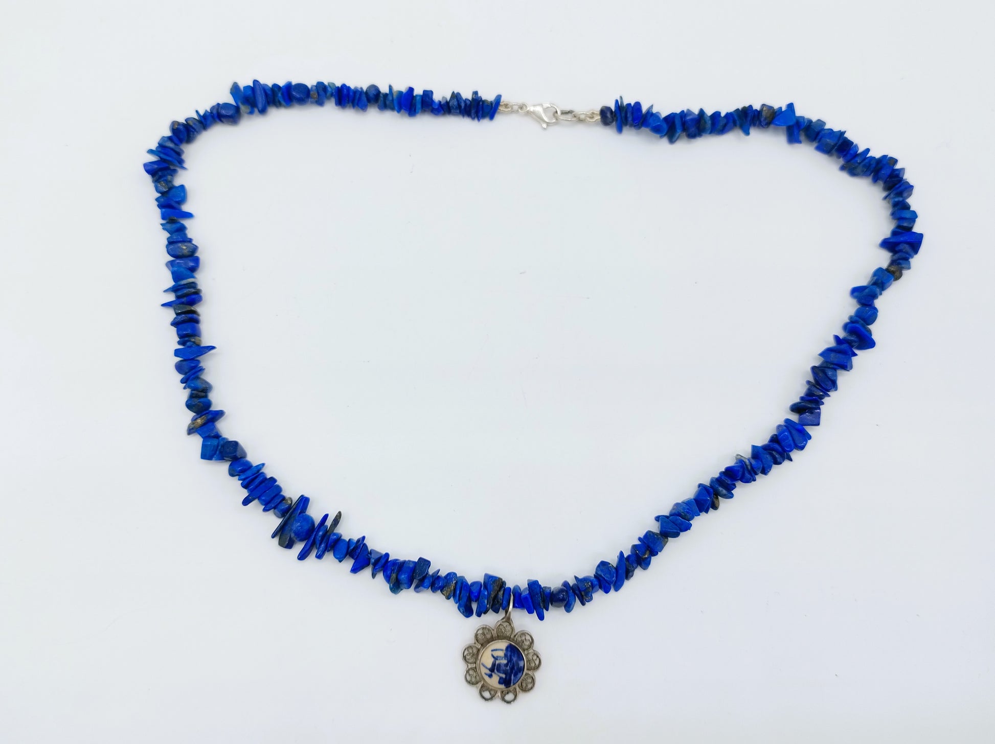 Lapis lazuli necklace with silver Delft blue pendant and clasp, 43.5 cm