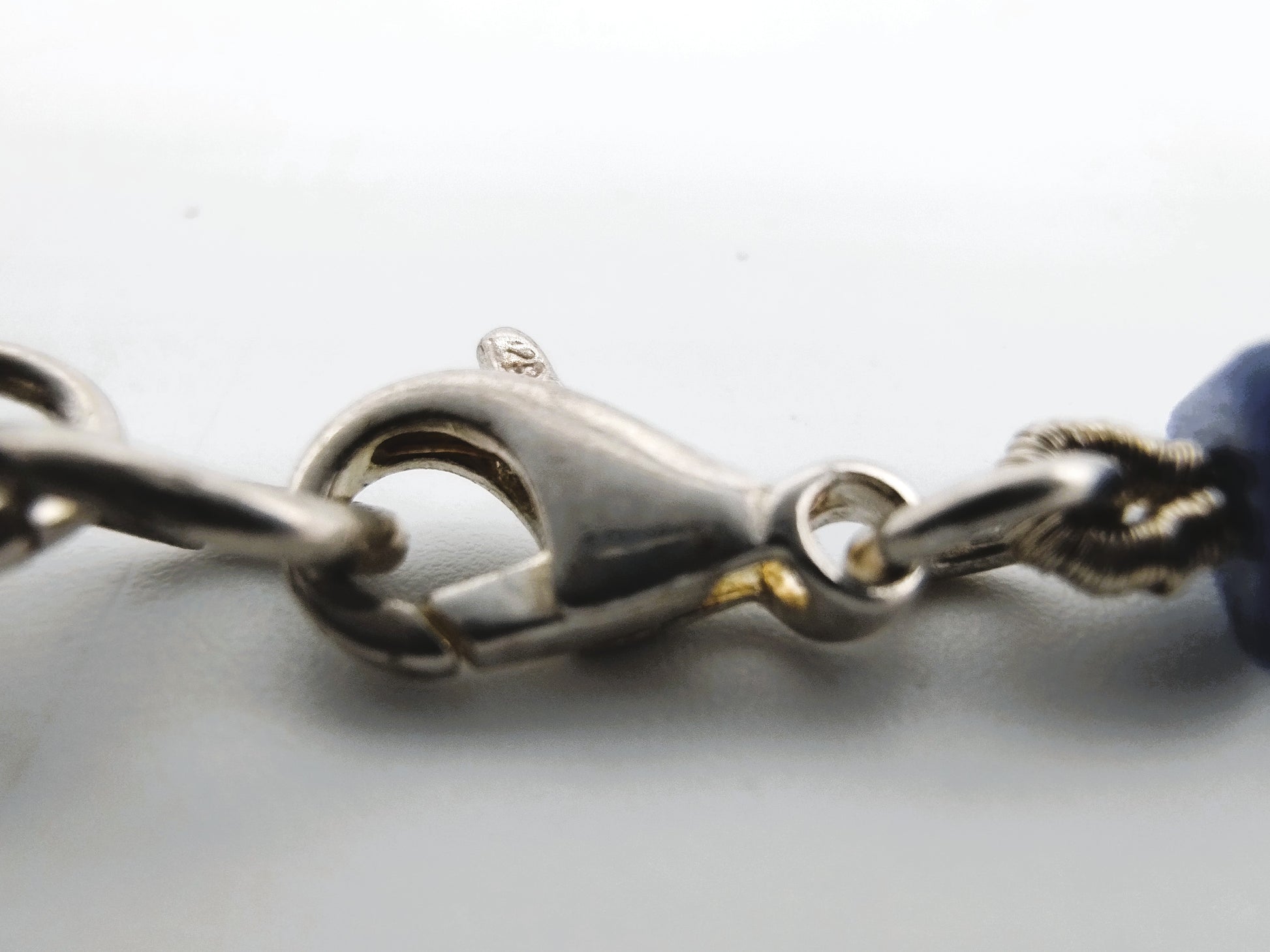 Necklace with a strand of lapis lazuli beads on a sterling silver clasp.
