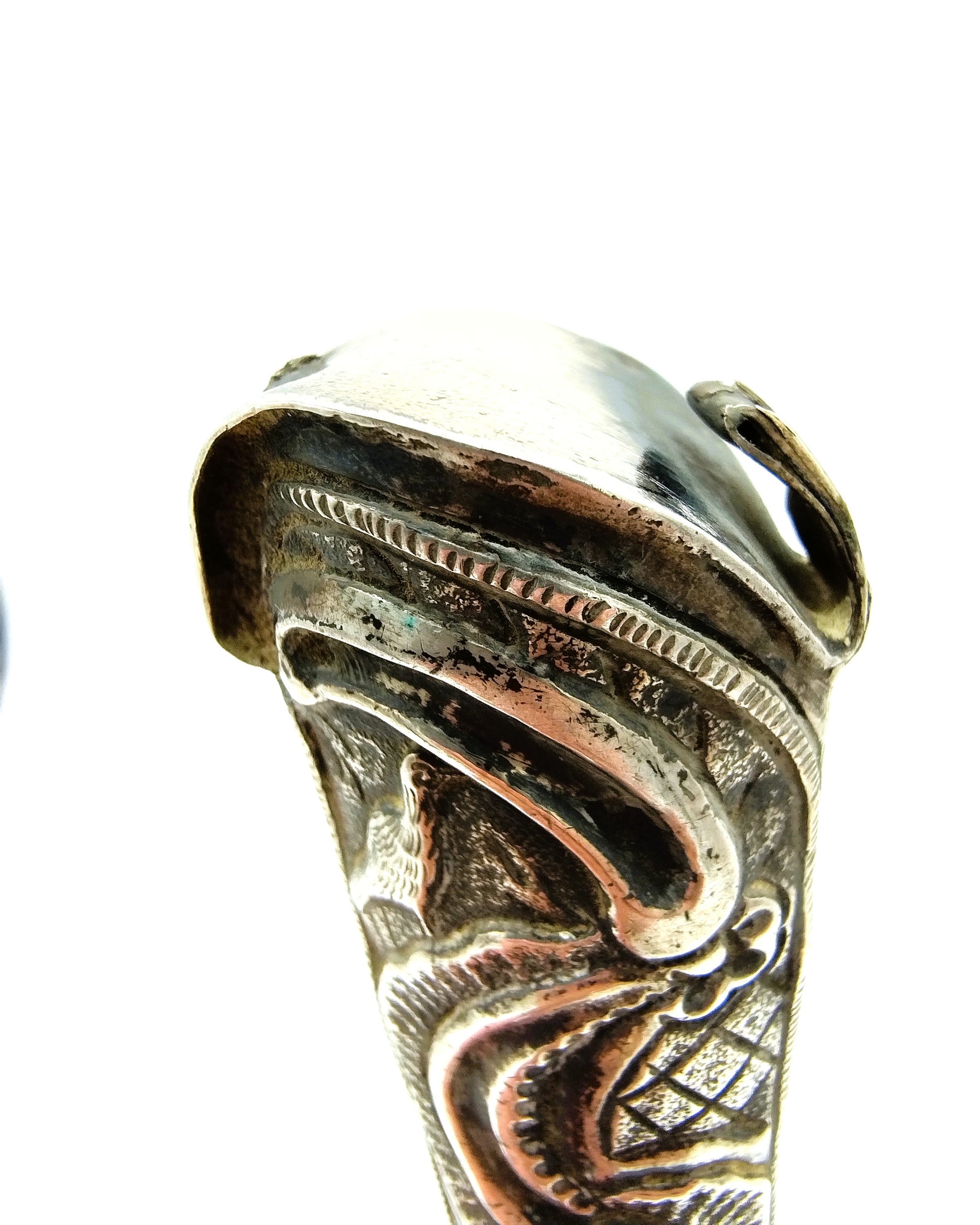 The handle features scrollwork and bird figures. Unfortunately, the crowning element (horse or dog) is missing.