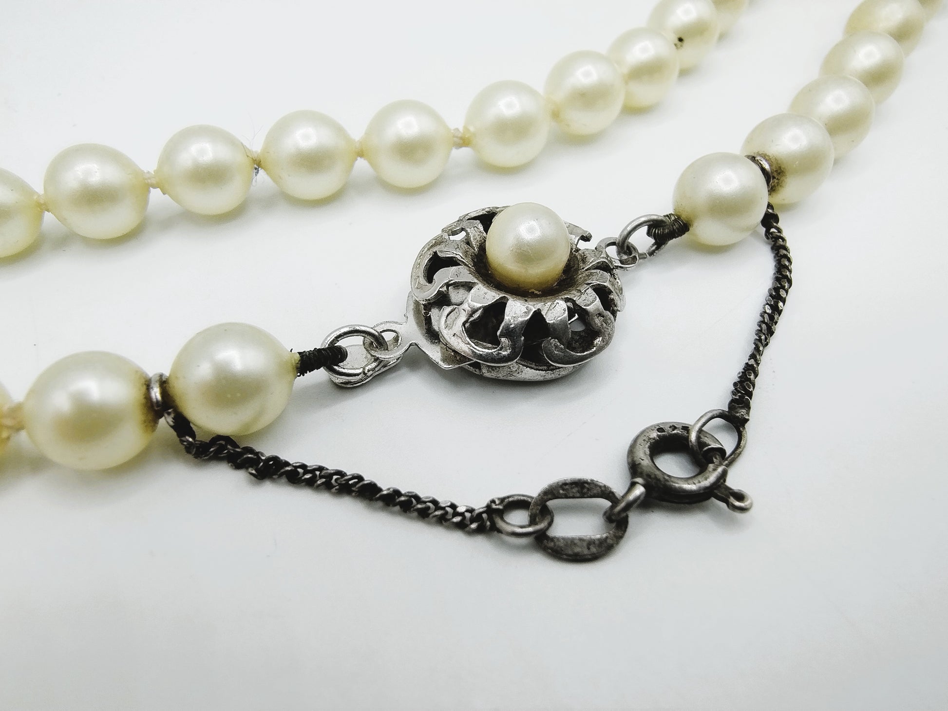 Pearl necklace with a silver clasp. A pearl is set on the clasp.
