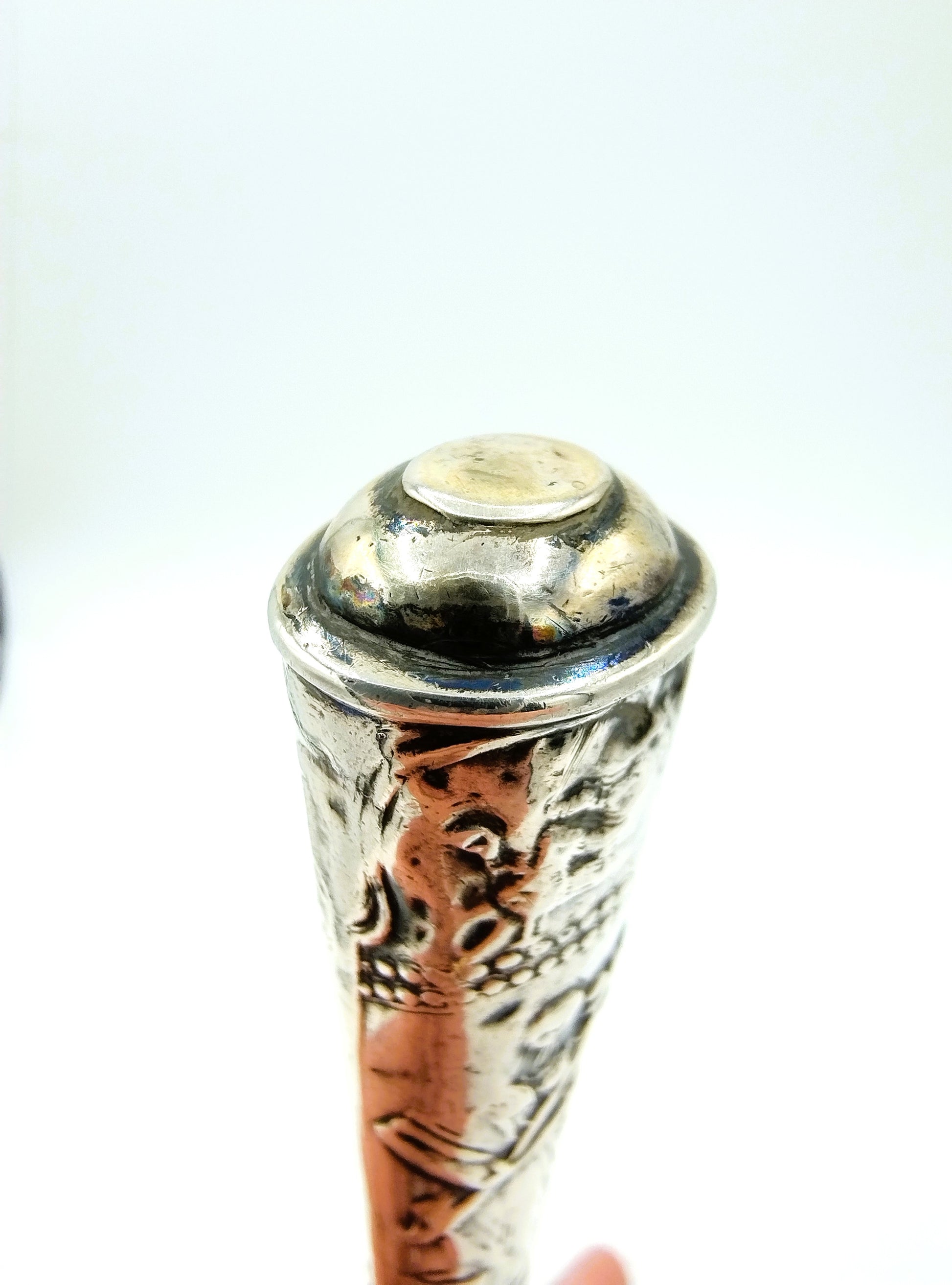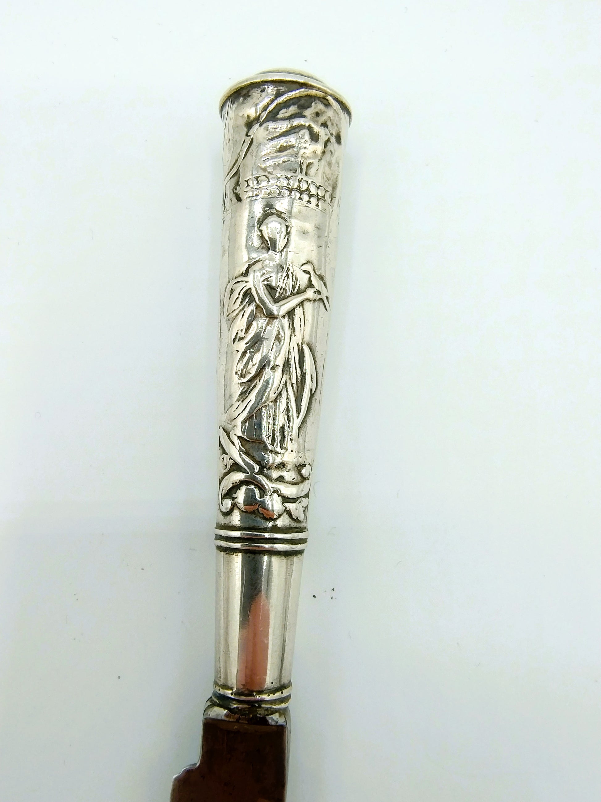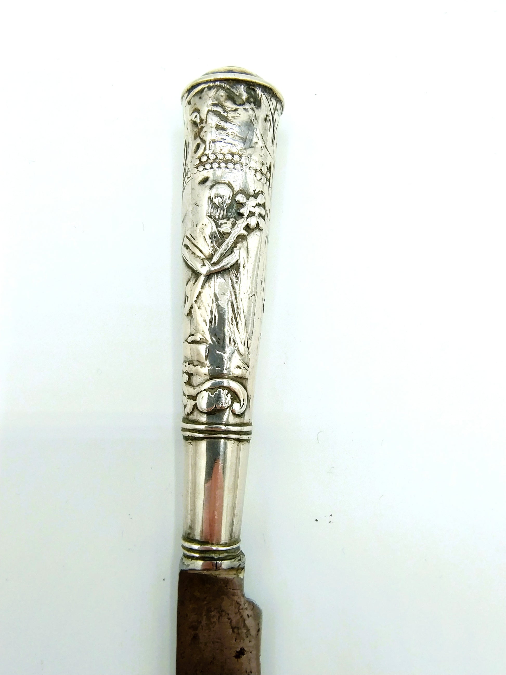 The silver handle is beautifully decorated with images of female figures on both sides. One figure depicts wisdom with a stick and a book. The stick was the symbol of the earthly pilgrimage. The book represents study and wisdom. On the other hand, the female figure depicts trust with an anchor and a bird together symbolizing a casual faith. Anchor represents hope, the bird represents otherworldly freedom. The handle has a dog as a crowning mark as a sign of loyalty.