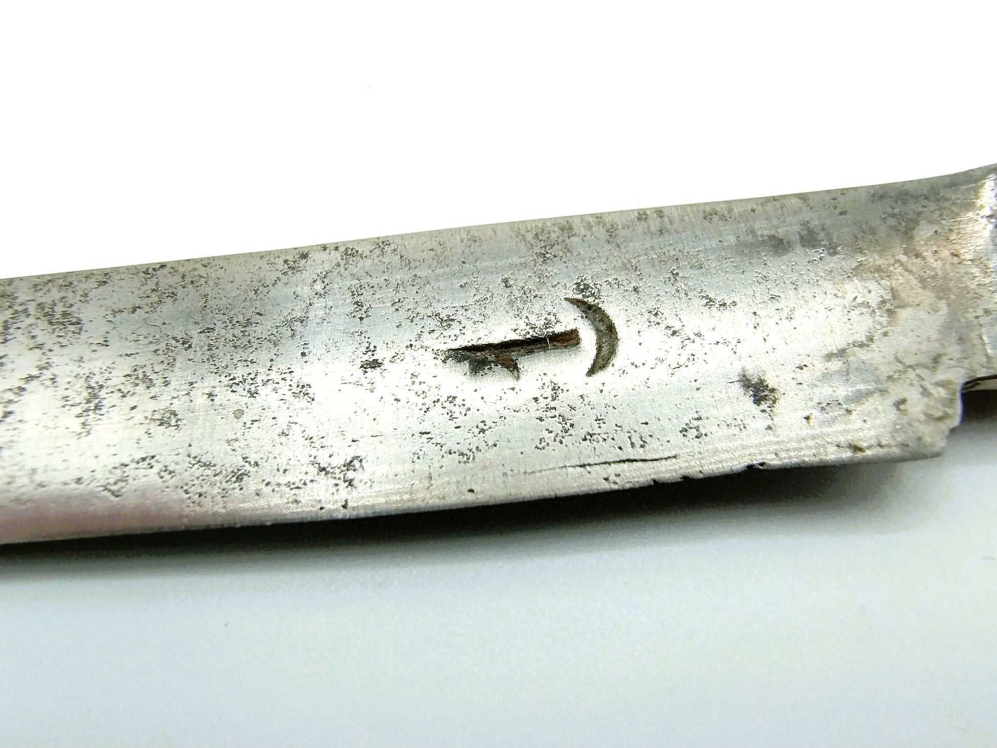 From the 16th to the 19th century they were active in forging knives in Schagen. This knife has a steel blade marked with the Schager mark, the boat hook with the crescent moon underneath.