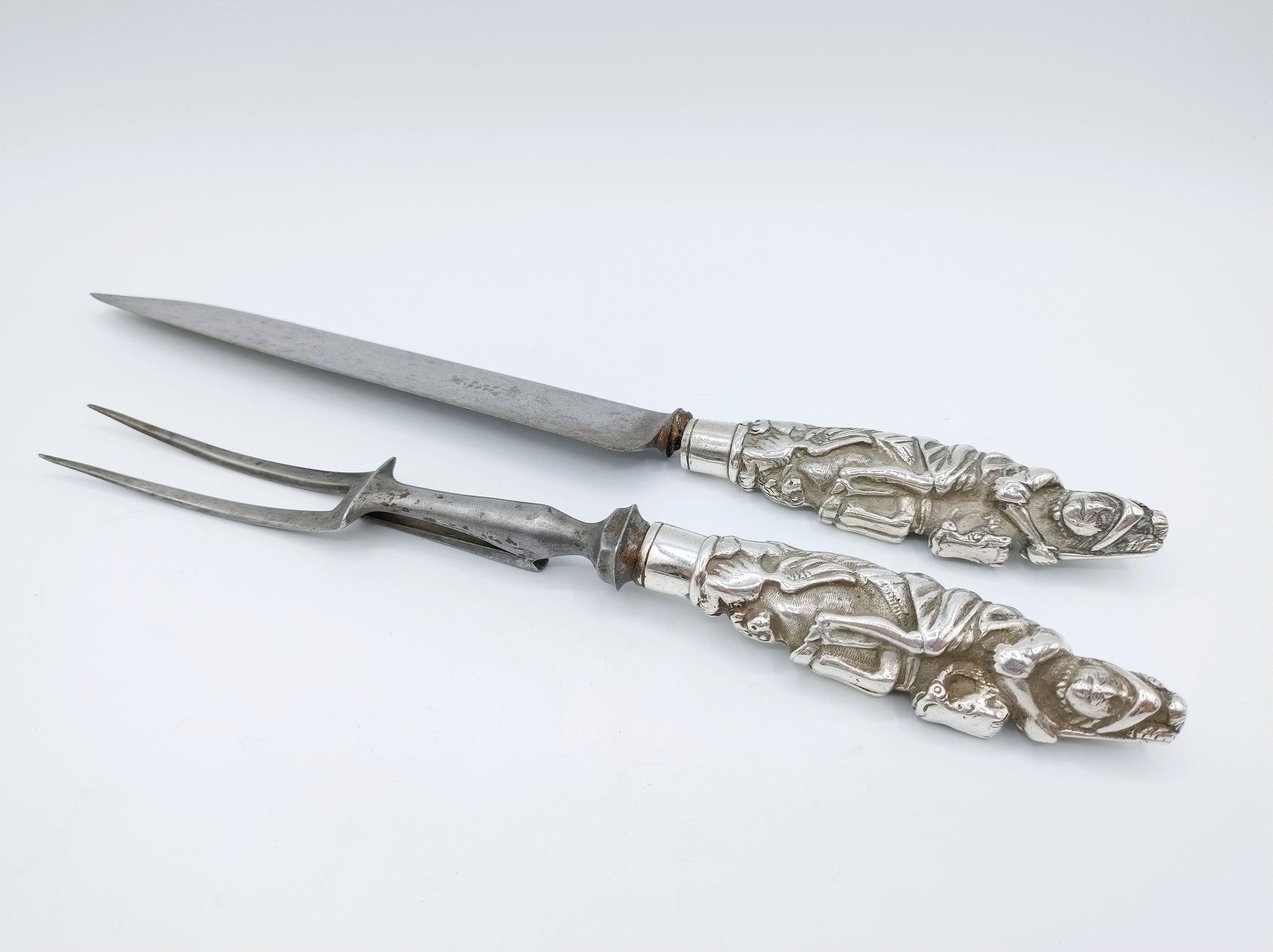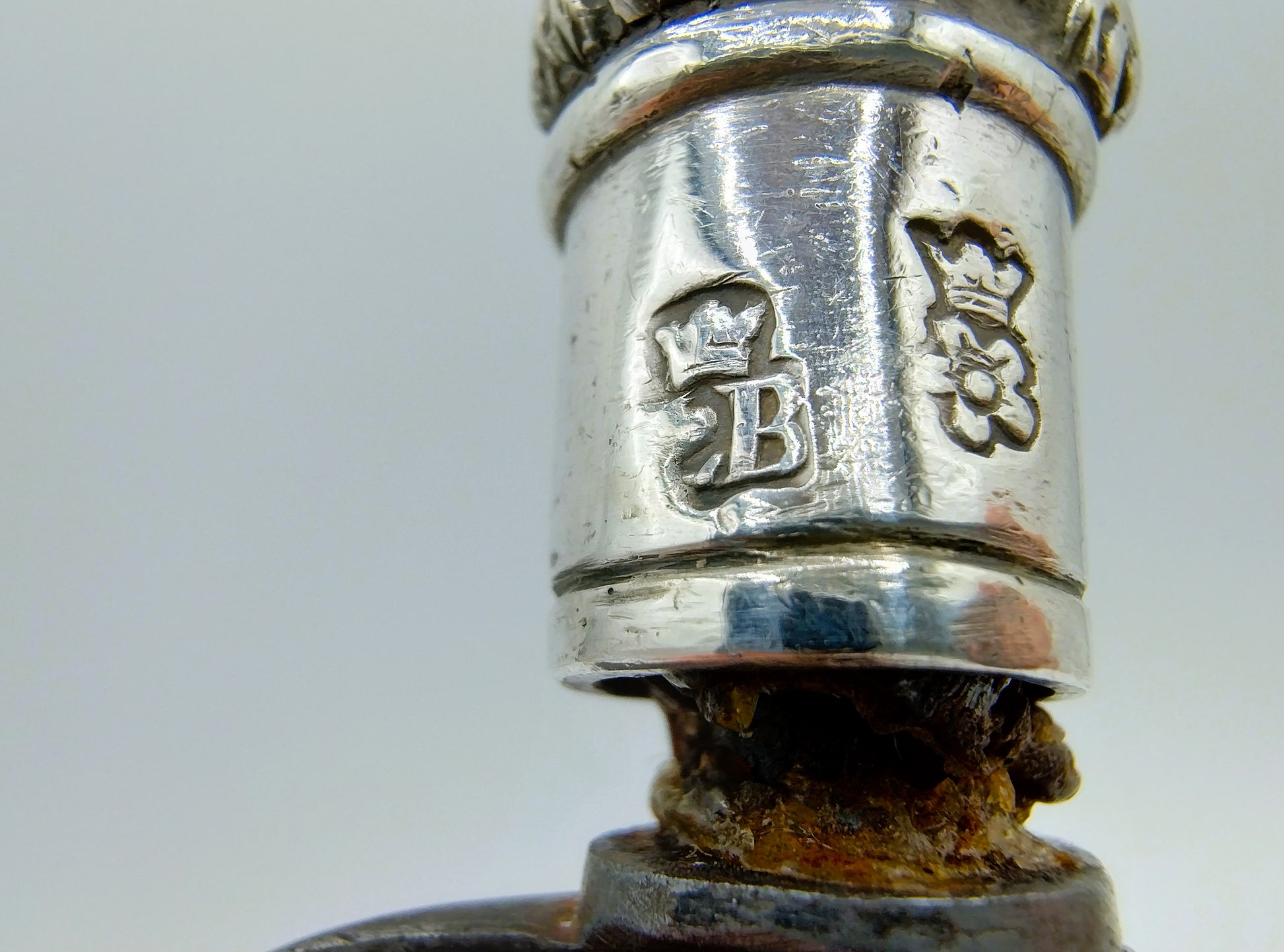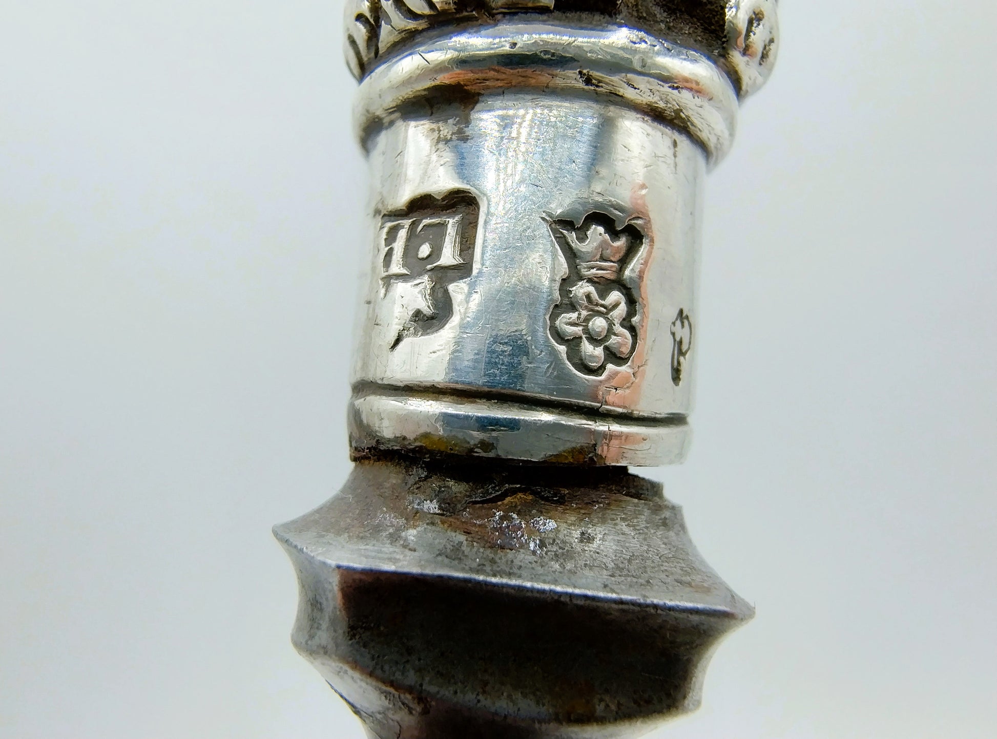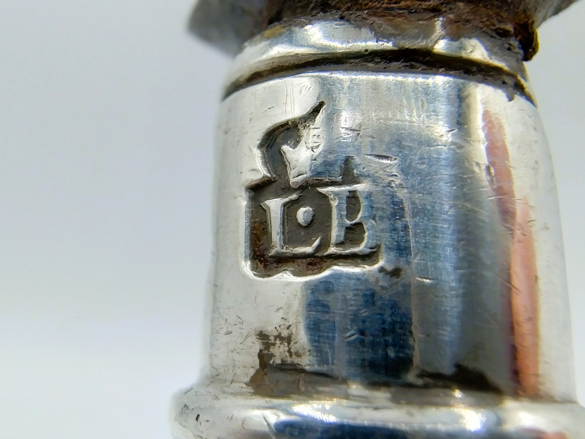 Both handles are hallmarked with probably the city hallmark of Dordrecht and master hallmark LB under a crown for an unknown silversmith. Also the tax mark hatchet is struck off.
