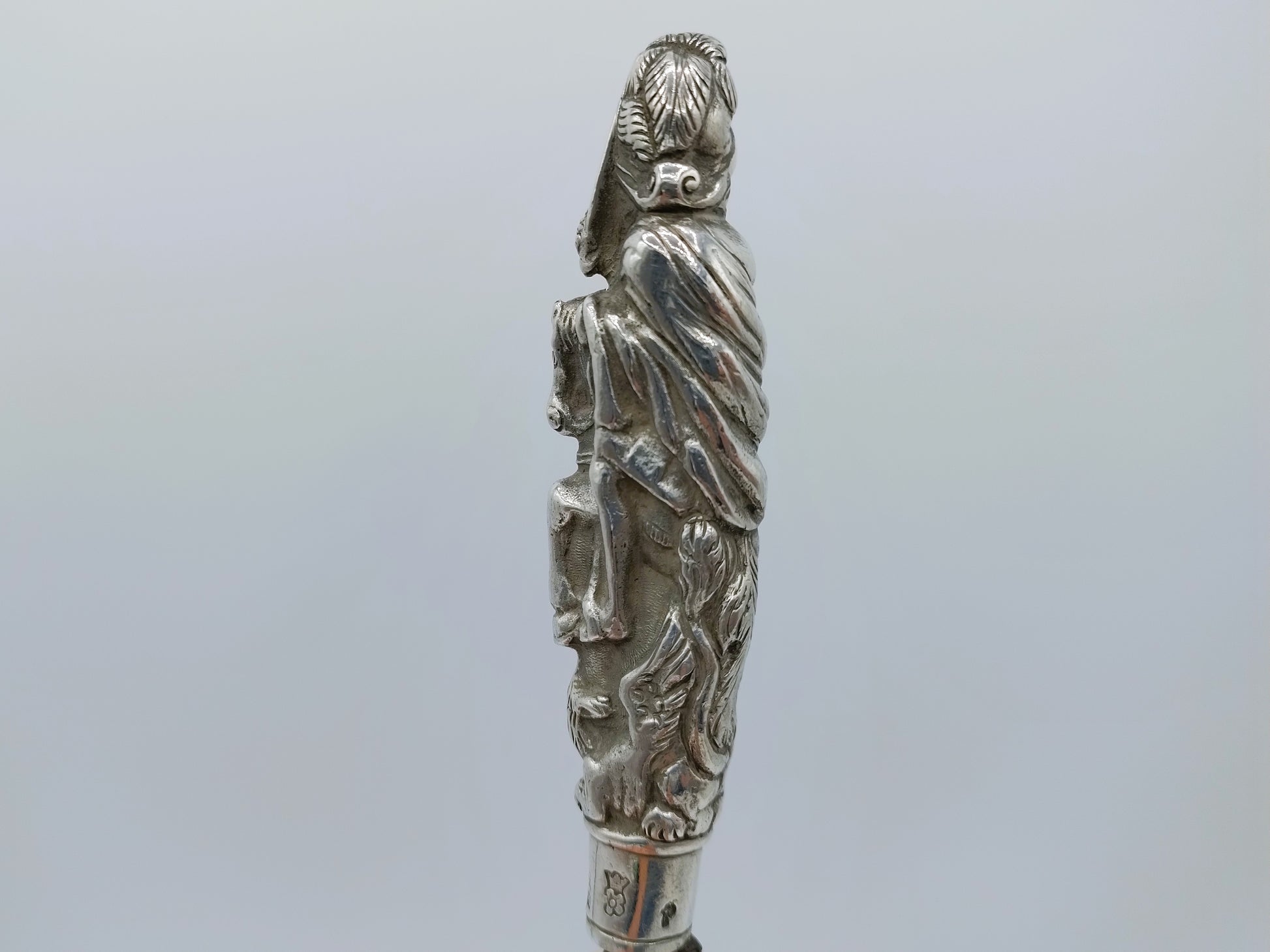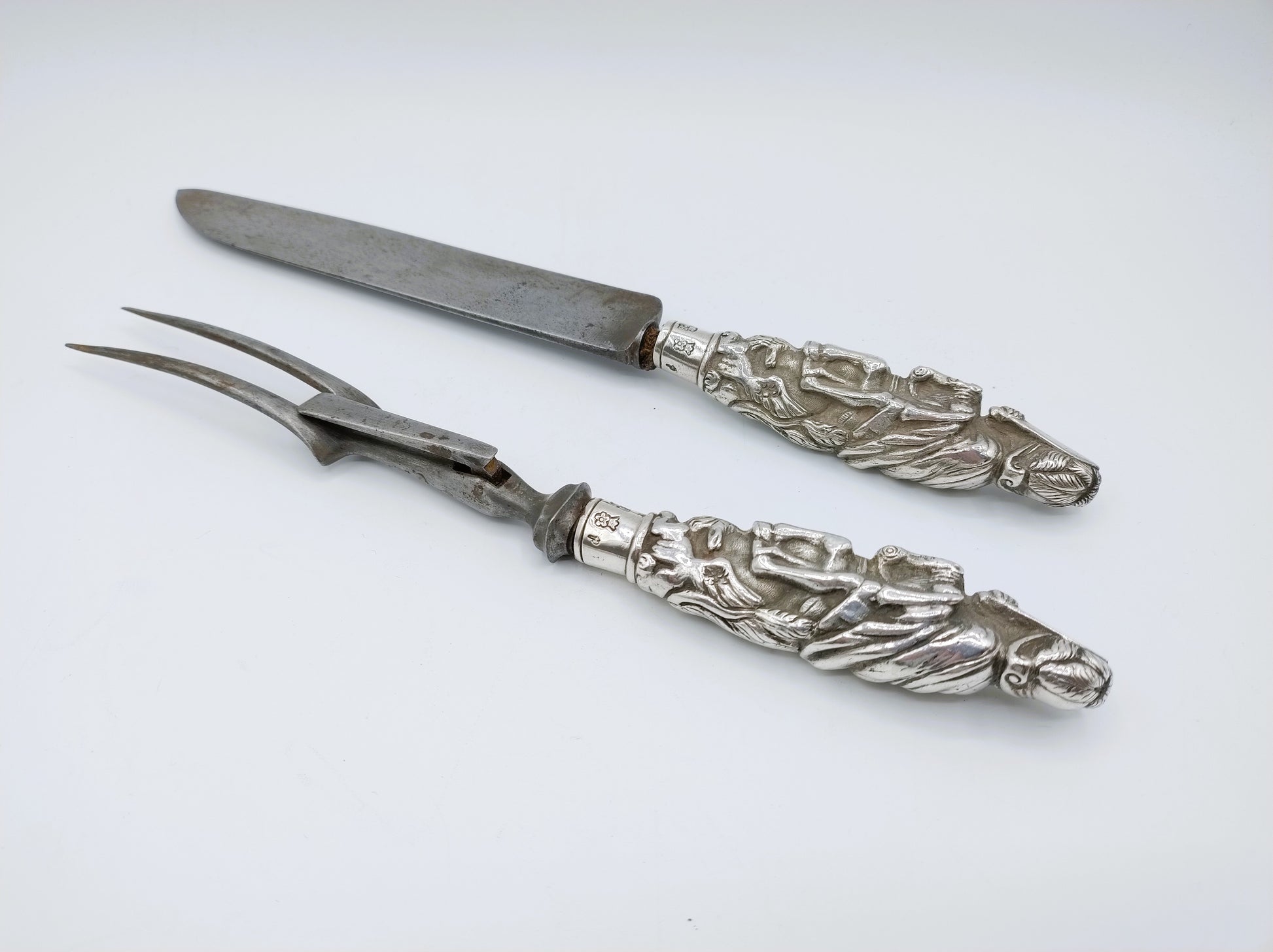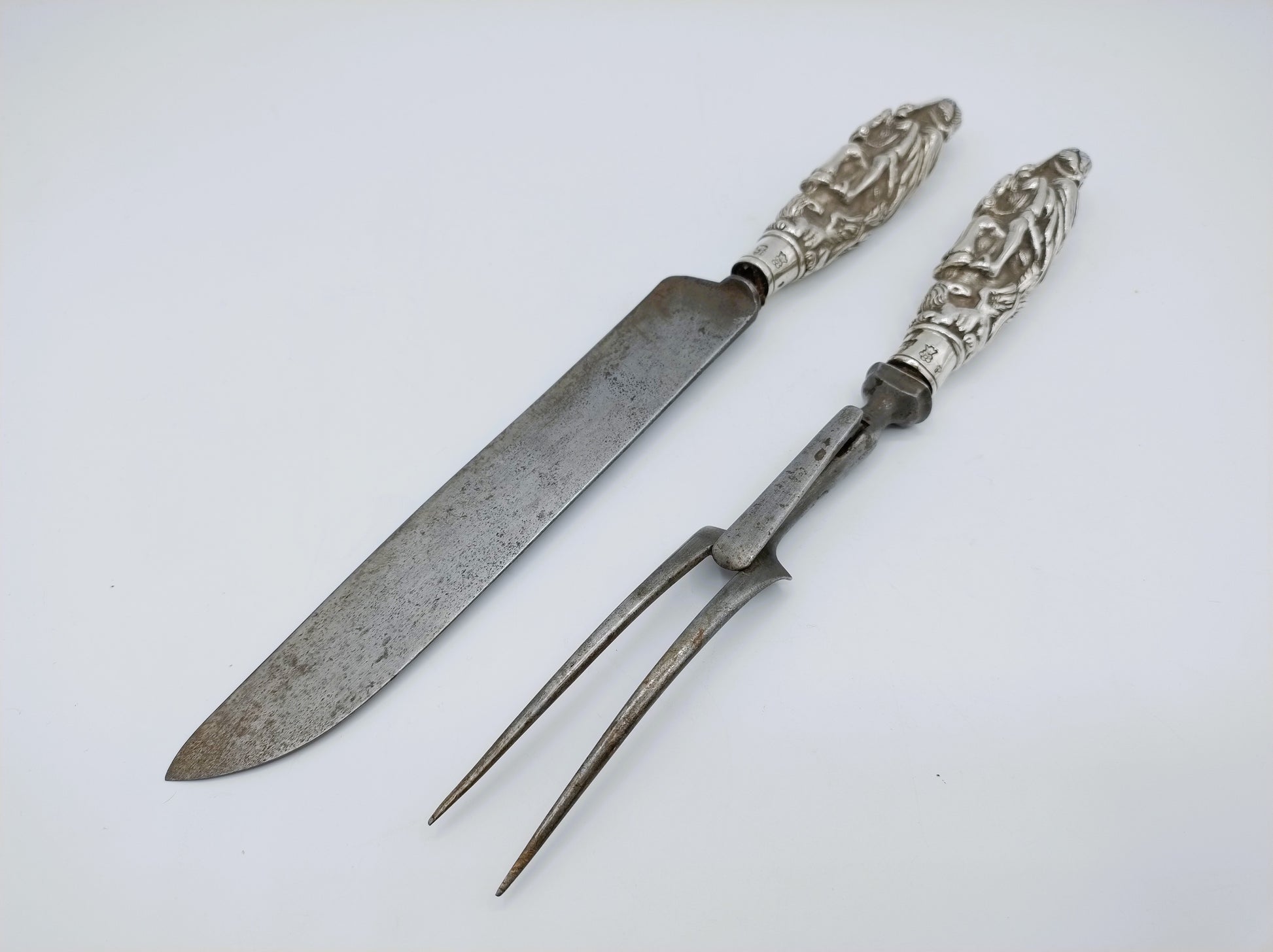 Both handles are hallmarked with probably the city hallmark of Dordrecht and master hallmark LB under a crown for an unknown silversmith. Also the tax mark hatchet is struck off.