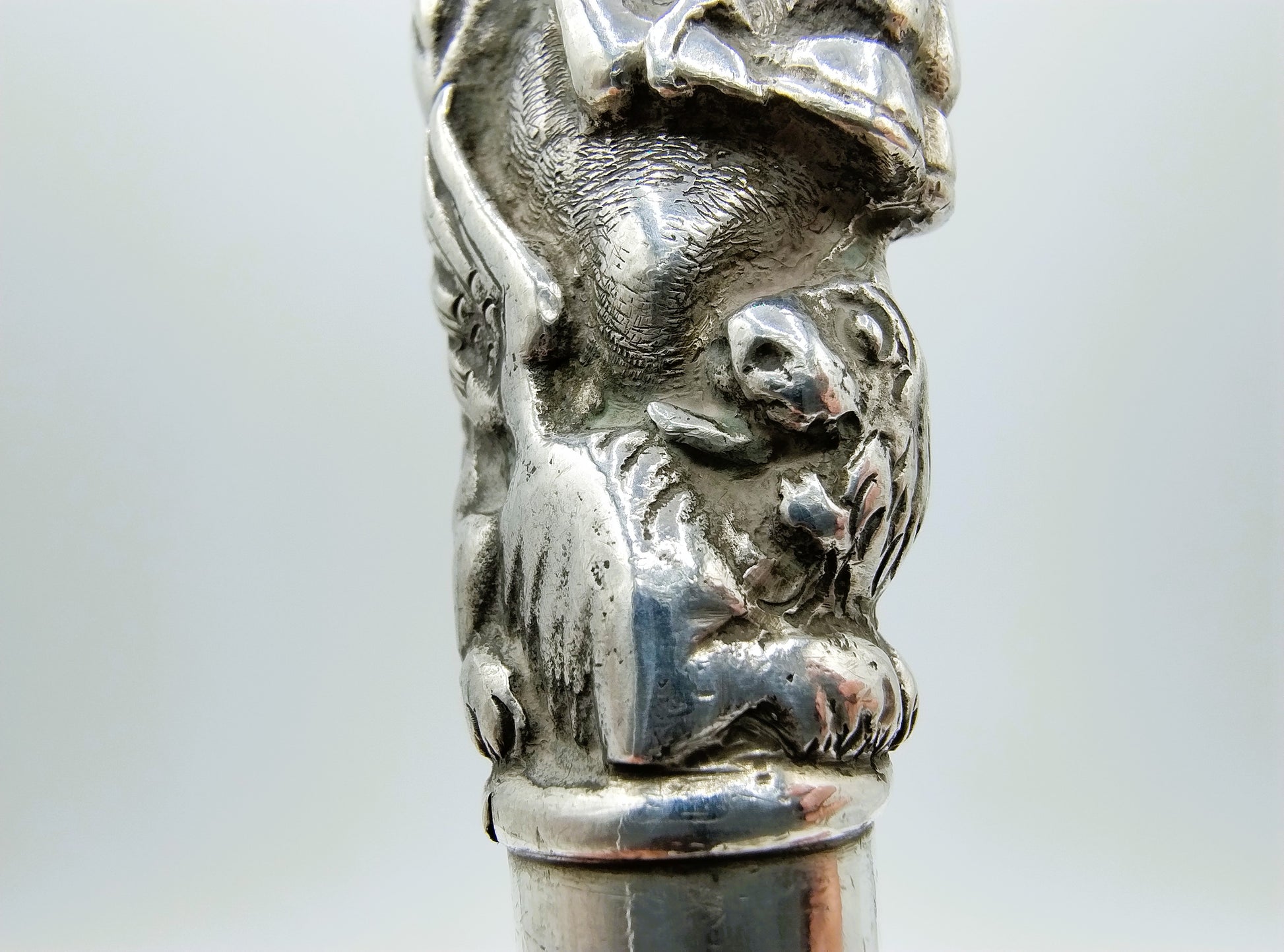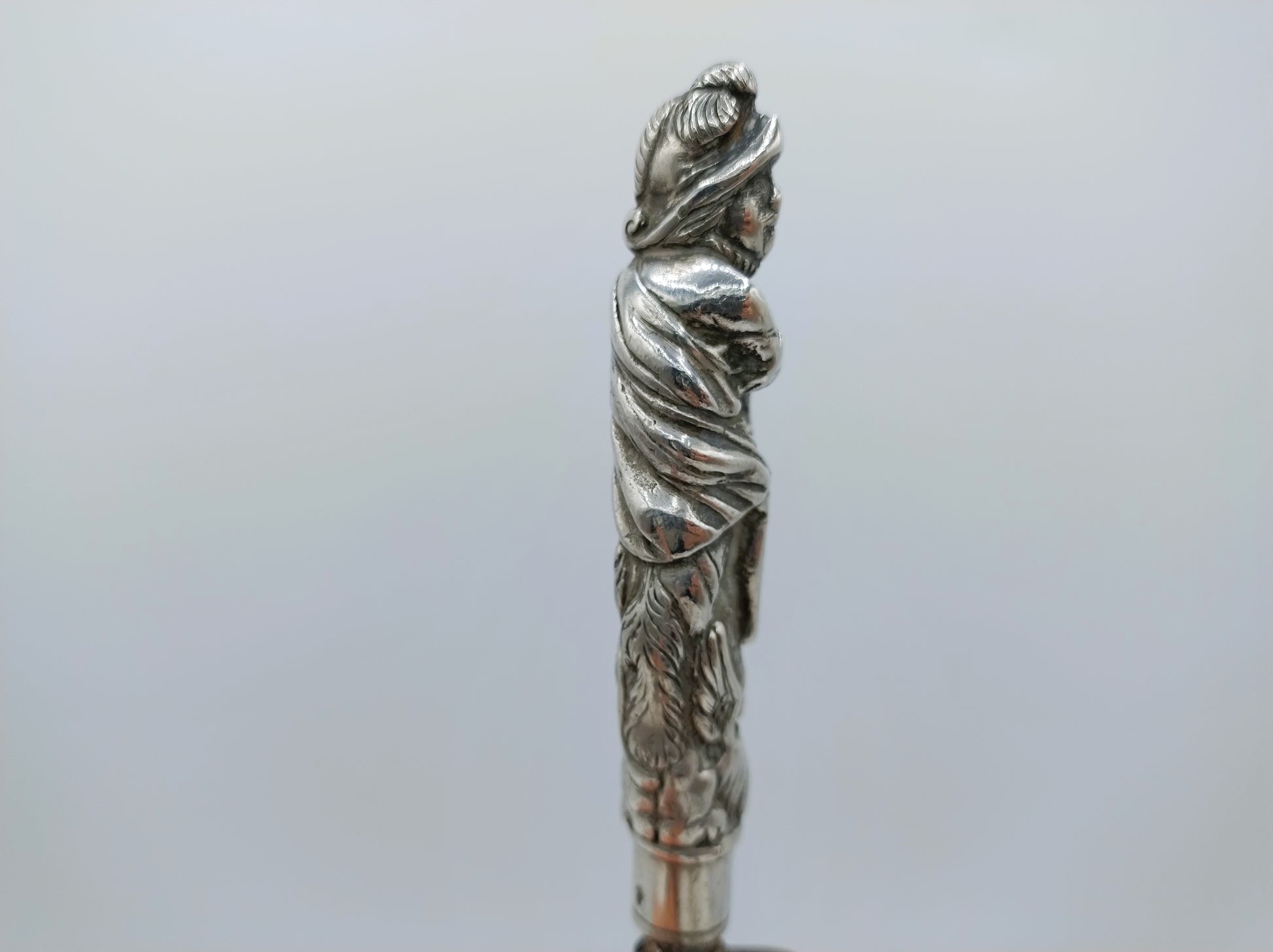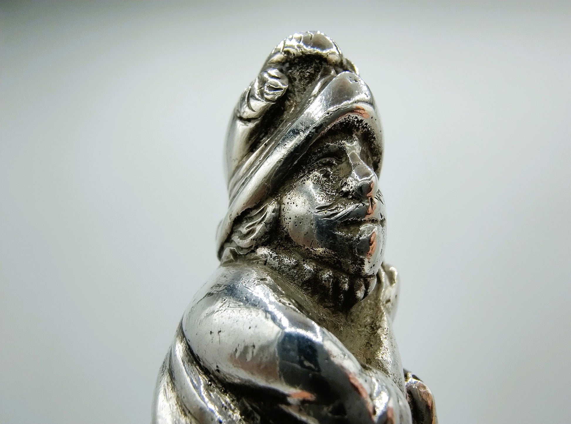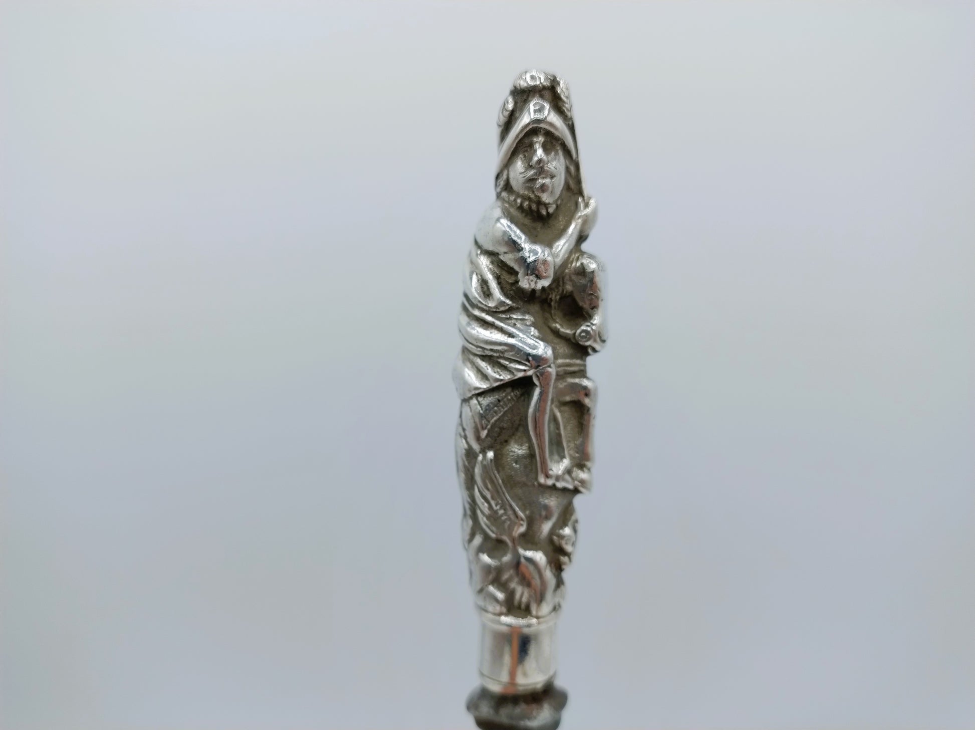 Both handles are hallmarked with probably the city hallmark of Dordrecht and master hallmark LB under a crown for an unknown silversmith. Also the tax mark hatchet is struck off.