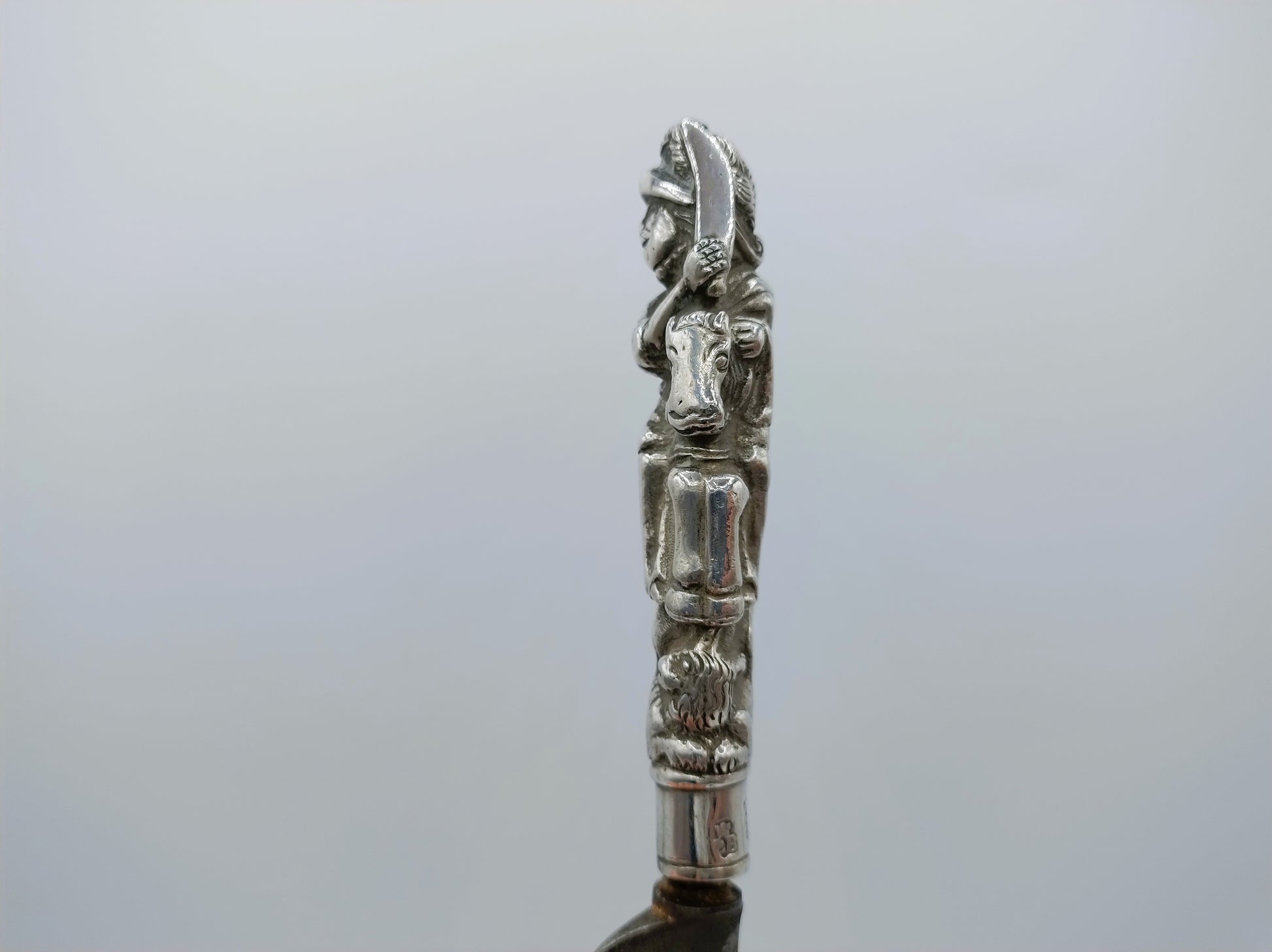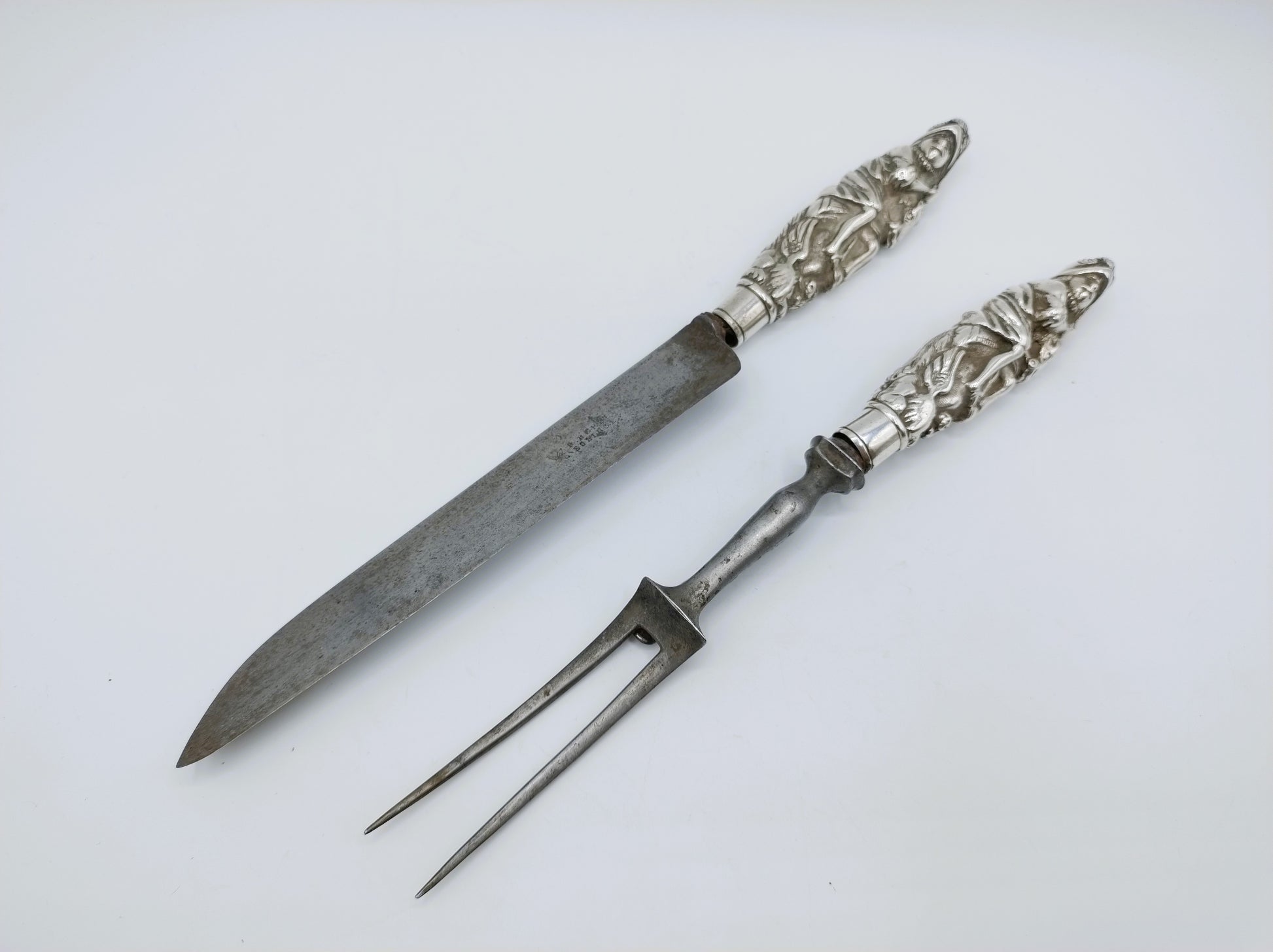 Cutting or slicing cutlery with heavy silver handles and steel blade.