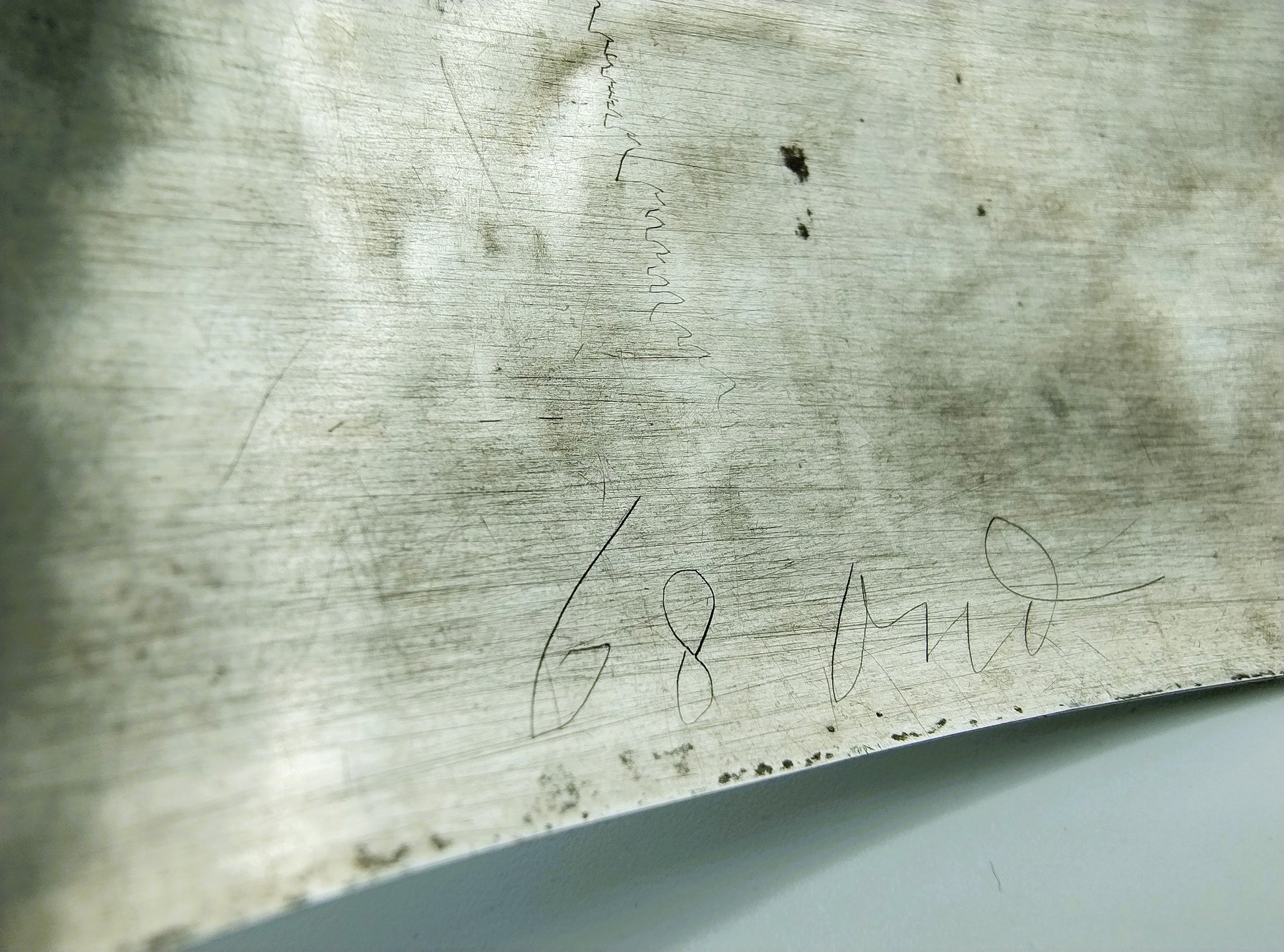 The ear iron has a small tear behind the stitching and some dents. See the photos for these.