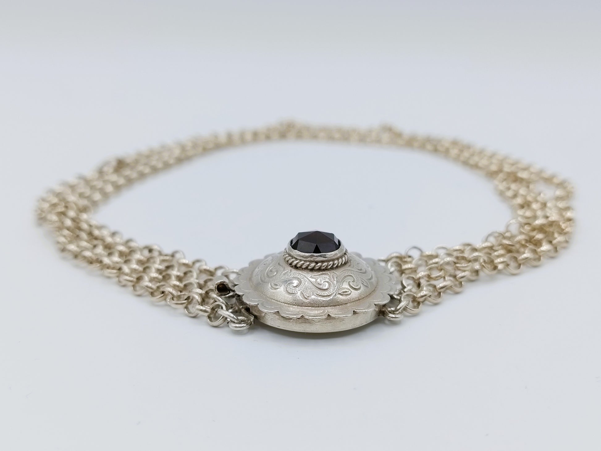 Silver necklace with 4 rows of jasseron chains connected to a silver clasp with a cut garnet with a diameter of 8 mm.