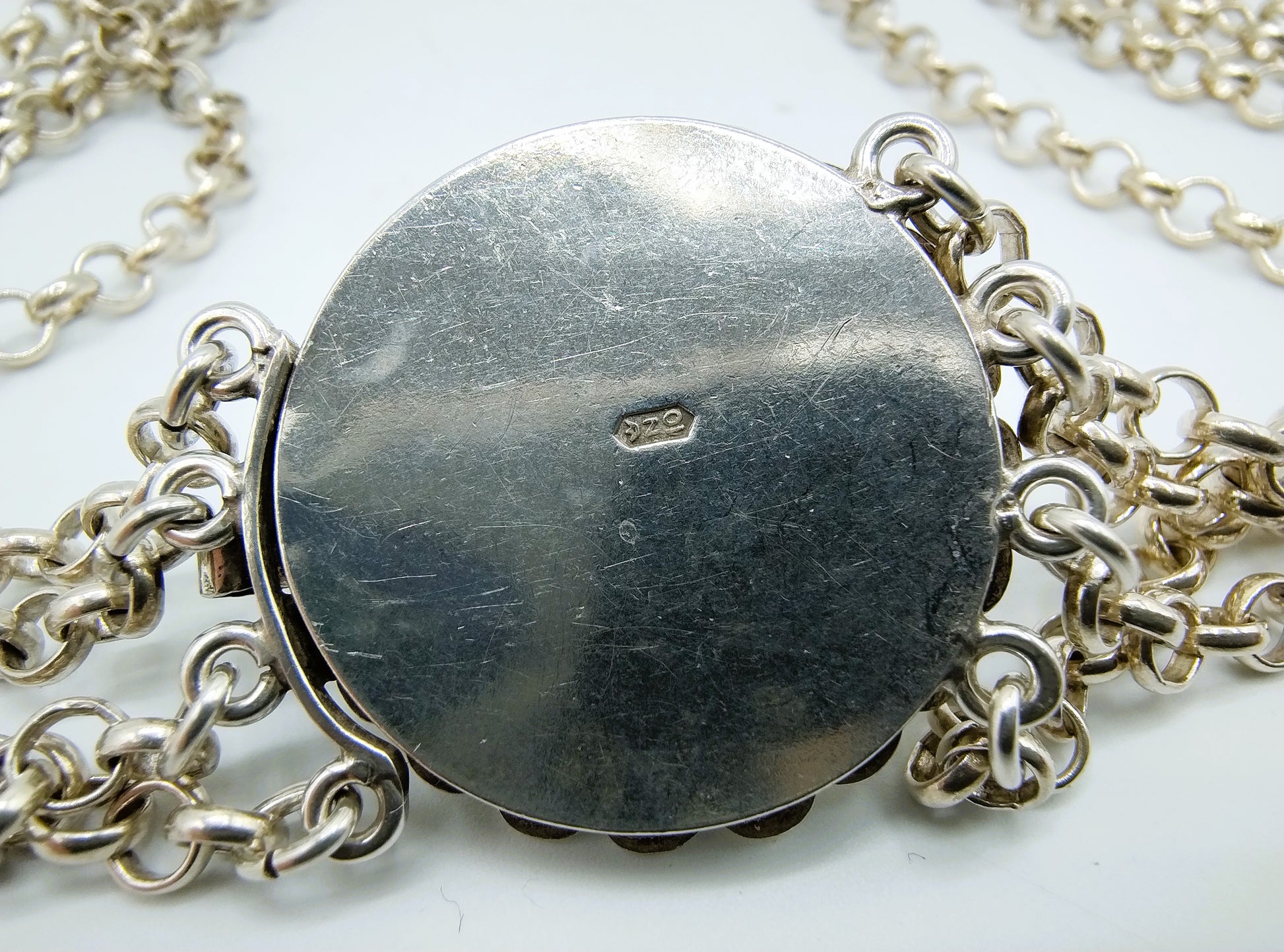 The silver clasp has a diameter of 2.5 cm. It is hallmarked with the 835 sword for second-grade silver and the N10 maker's mark under the crown of the Niekerk Company from Schoonhoven.