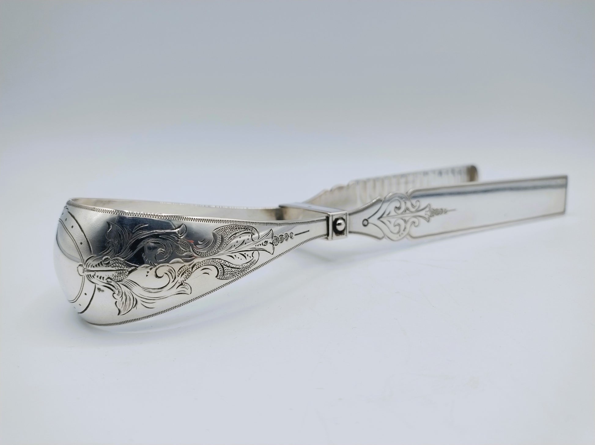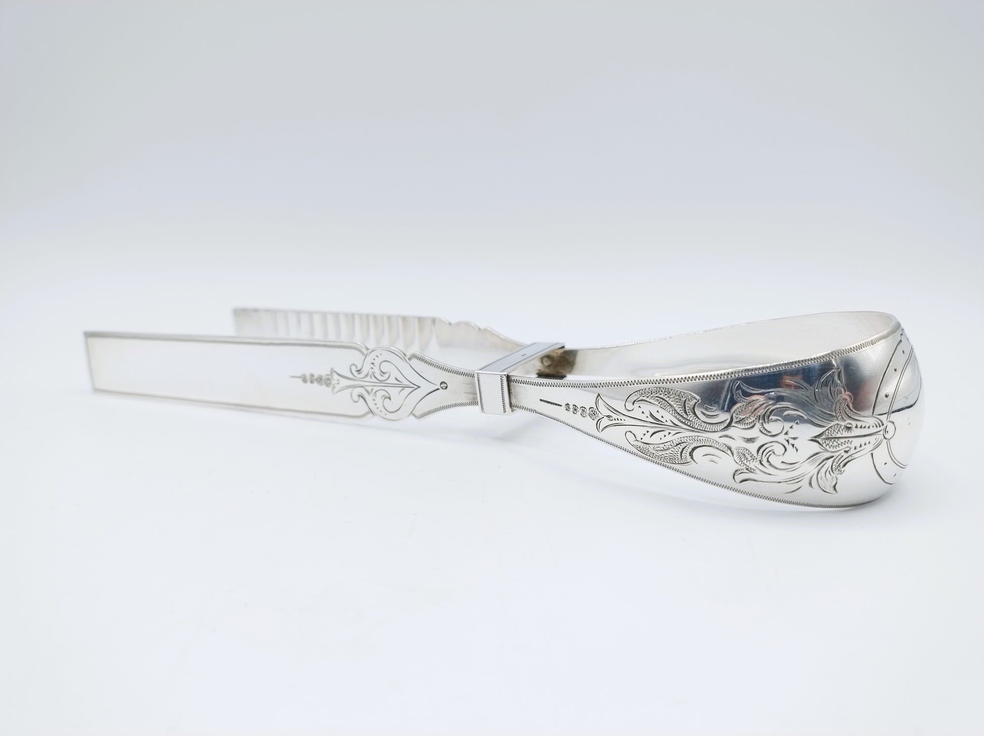 The asparagus tongs feature beautiful floral engraving in the Biedermeier style.