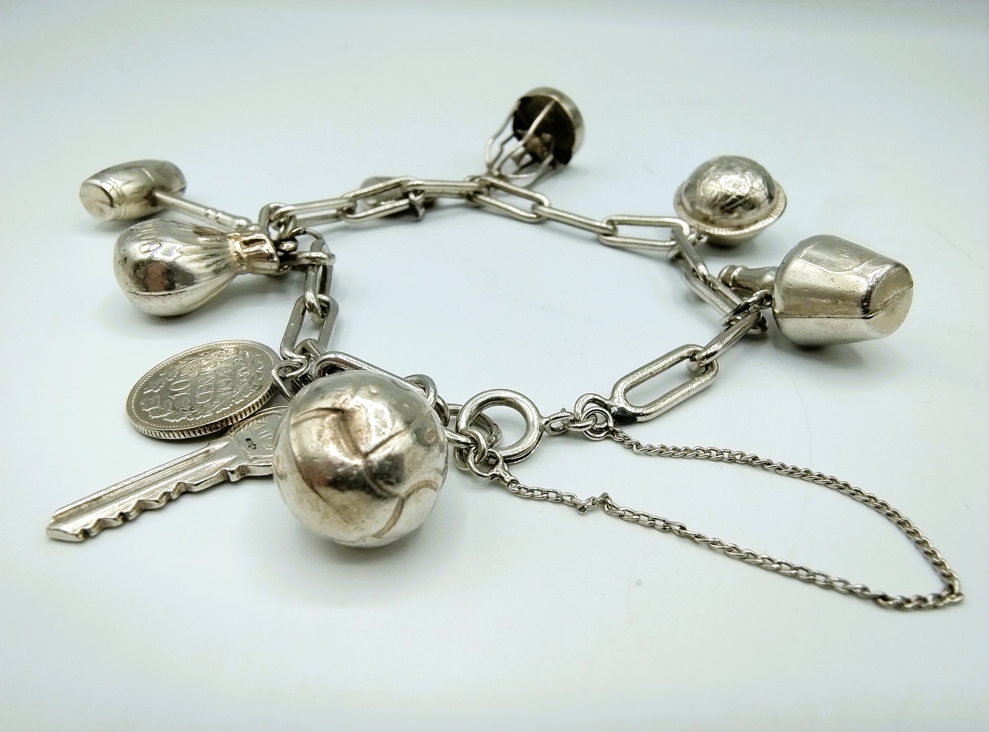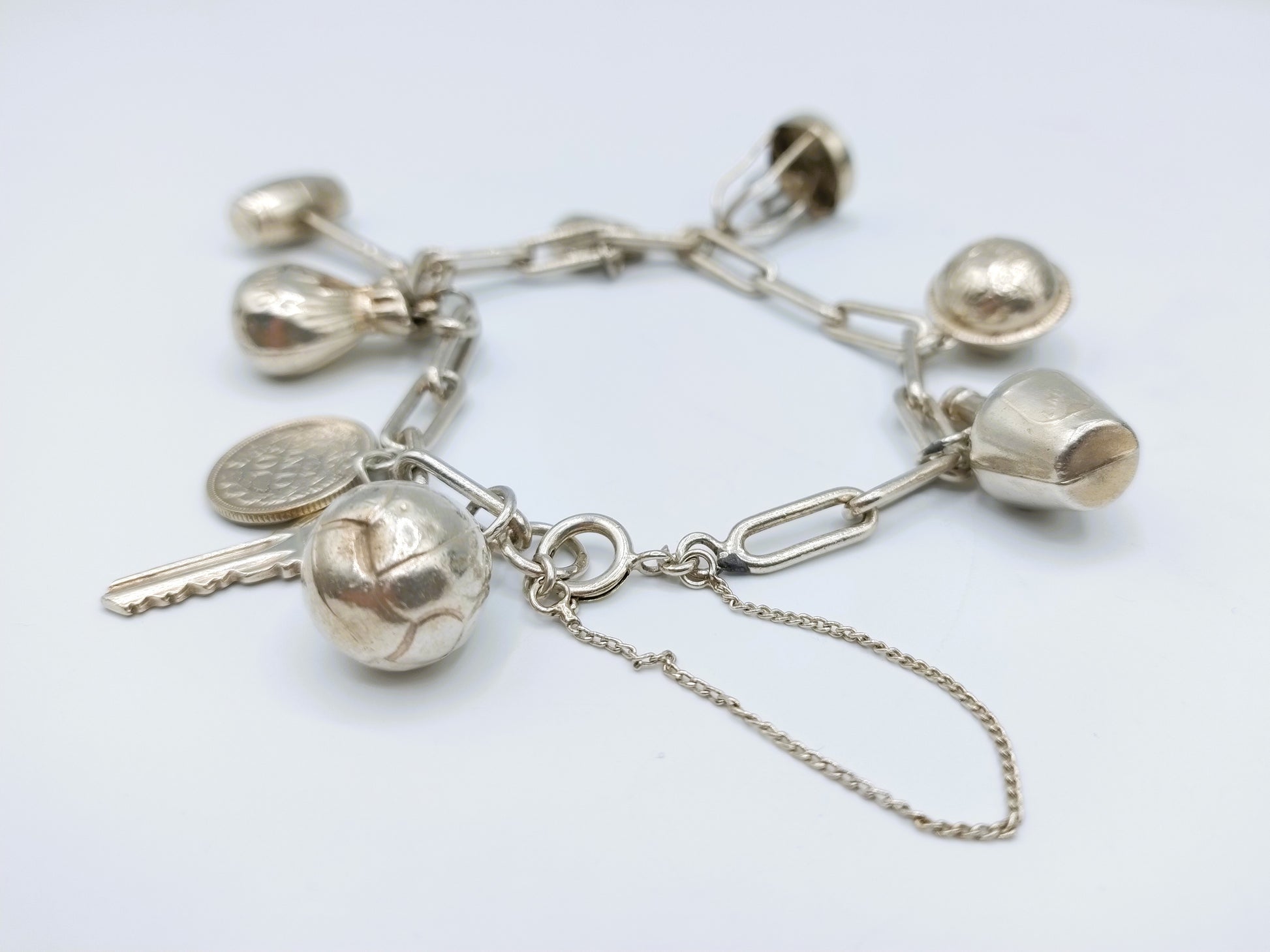 The bracelet has 9 silver charms, namely: a dime, key, football, jug, globe, birdcage, heart, hammer and bag of money.
