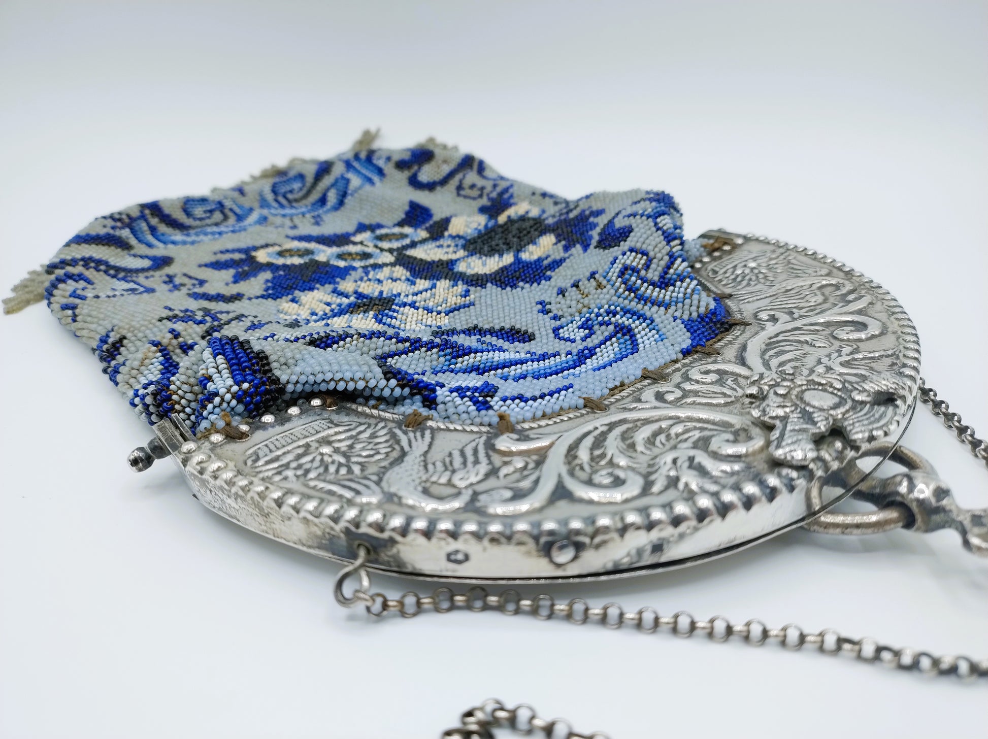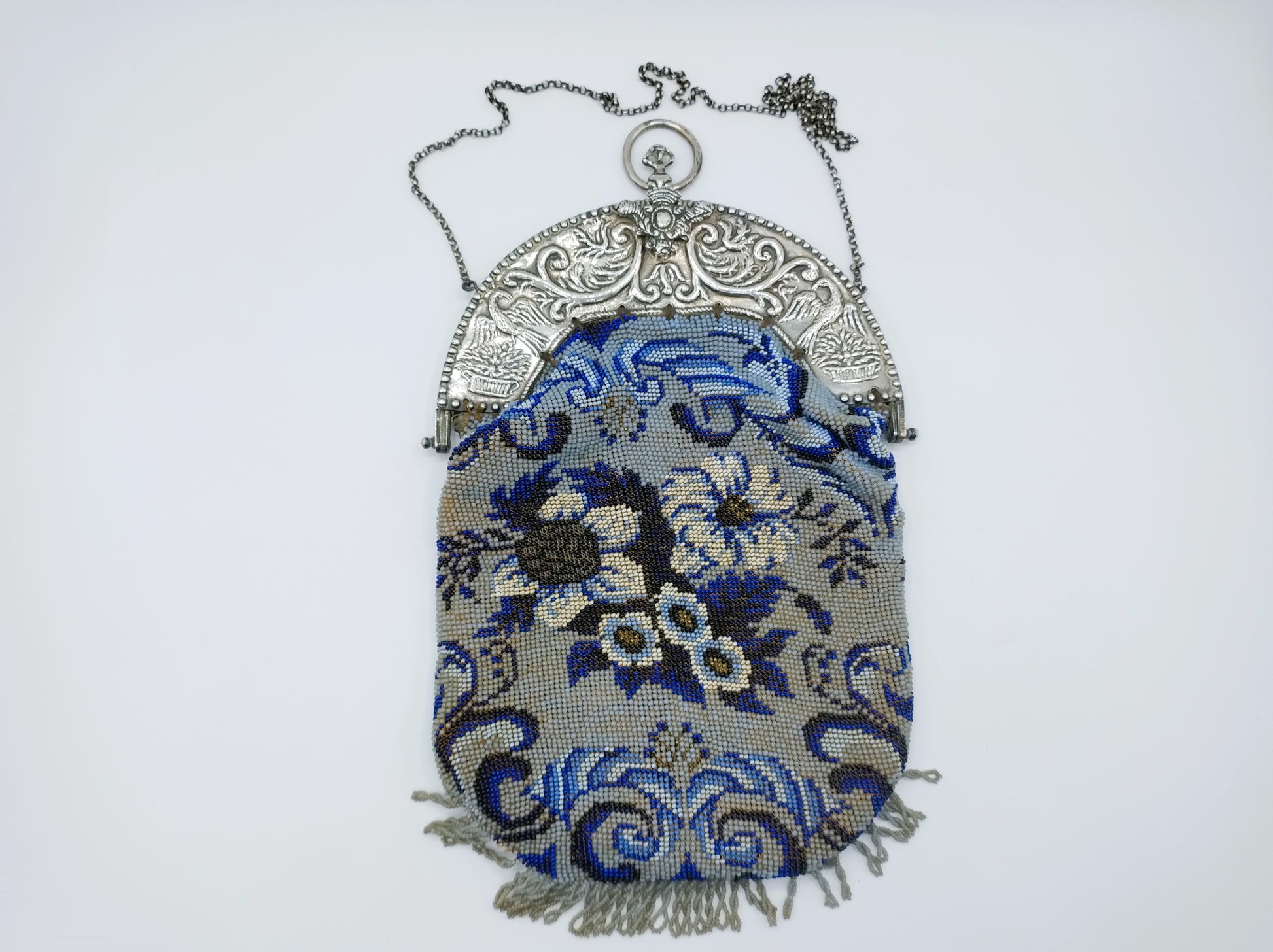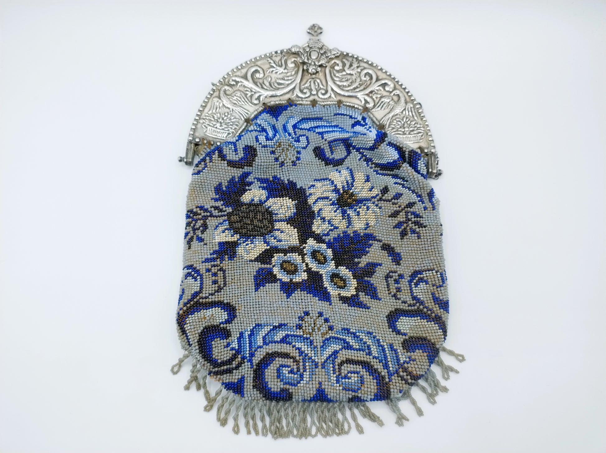 The bracket is beautifully embossed with curl decoration and two birds on either side. The beaded bag is decorated with flowers. Beautiful piece of handicraft.