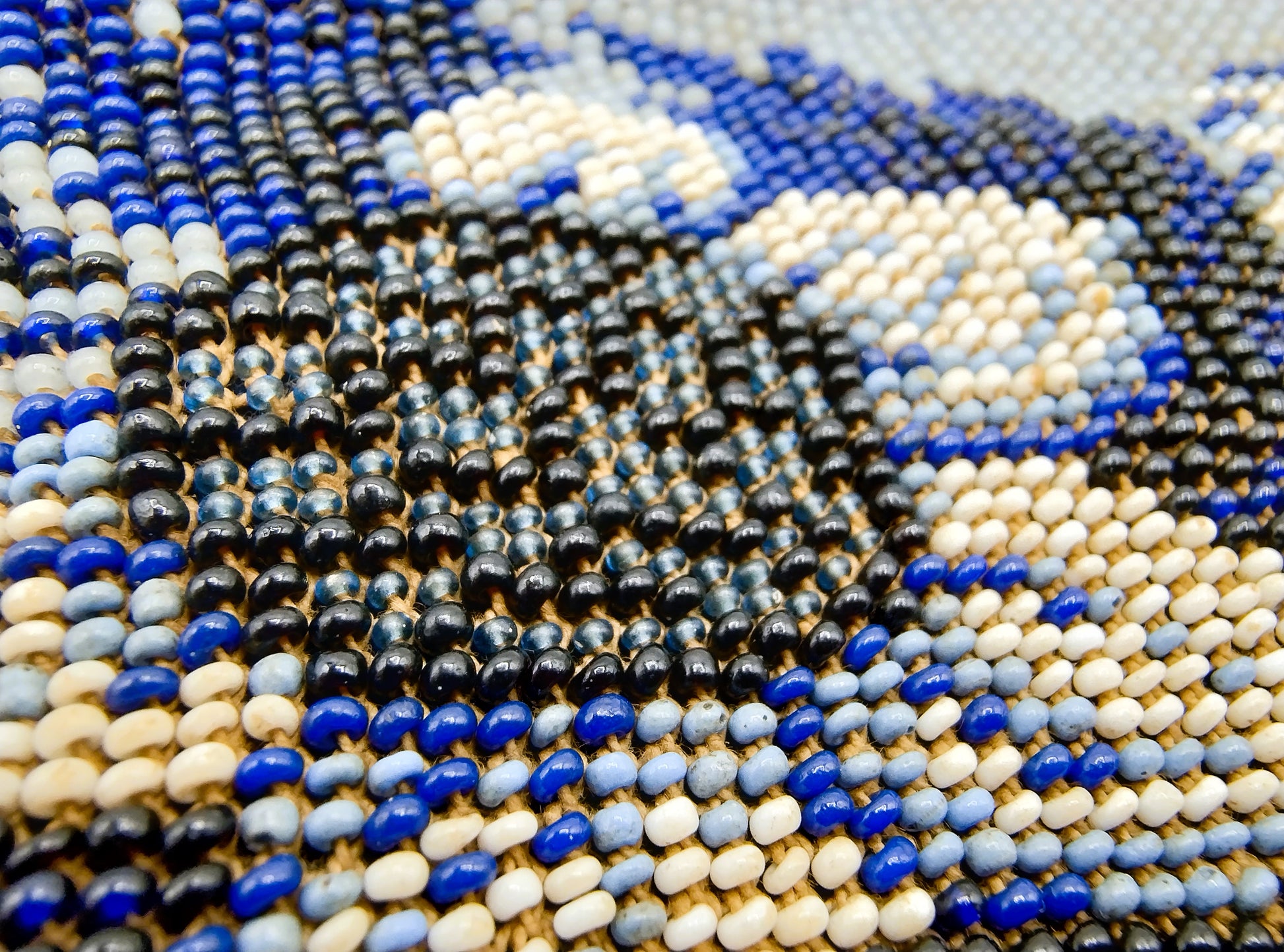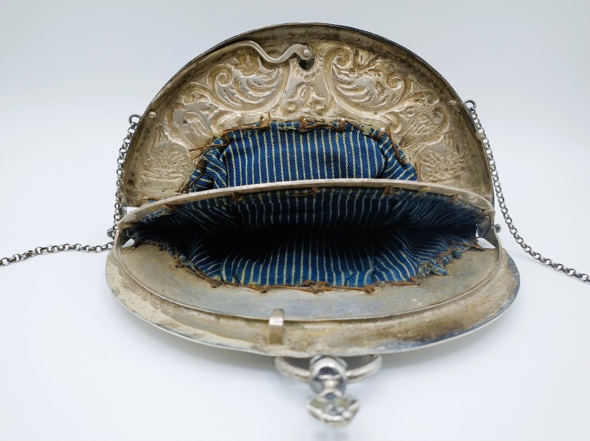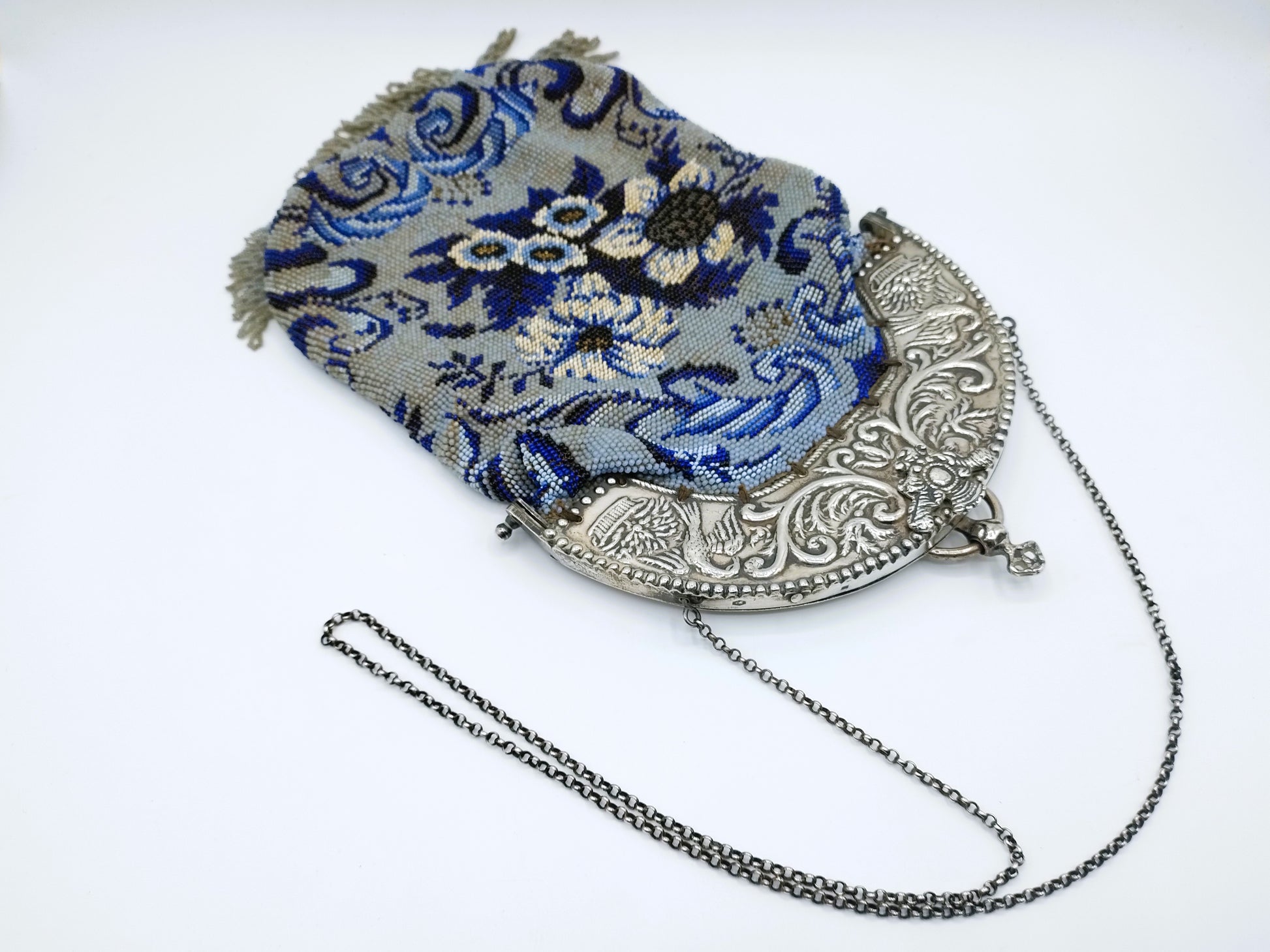 The bracket is beautifully embossed with curl decoration and two birds on either side. The beaded bag is decorated with flowers. Beautiful piece of handicraft.