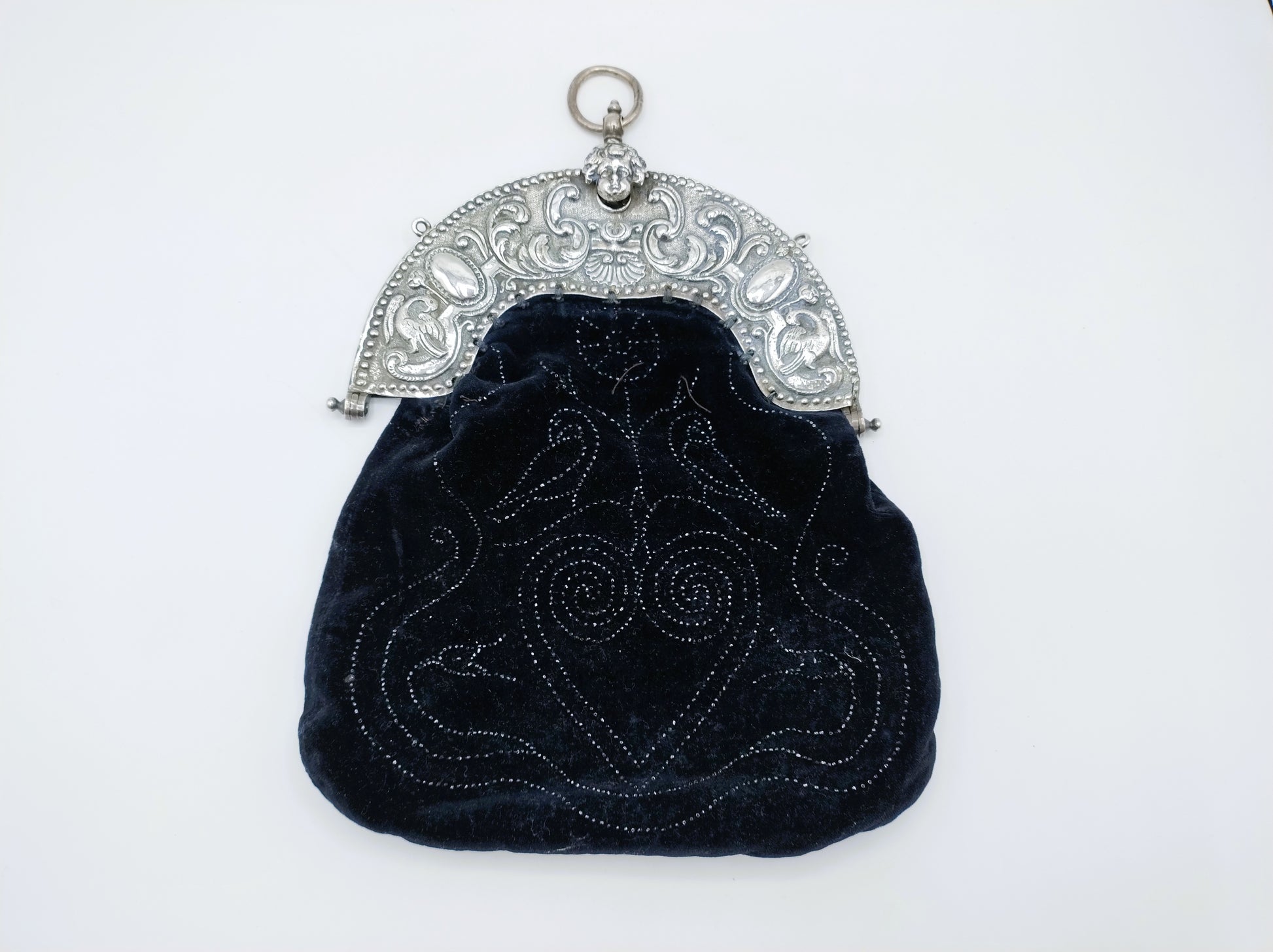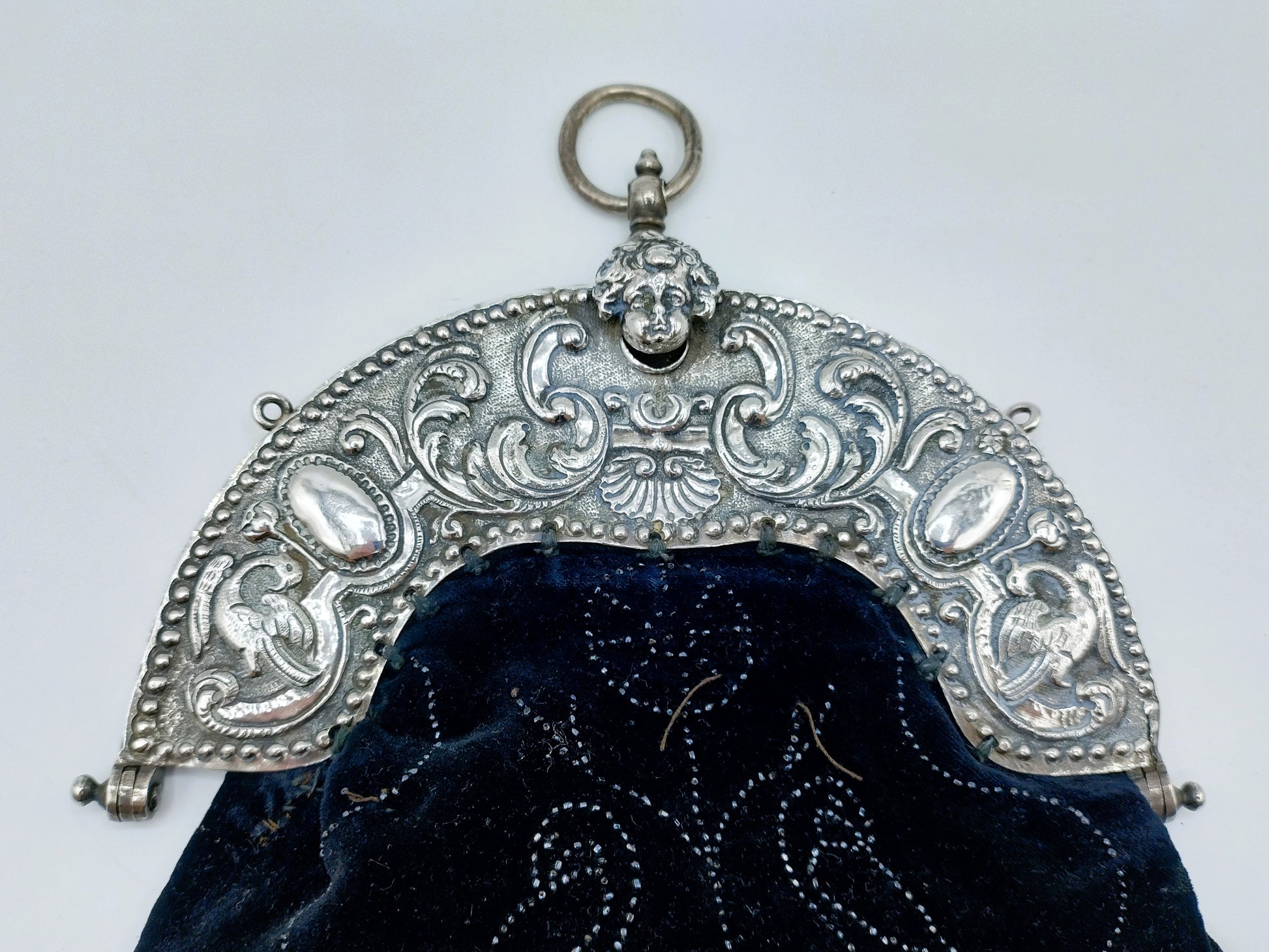 The bracket is beautifully embossed with curl decoration and two birds on either side. These birds also appear on the bag. The closure consists of a child's head.