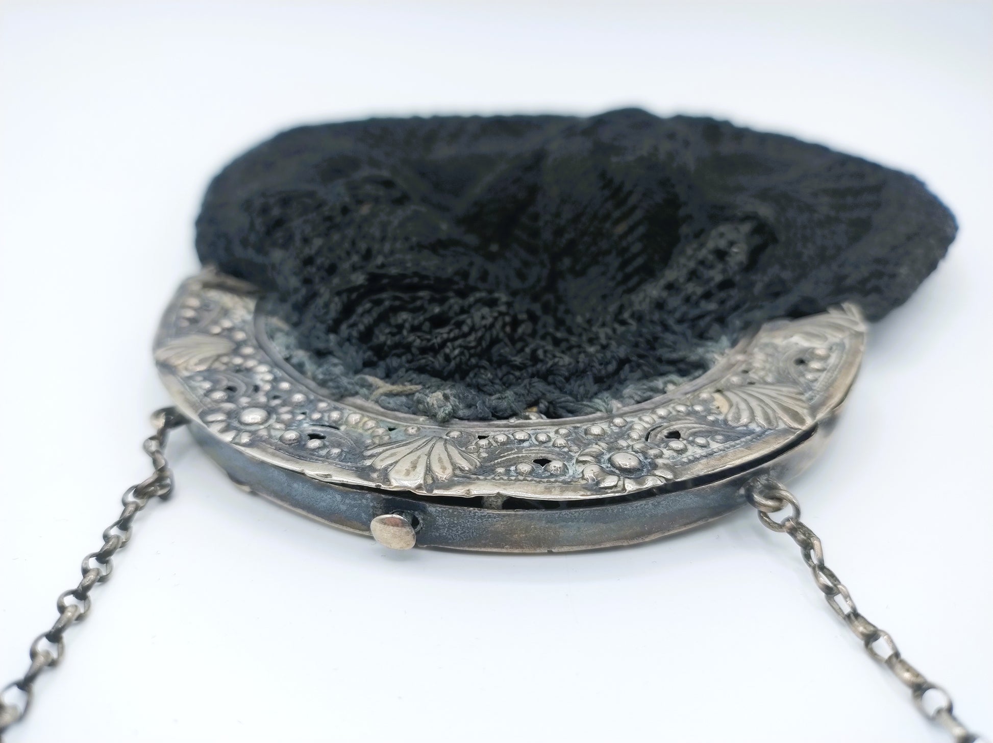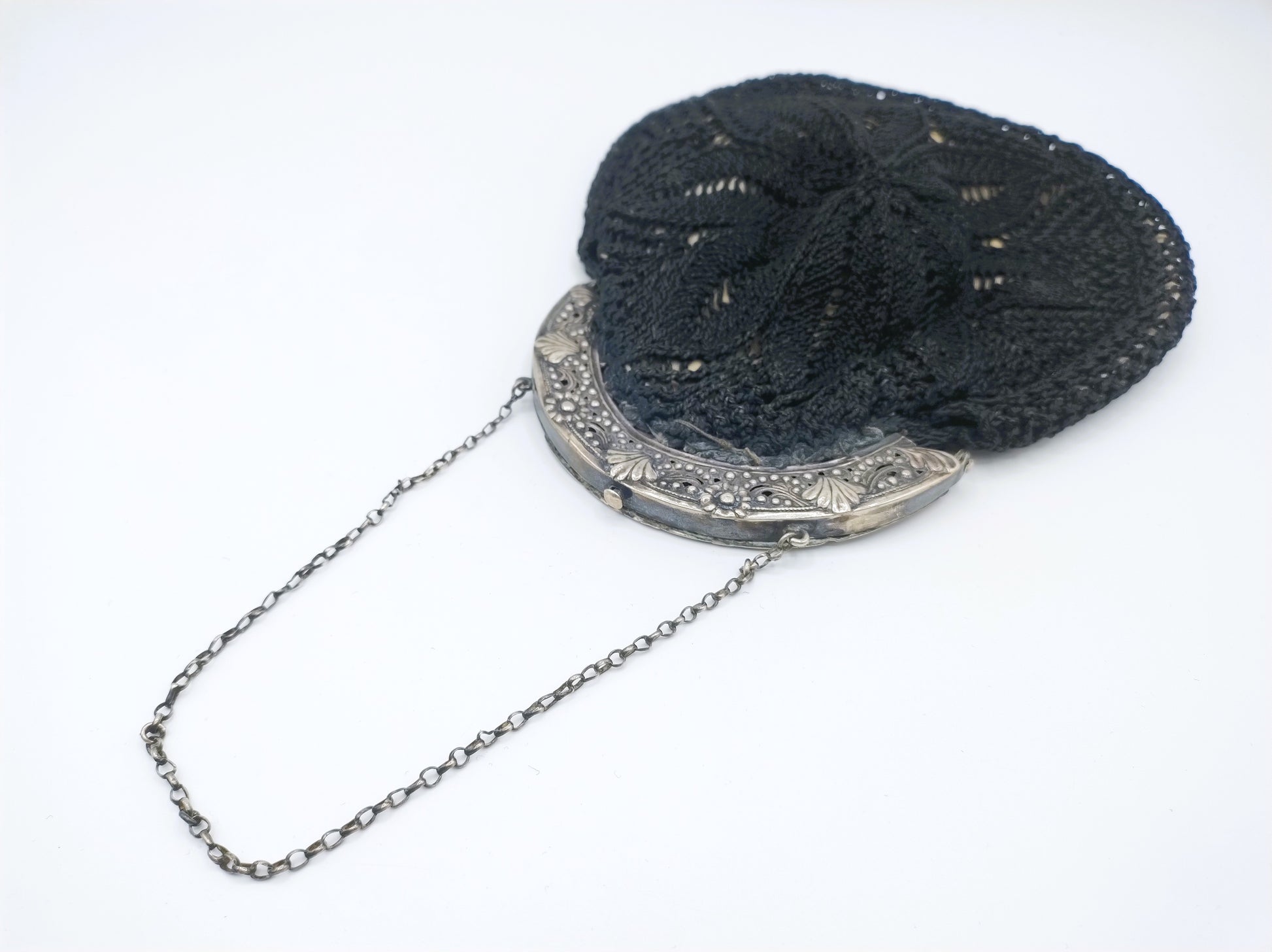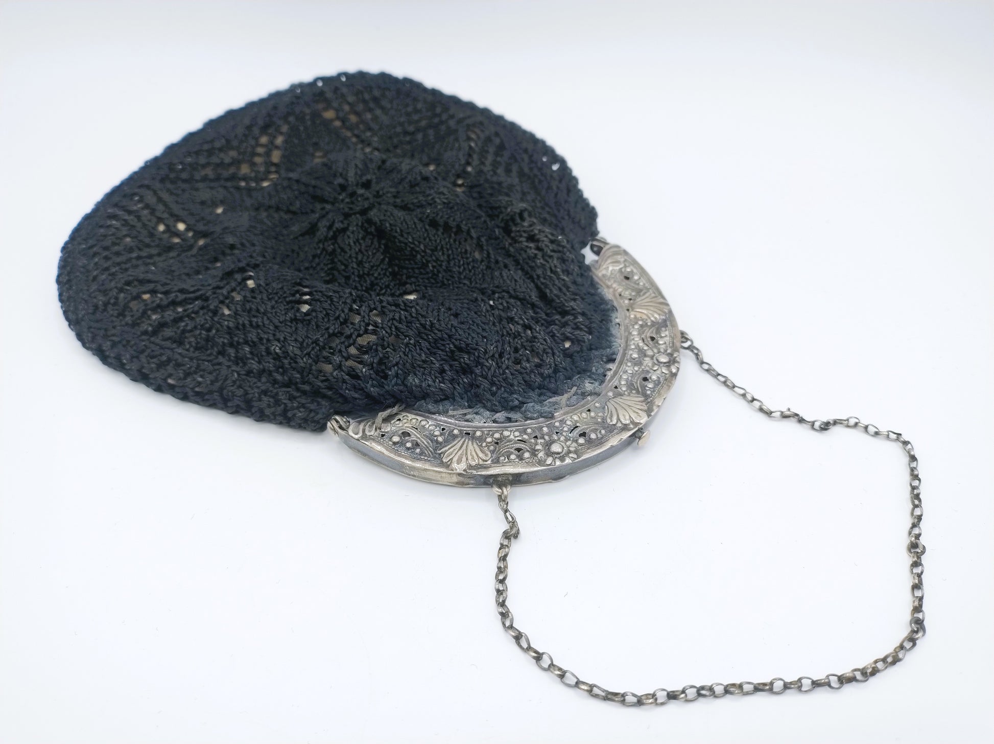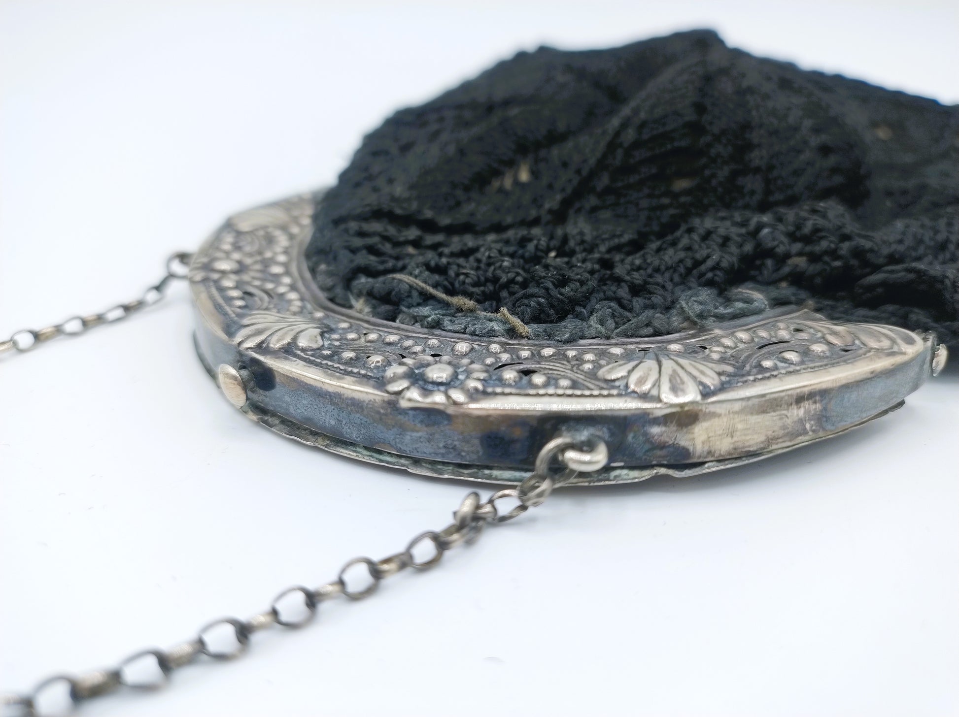Silver purse bracket on a fabric bag with crocheted motif and a jasseron chain attached to it.