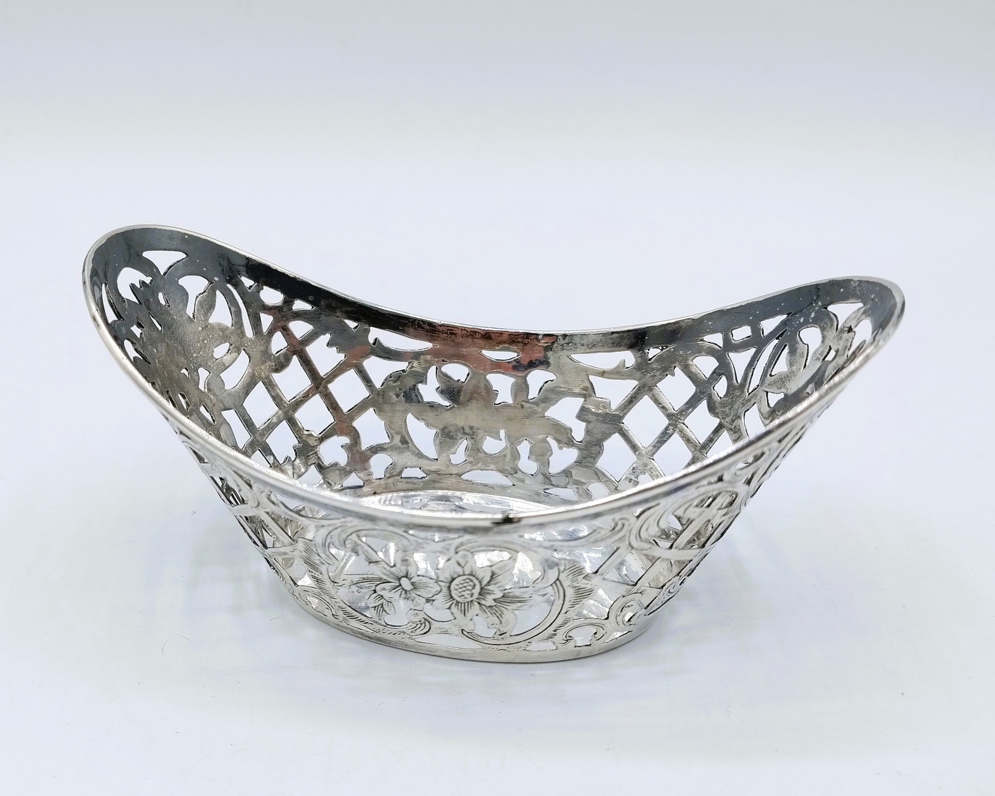 The basket is openwork and features floral and curlicue motifs.