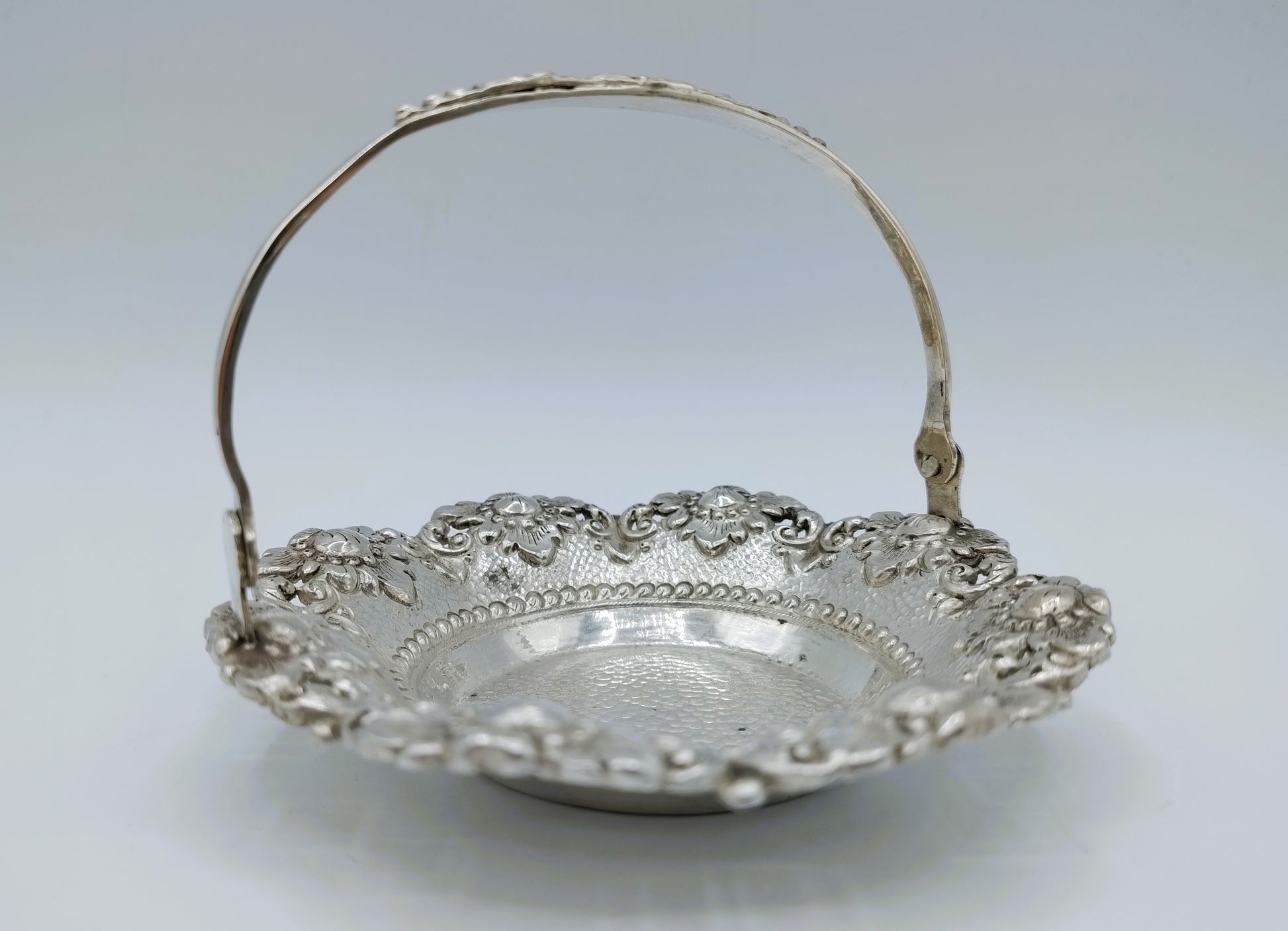 Djokja silver chocolate bowl with flower decoration from Indonesia. Dating approximately 1900-1930.