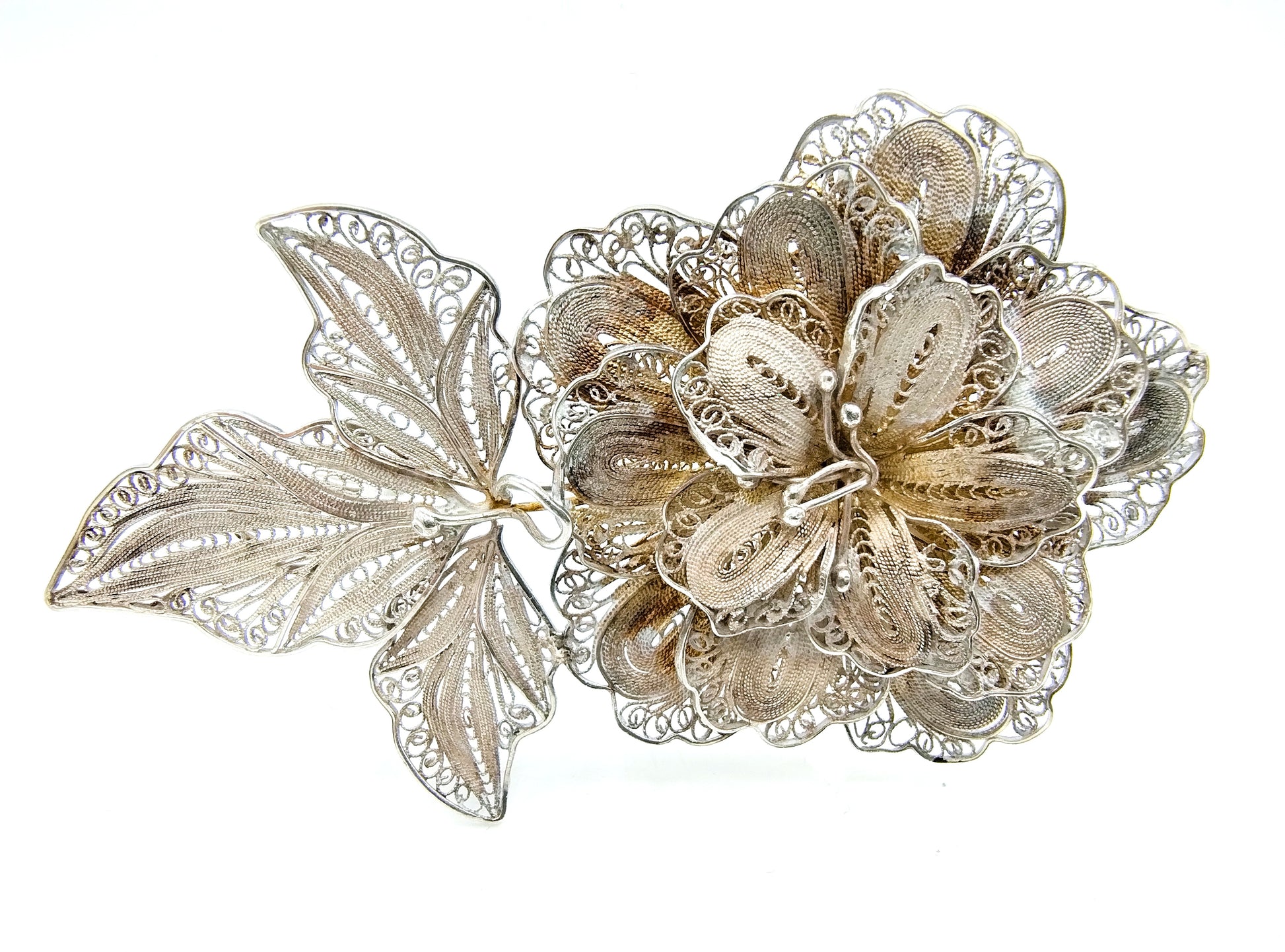 The pin is slightly bent. Not hallmarked, as is often the case with filigree silverware.