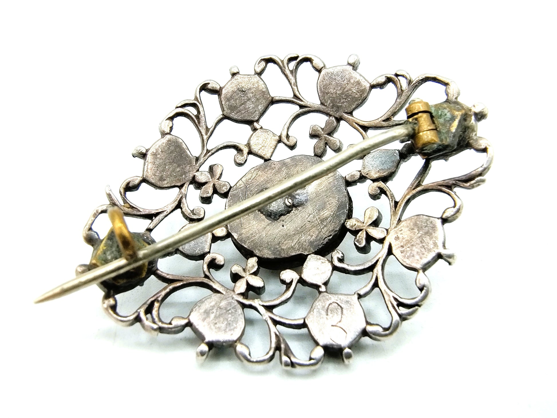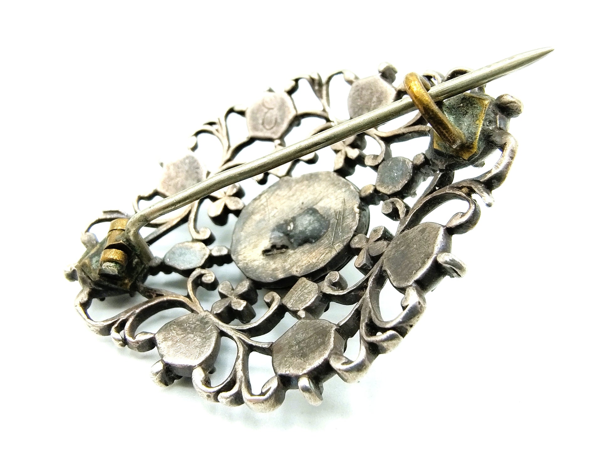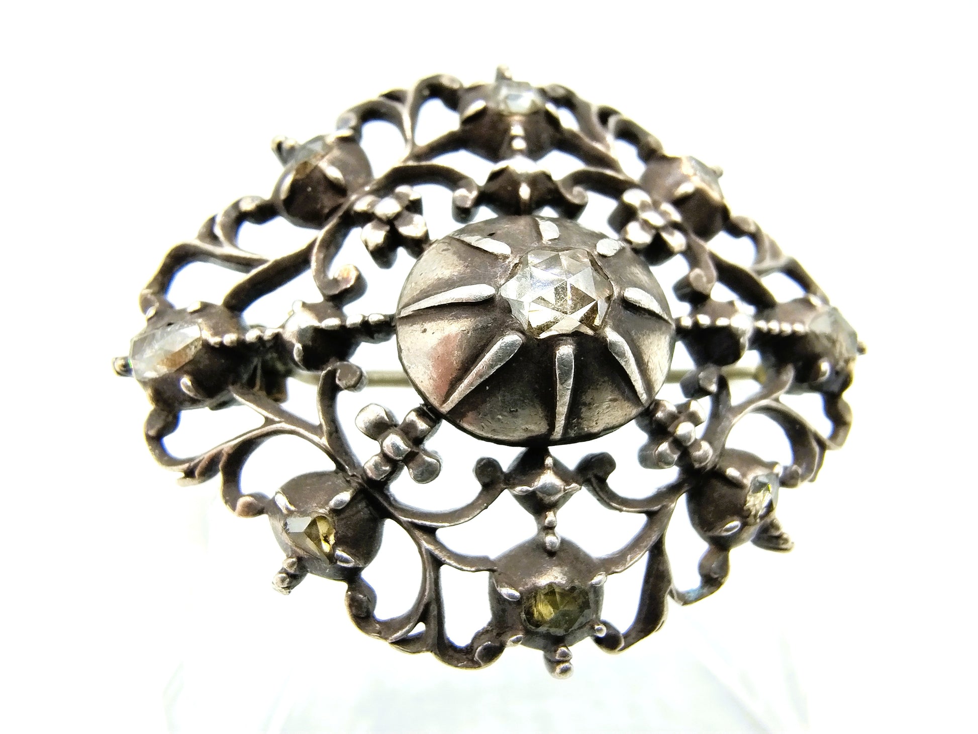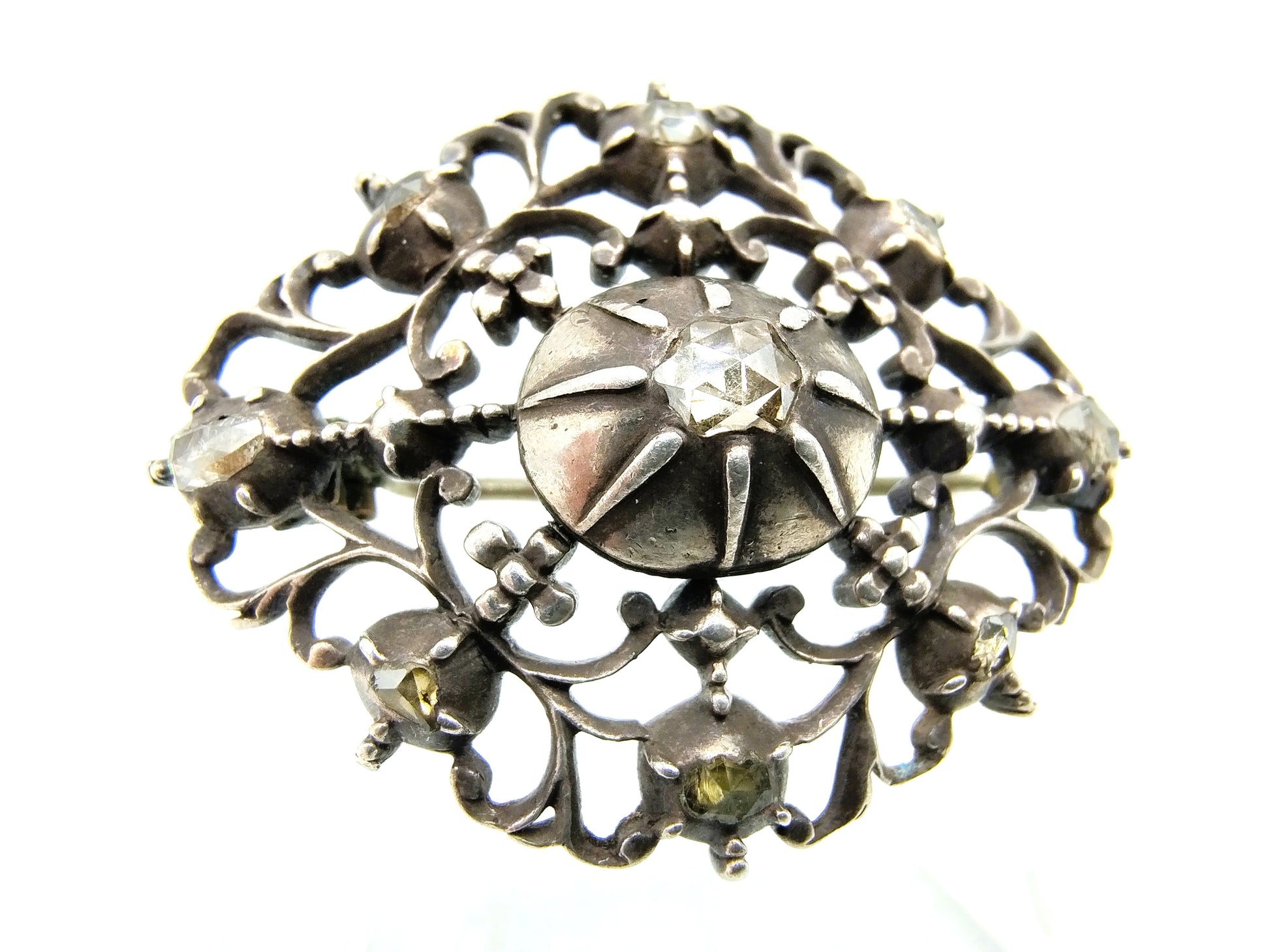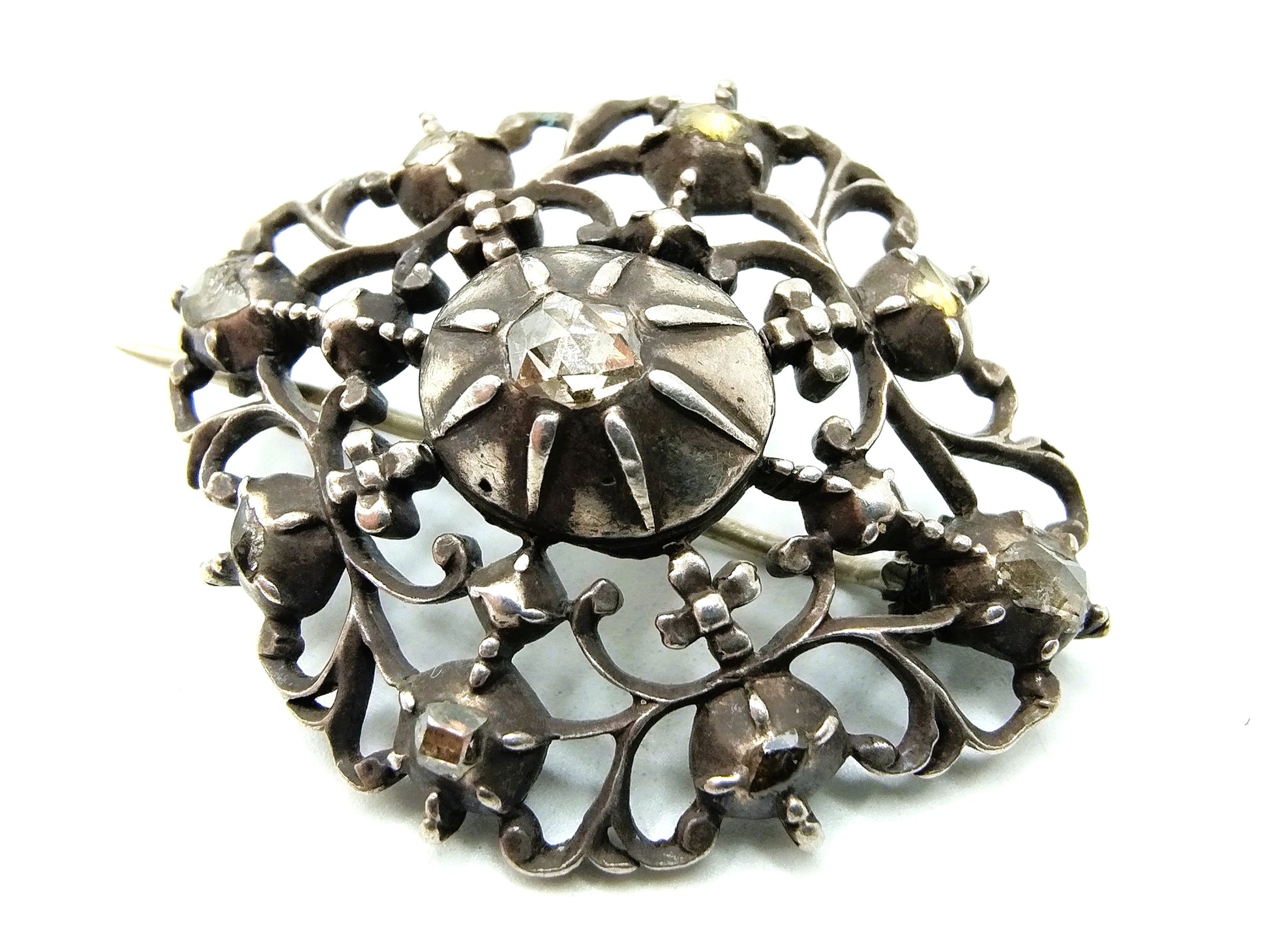 Silver brooch set with 9 rose cut diamonds in a closed setting.