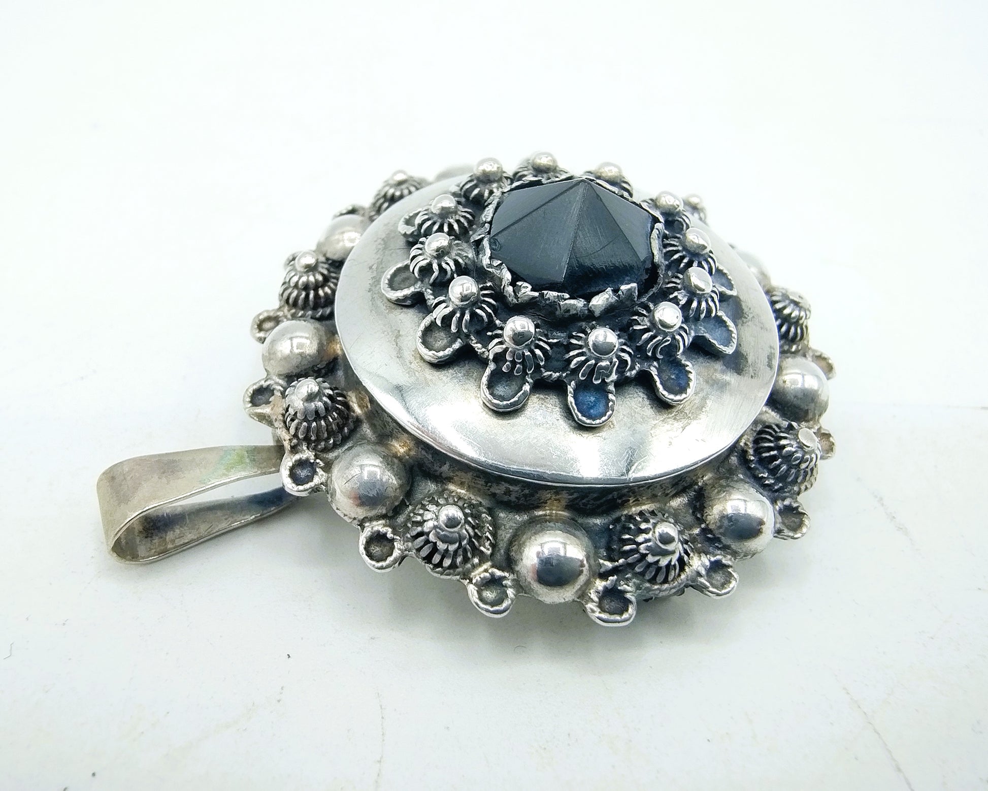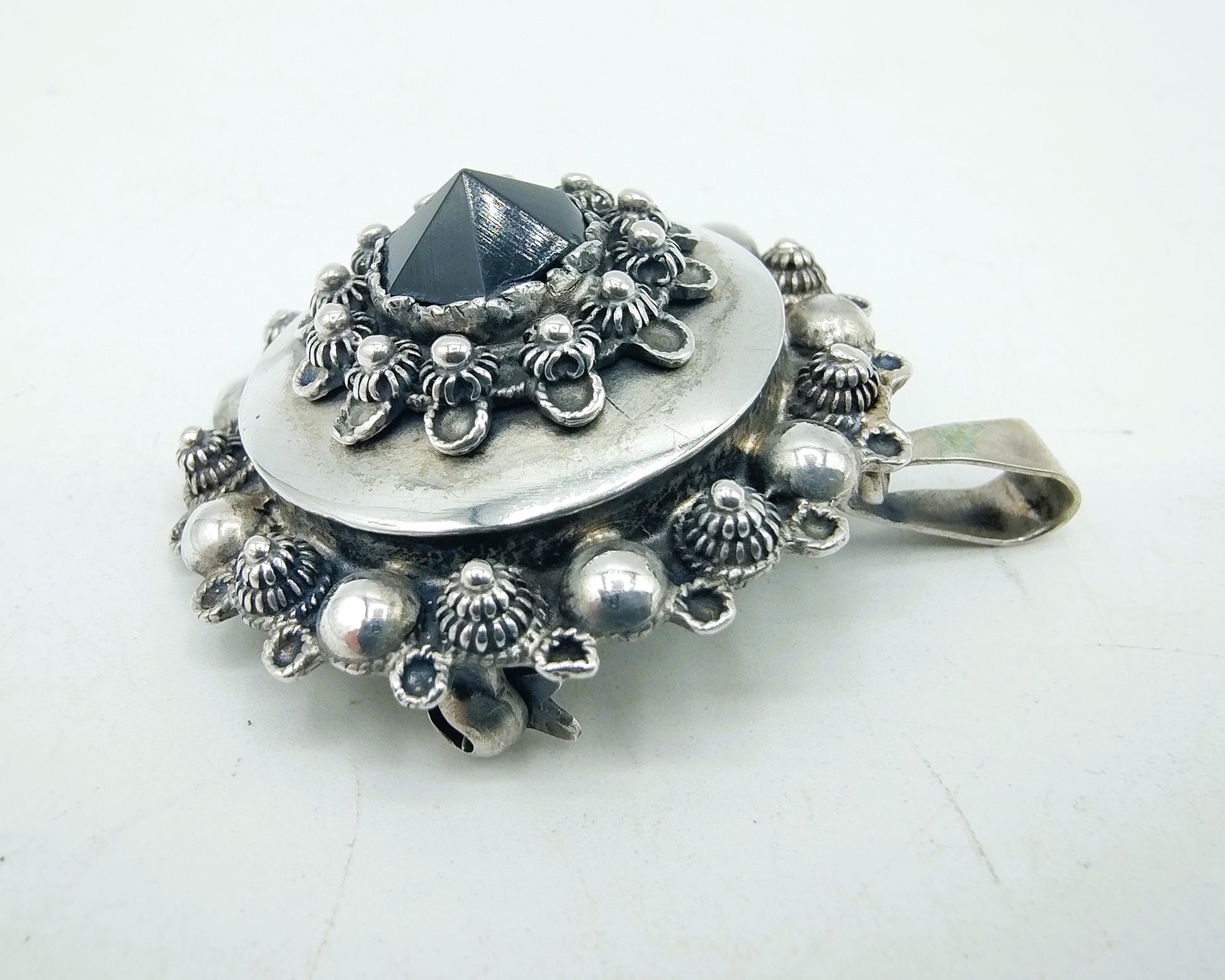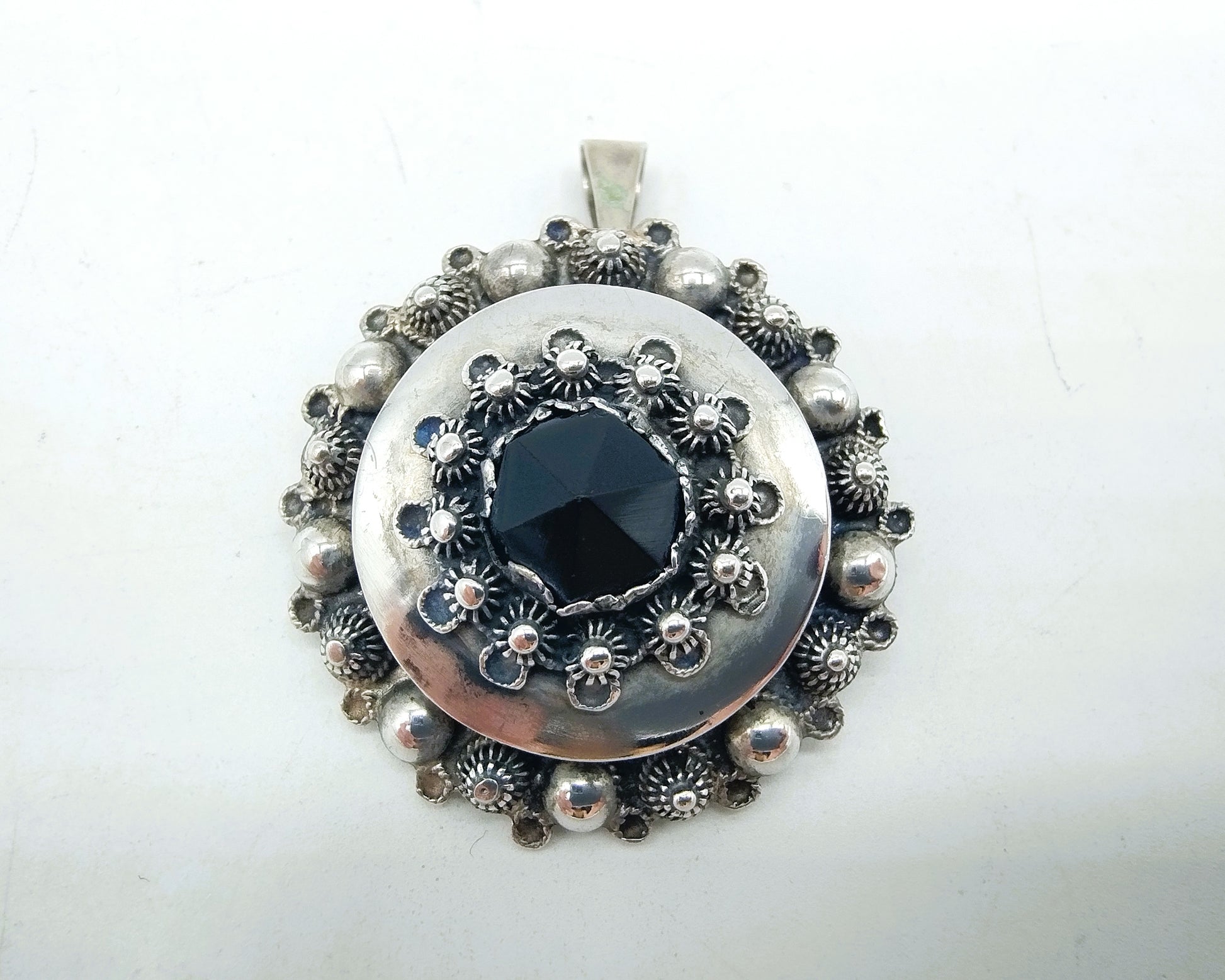 Silver brooch that has been converted into a pendant. The brooch is set with Zeeland buttons all around and in the middle a cut jet with a diameter of 1 cm.