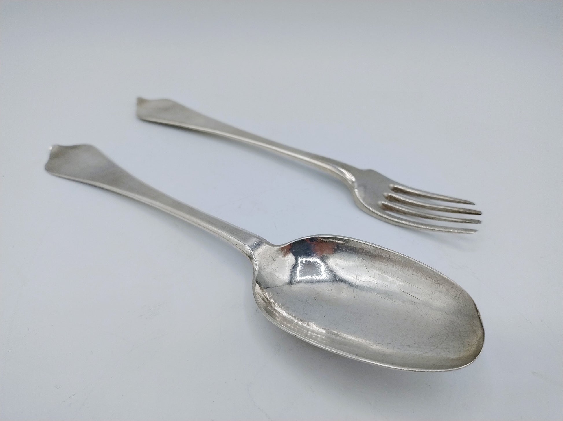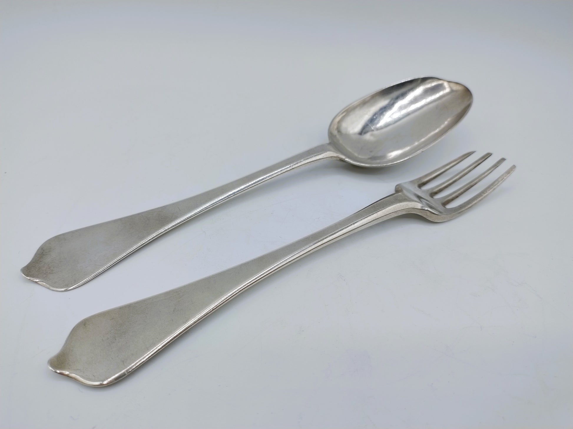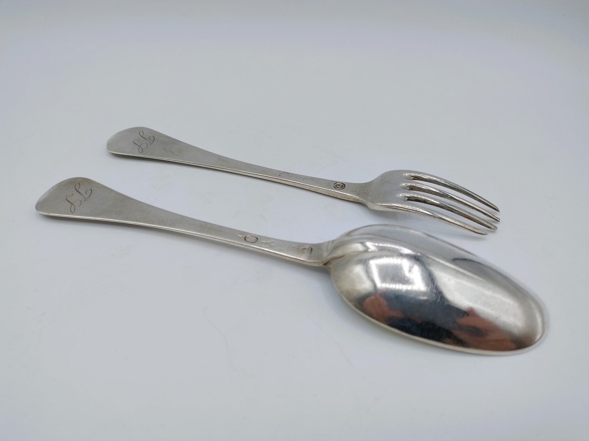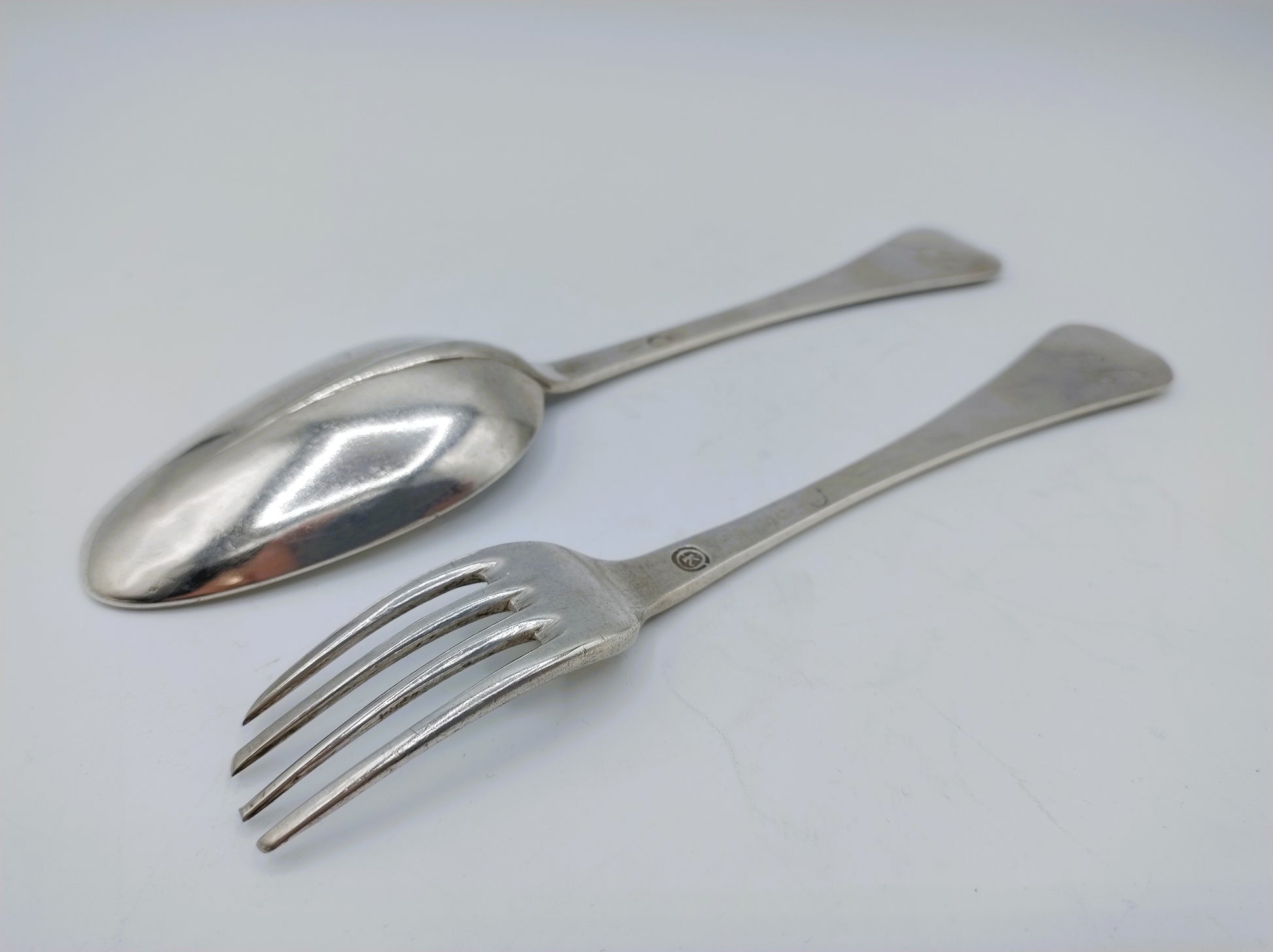 Silver cutlery consisting of a fork and a spoon, made by the Rotterdam silversmith Cornelis van der Kaa. He worked between 1710 and 1738.