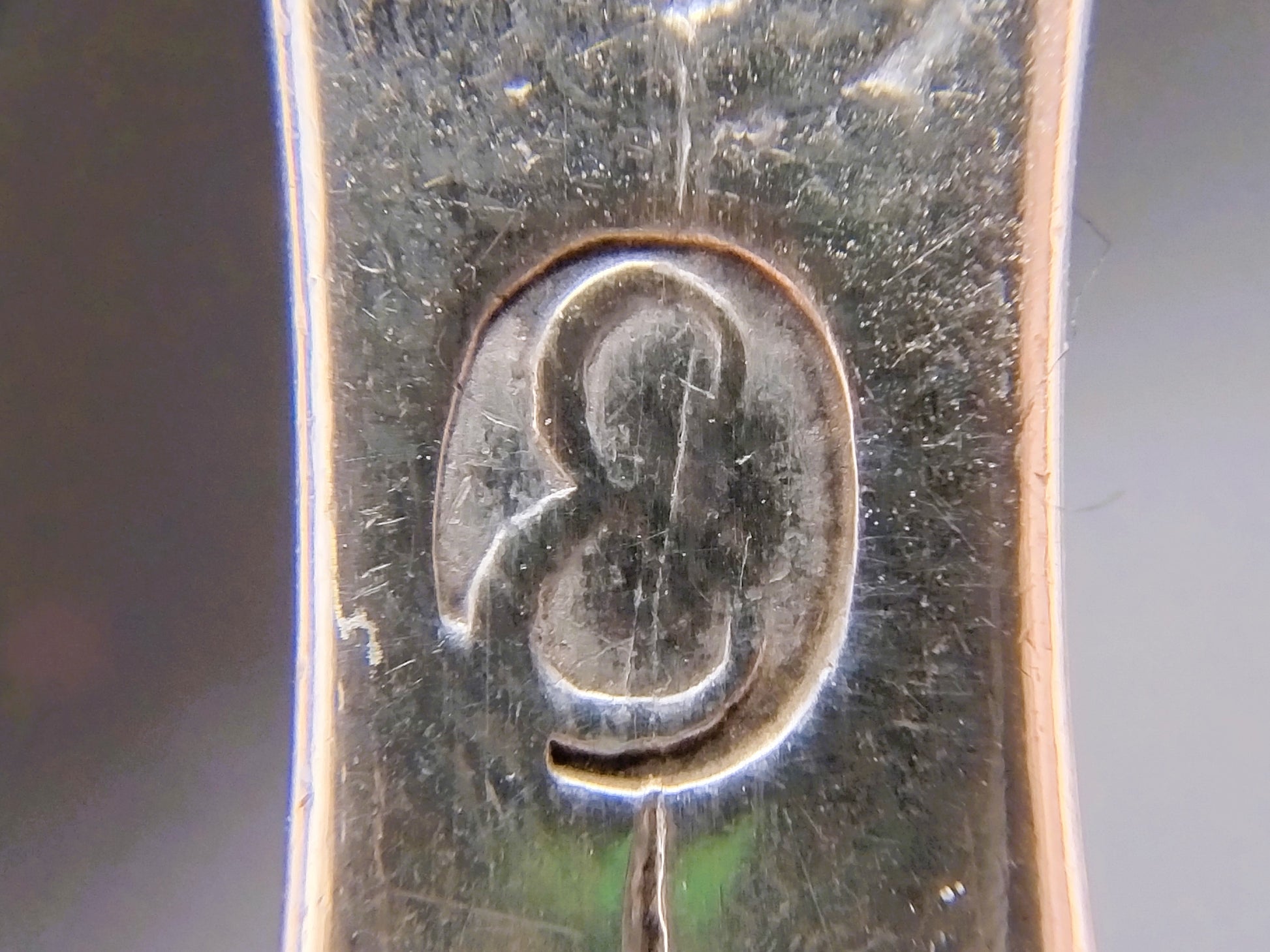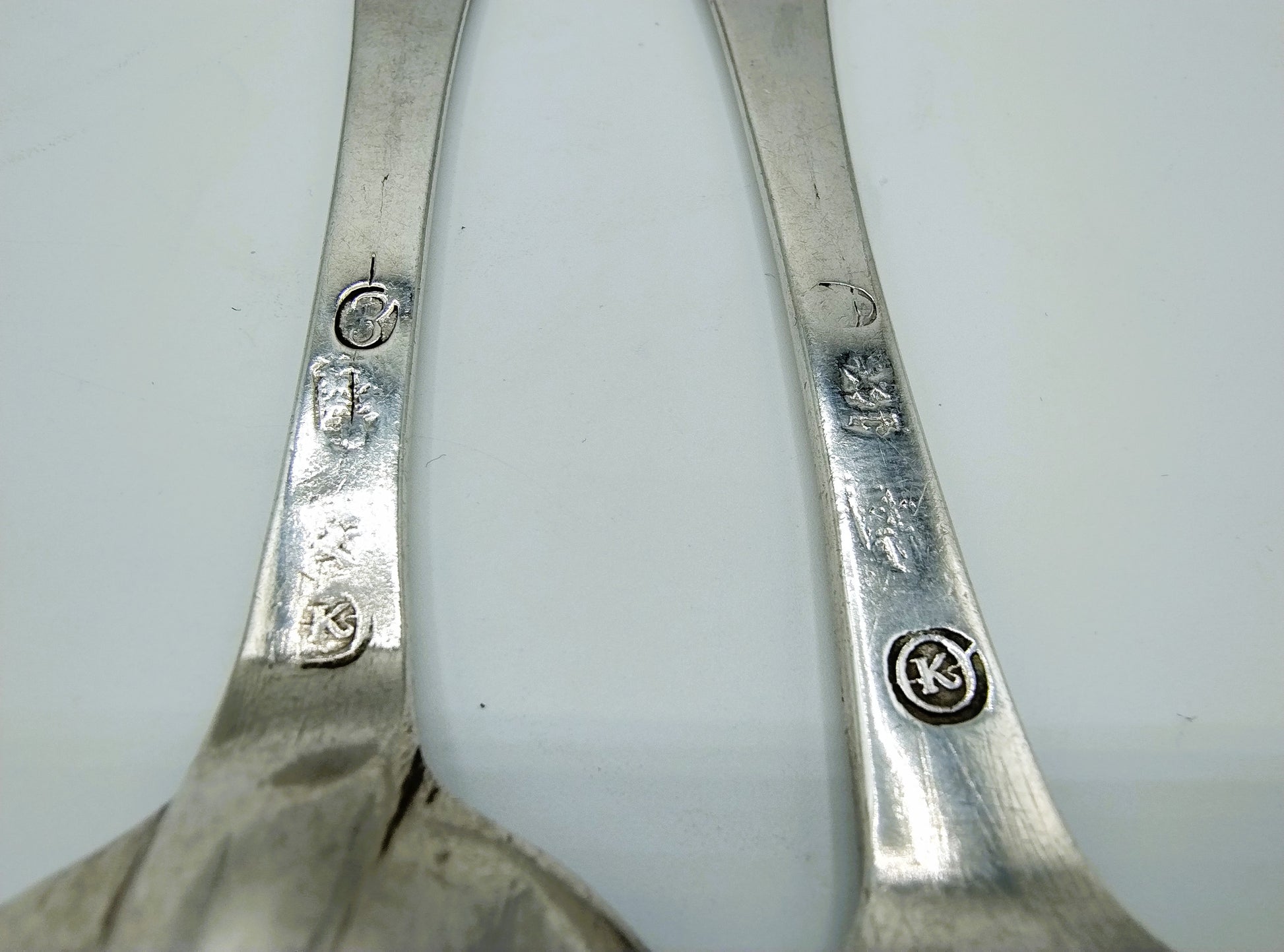 The cutlery is marked with his master's mark K in a circle, the Rotterdam city mark, a climbing lion, and the date letter E for 1715.