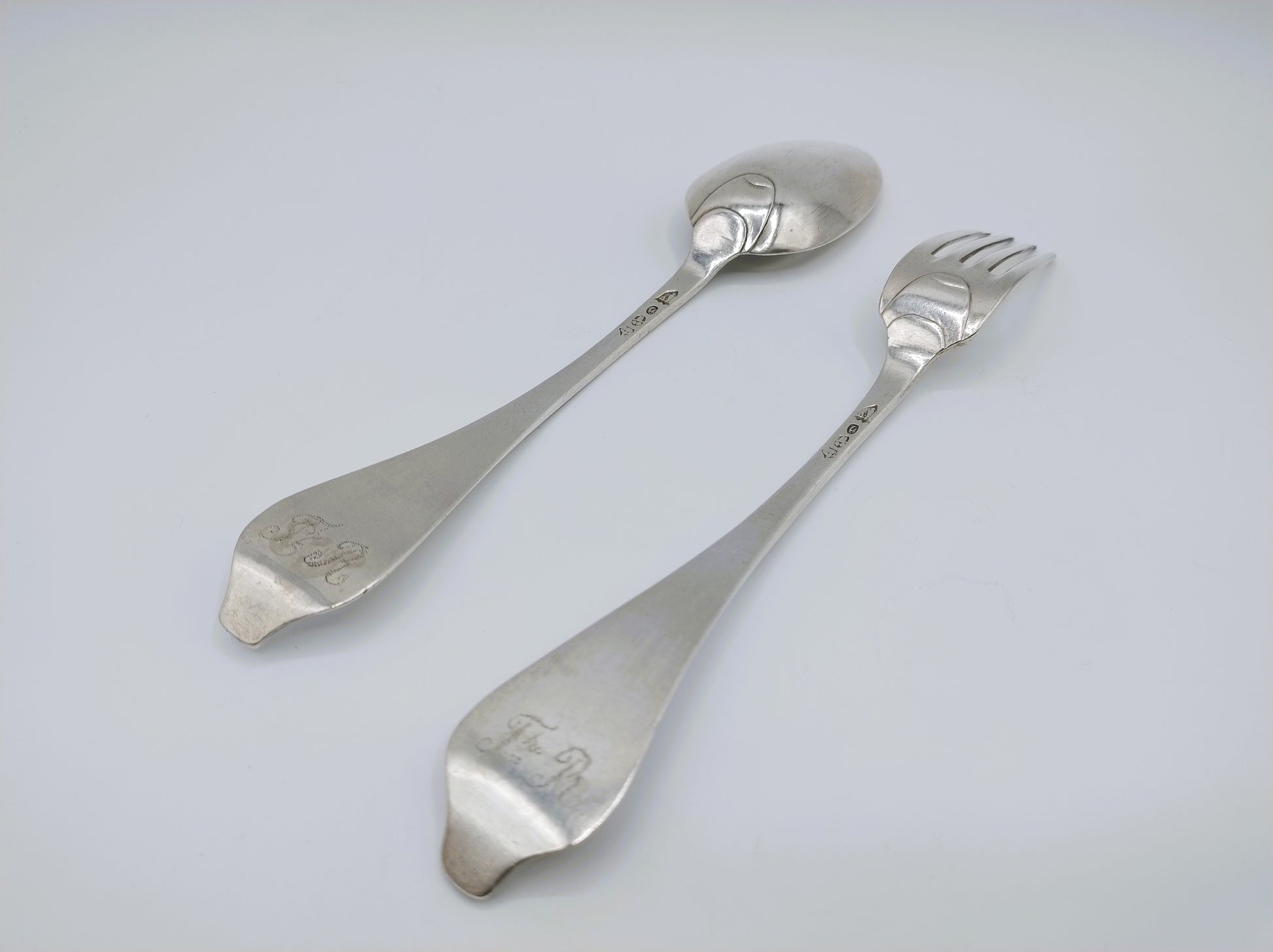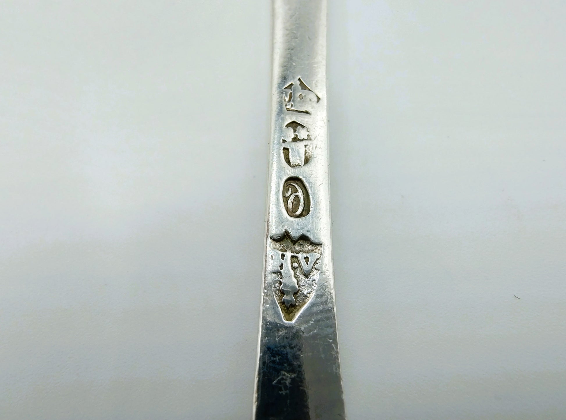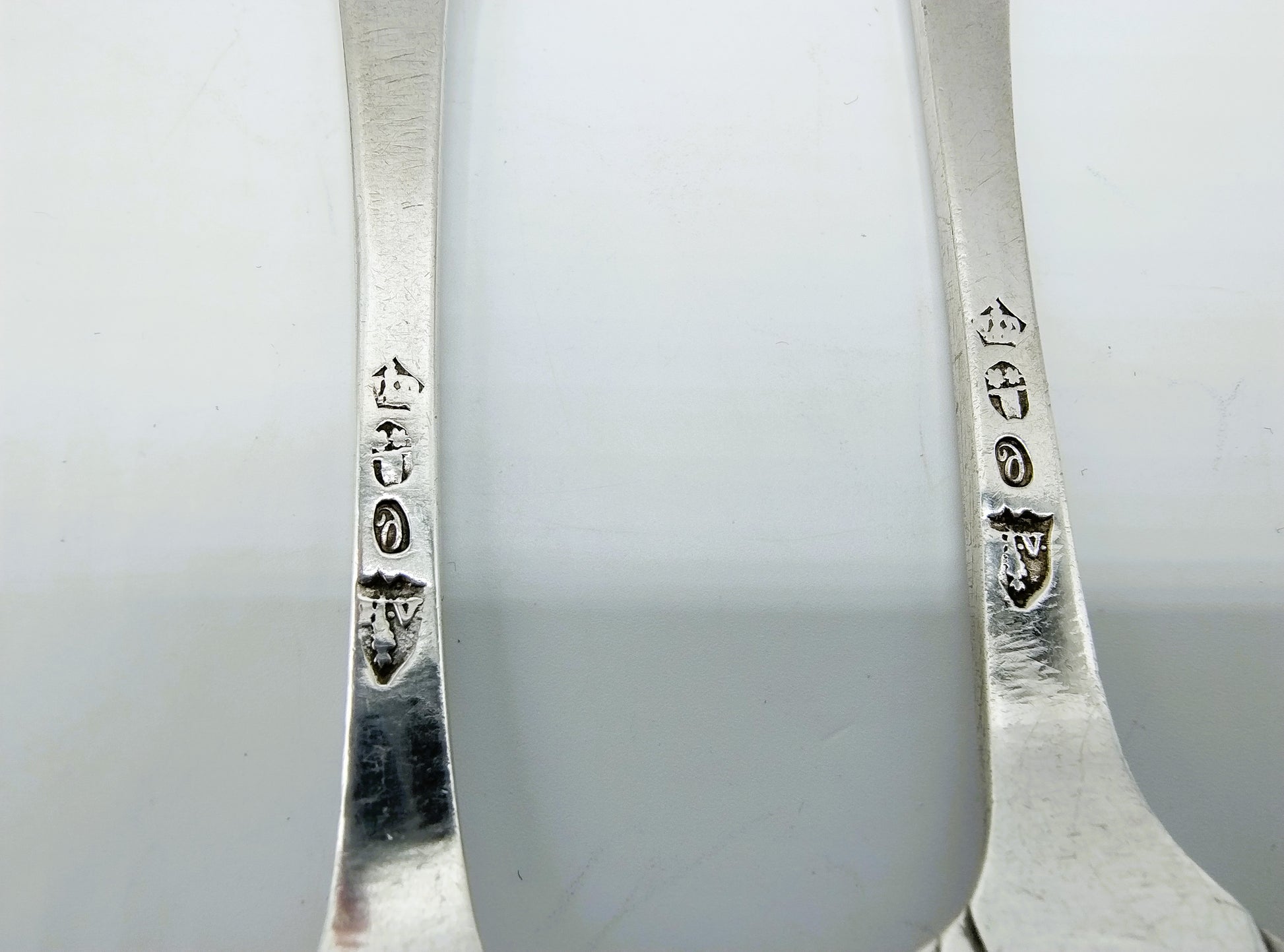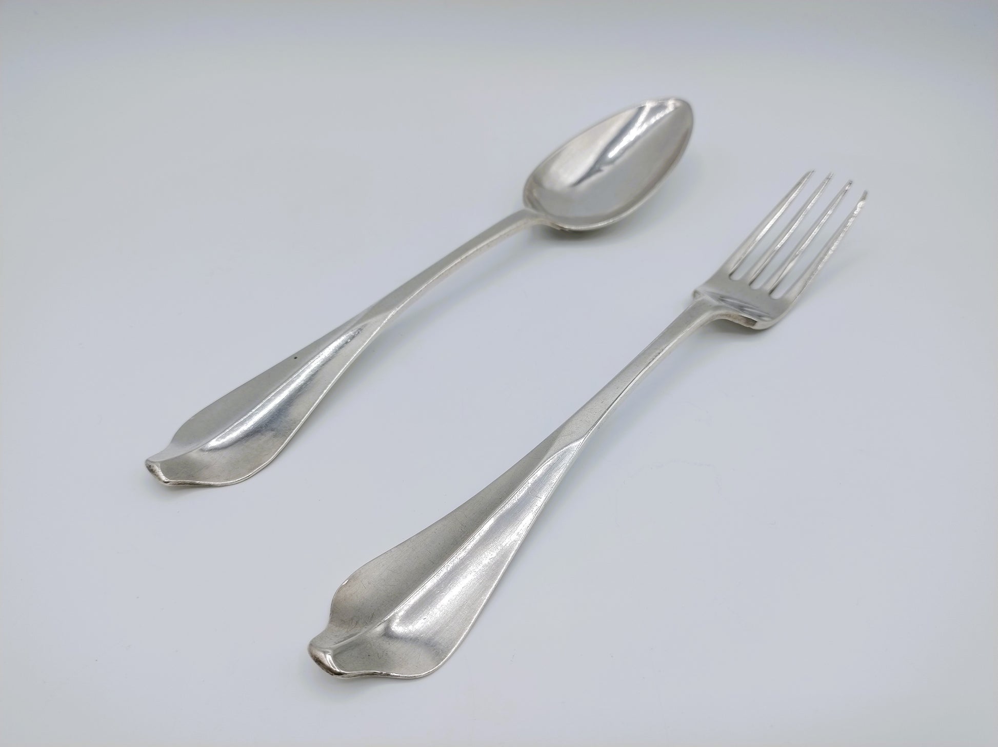 The cutlery is hallmarked with the master hallmark HV star, city hallmark Rotterdam, crown as a purity hallmark for 934/1000 and date letter d for 1811. (French period)